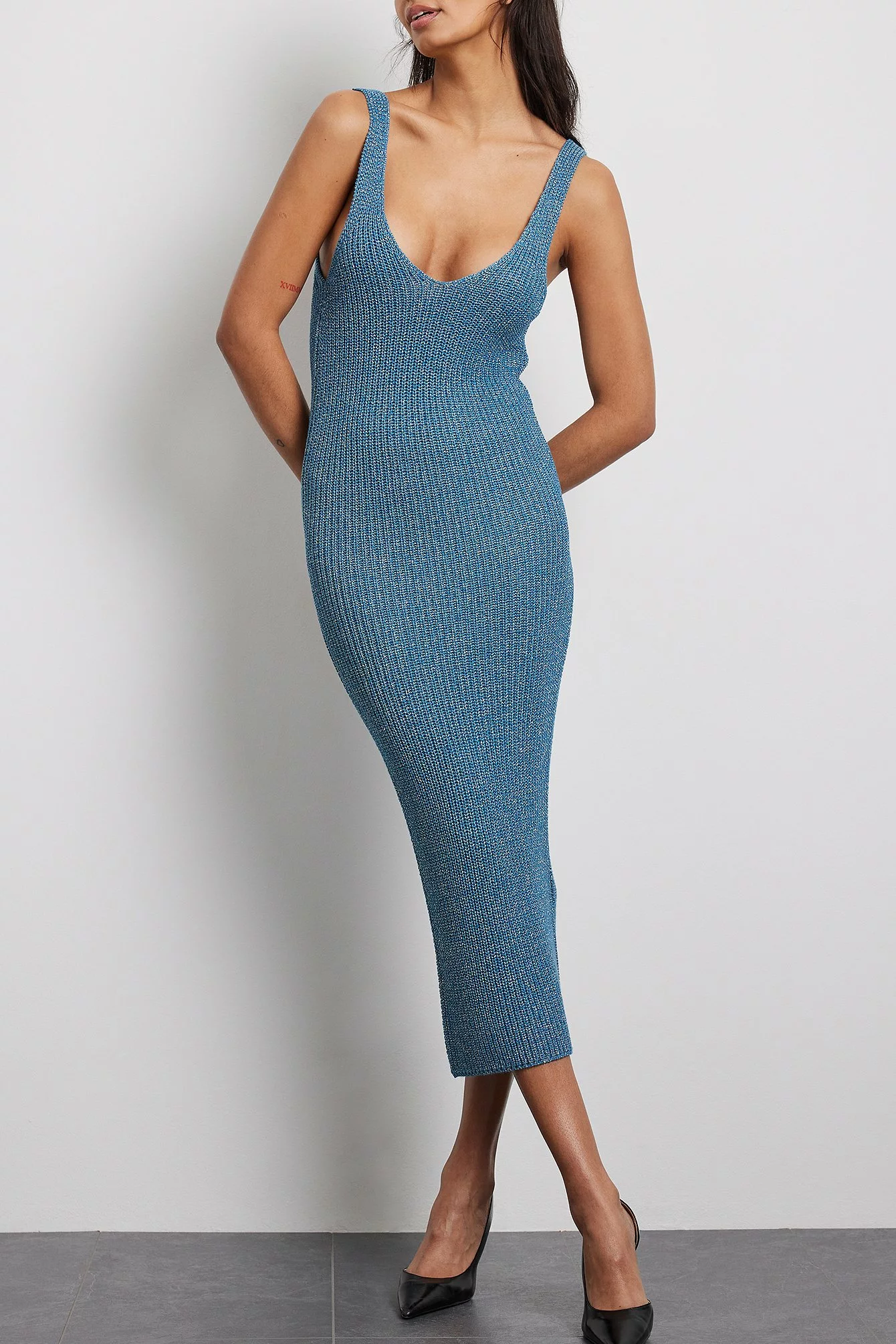 This midi dress is knitted and features a v neckline. It has non adjustable shoulder straps and a glittery design.