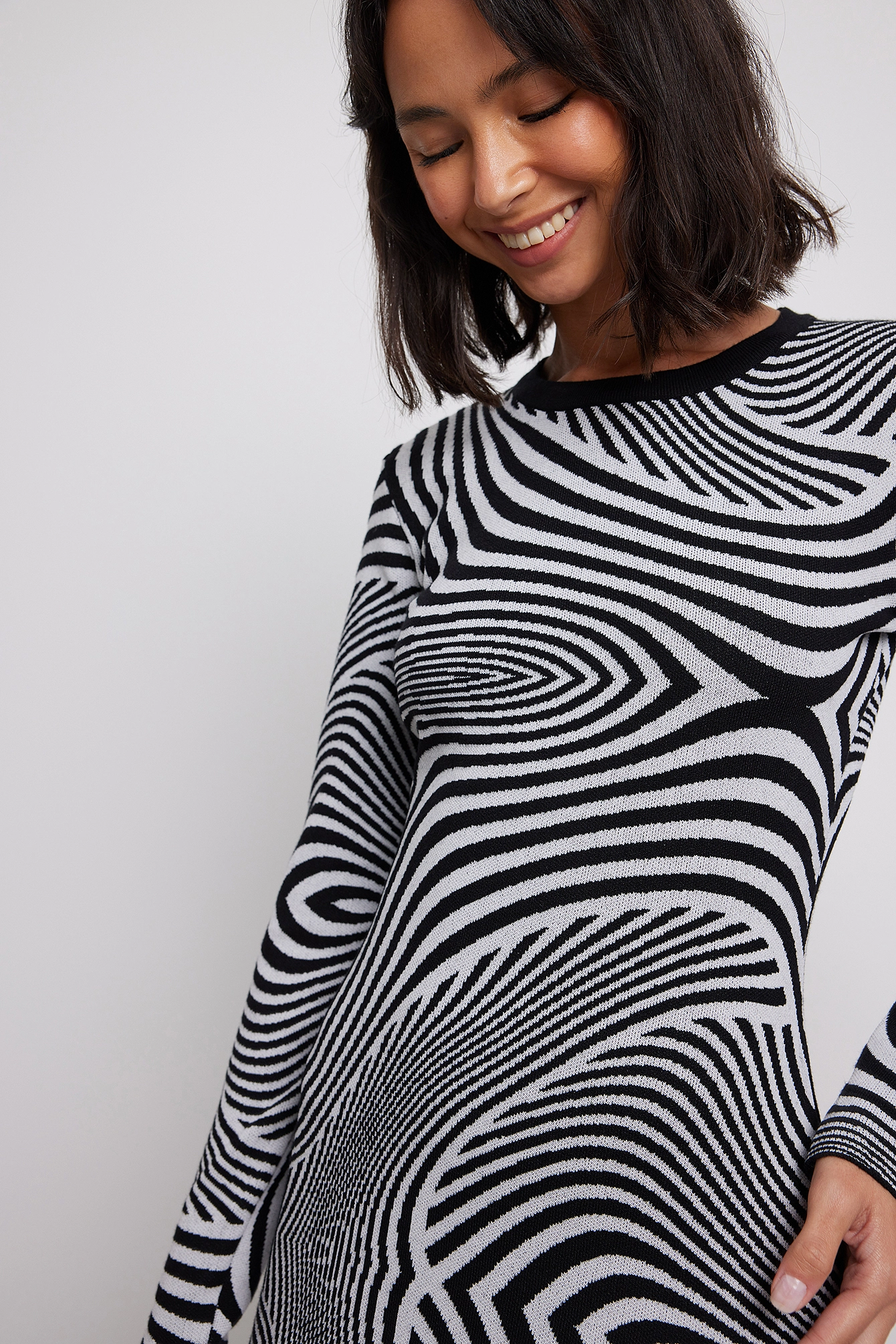 This mini dress is jacquard patterned and features a crew neckline, a long sleeve and a bodycon fit.