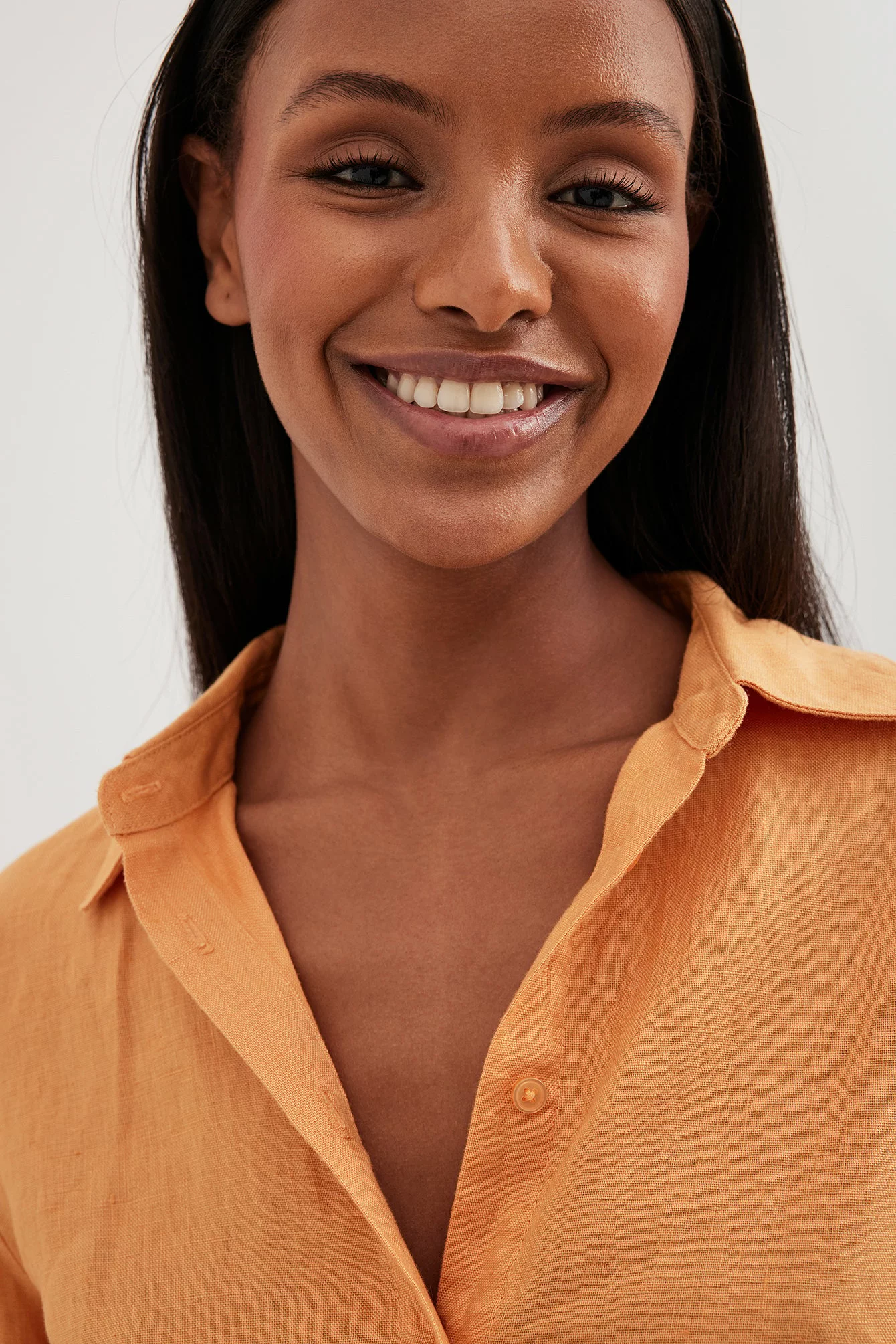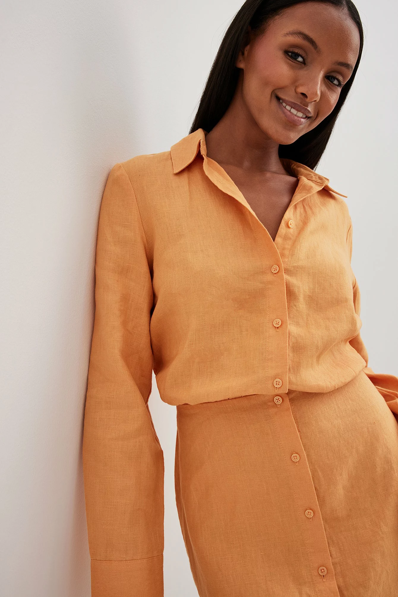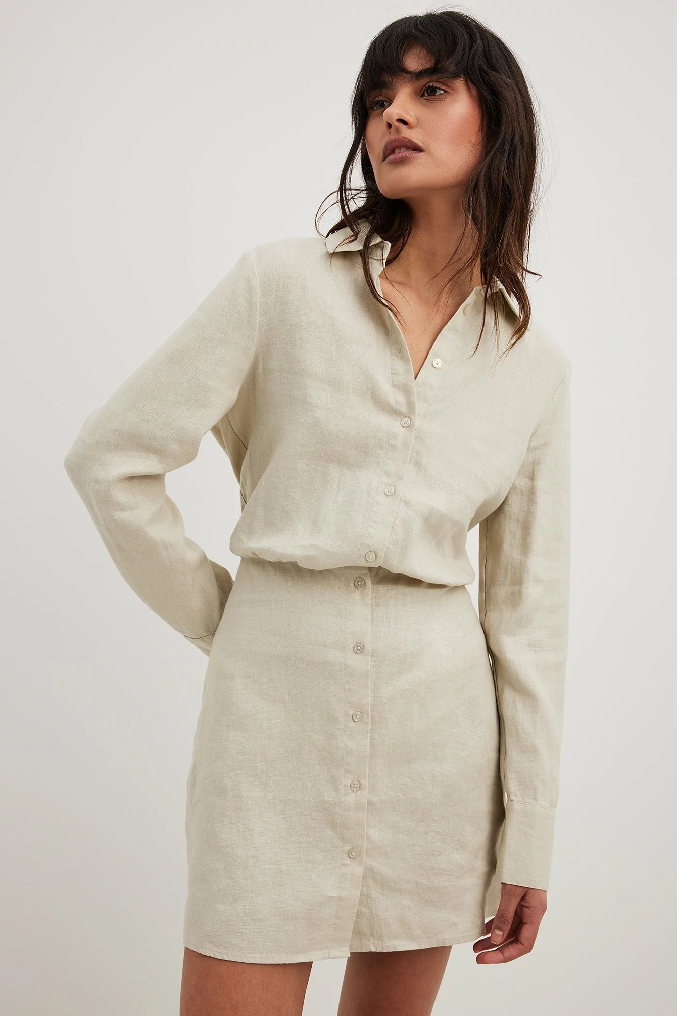 This mini dress is made of linen and features a shirt collar. It has a button closure and an elasticized waist. This mini dress features long sleeves with double button cuffs.