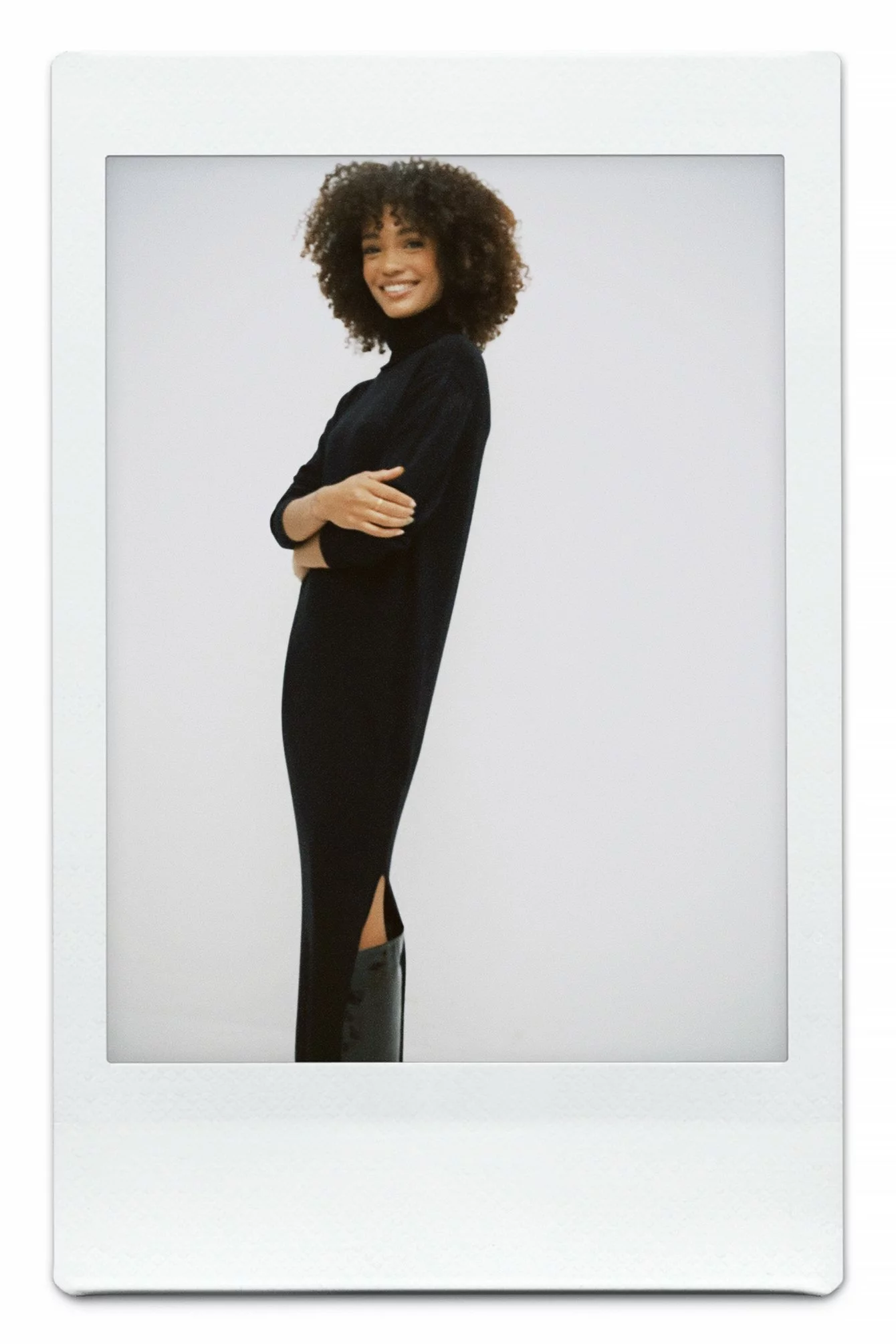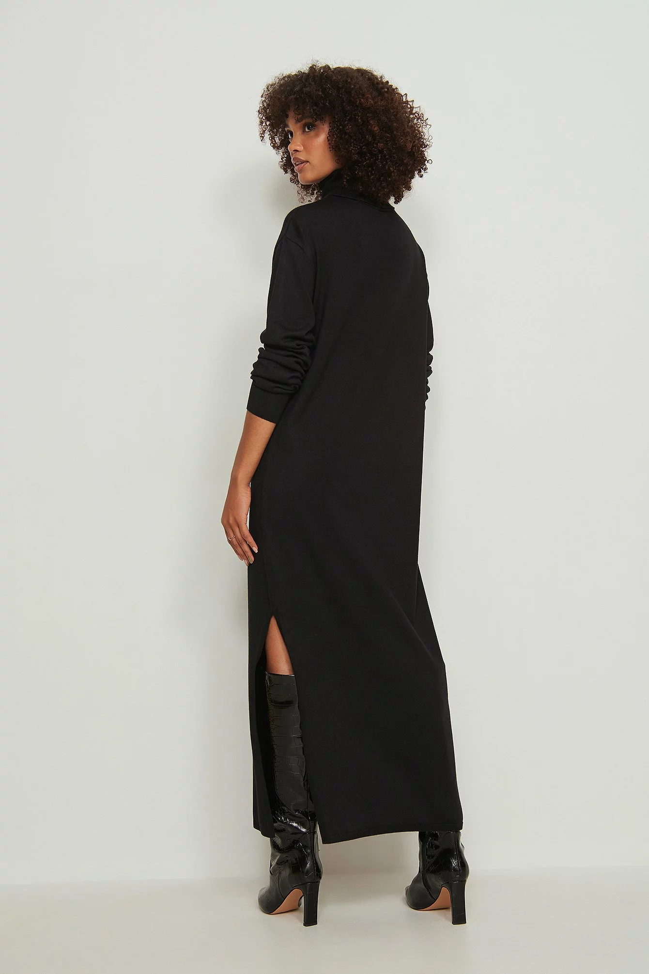 This midi dress is long-sleeved and knitted and features a high neck. It has a side slit and ribbed cuffs.