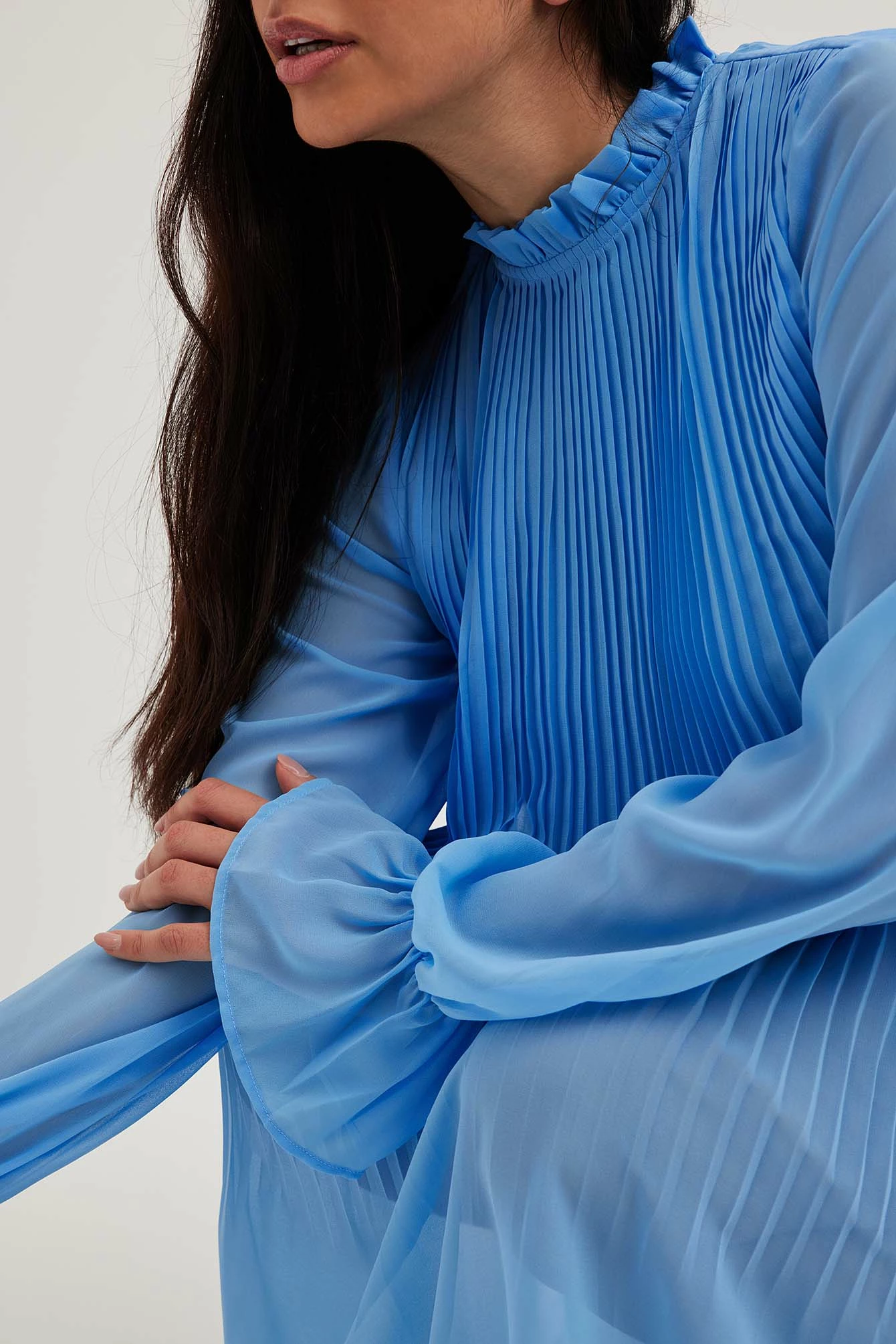 This mini dress features a pleated design. It has a high neckline with small frill details and a button closure at the back of the neck. This mini dress features long balloon sleeves, underlining, a flowy fit and a light, soft material.