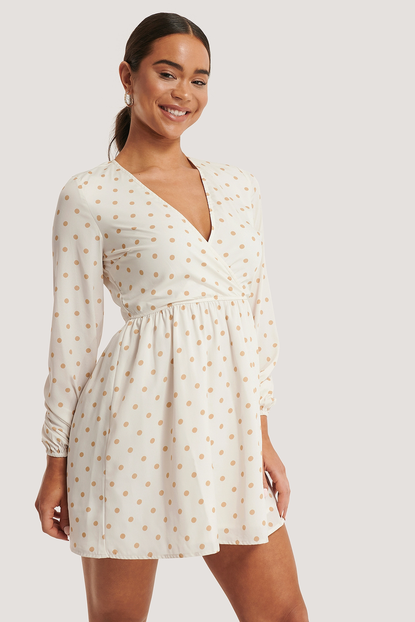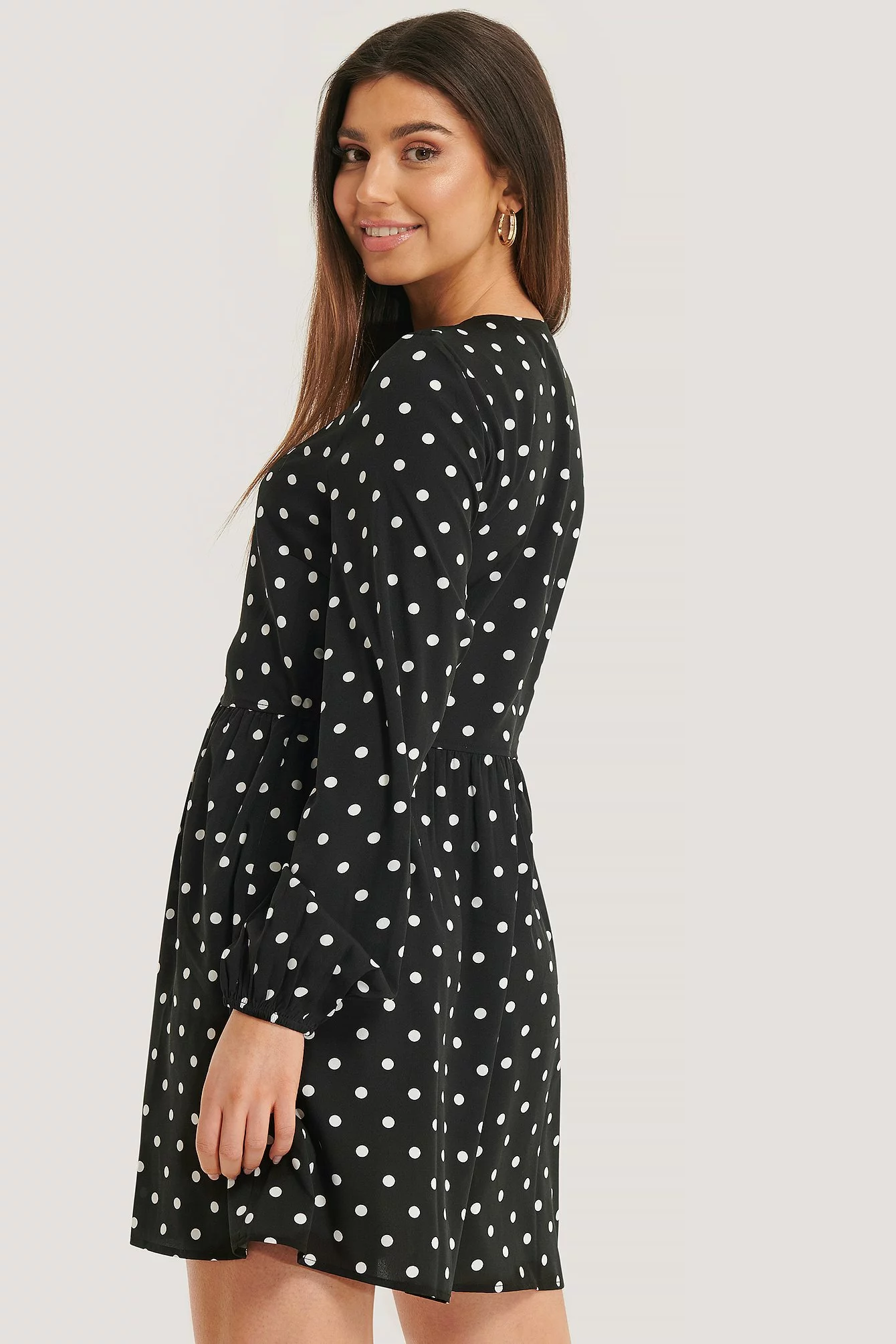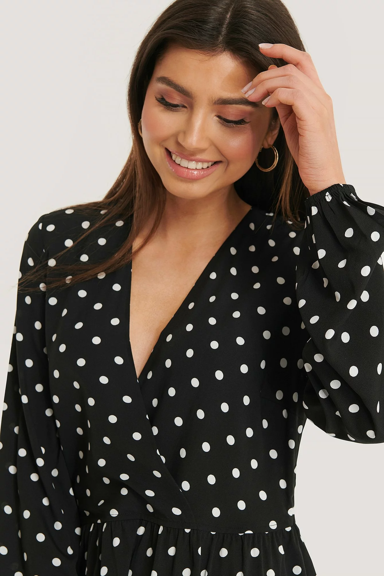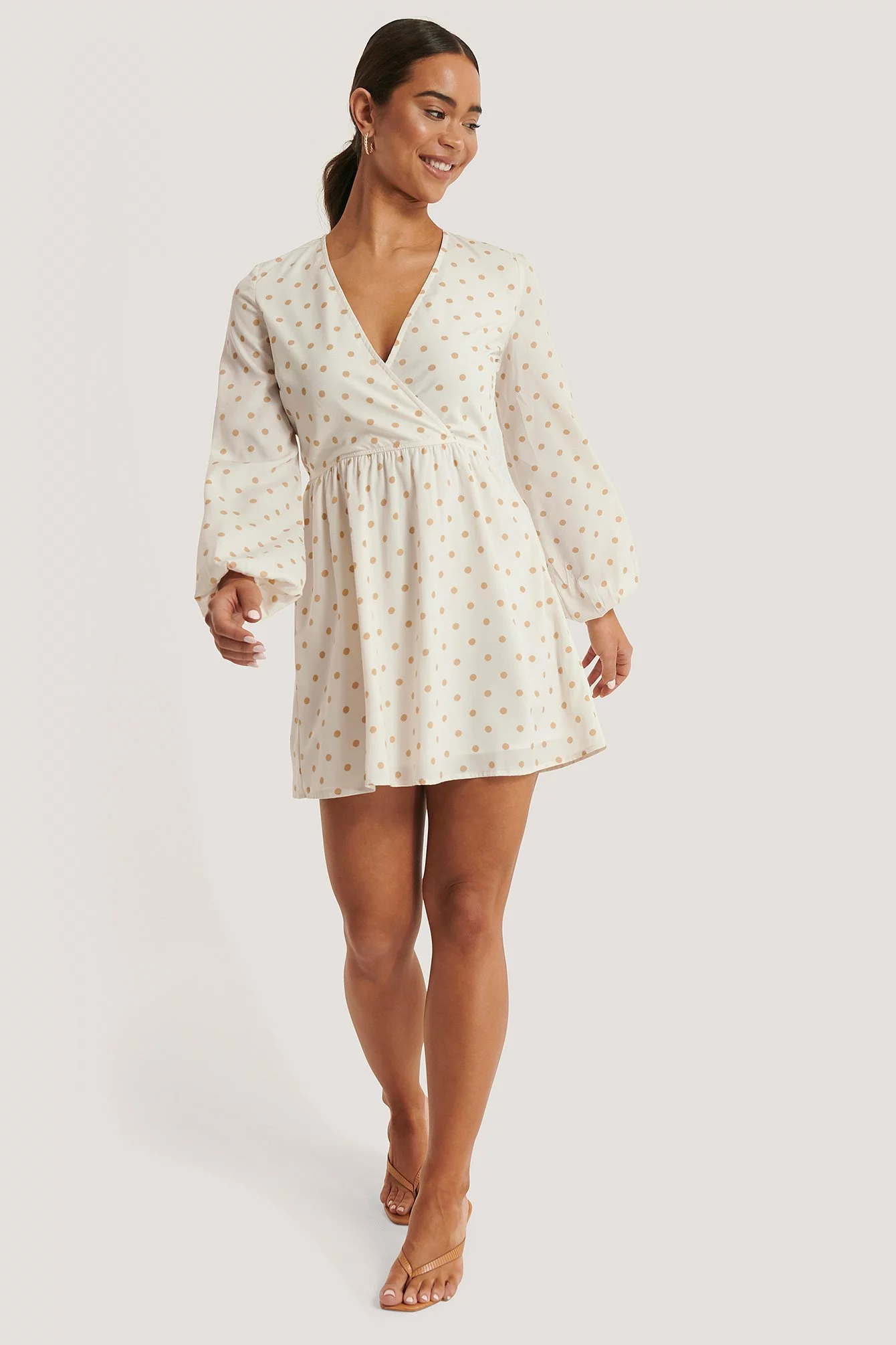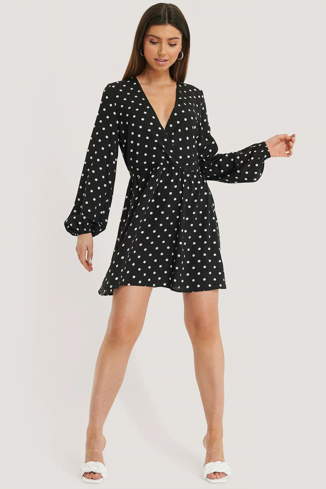 This mini dress features a v neckline with an overlap design, long balloon sleeves with elasticized cuffs, a non-elasticized waistline, a flowy, a-line skirt, a hidden side zipper closure and a half lining.