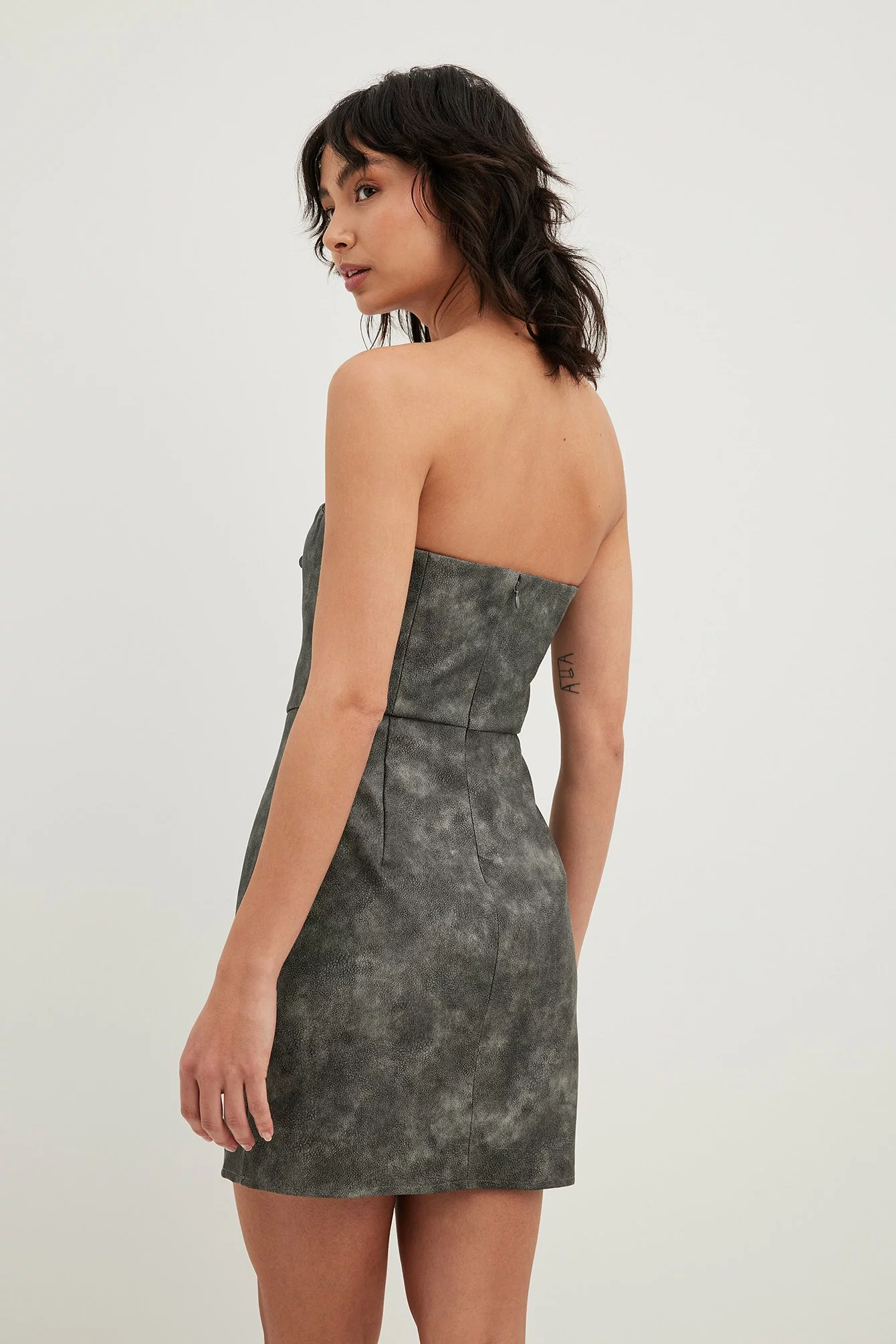 This mini dress is made of PU and features a bandeau design. It has a back zip closure and an inner silicone trim.