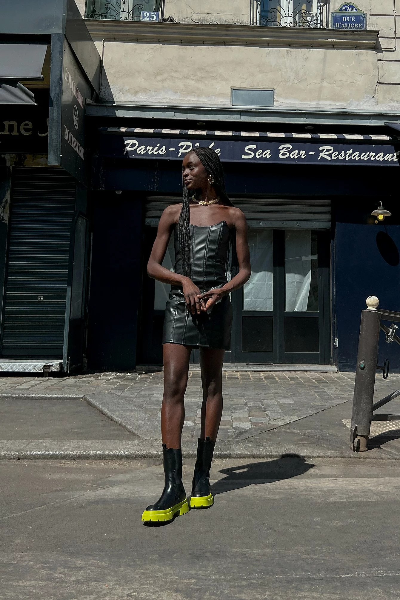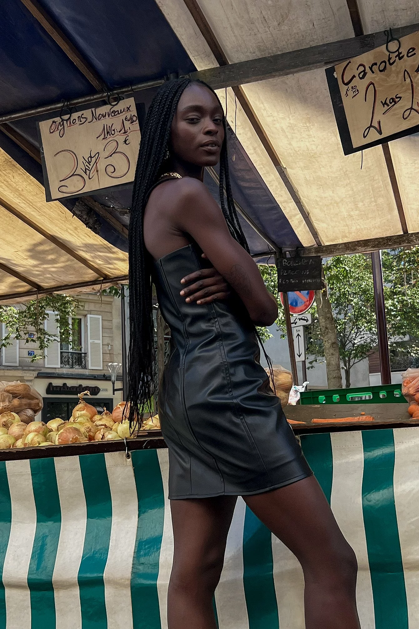 This mini dress is structured and features a faux leather, a pointed corset design and a zipper closure at the back.