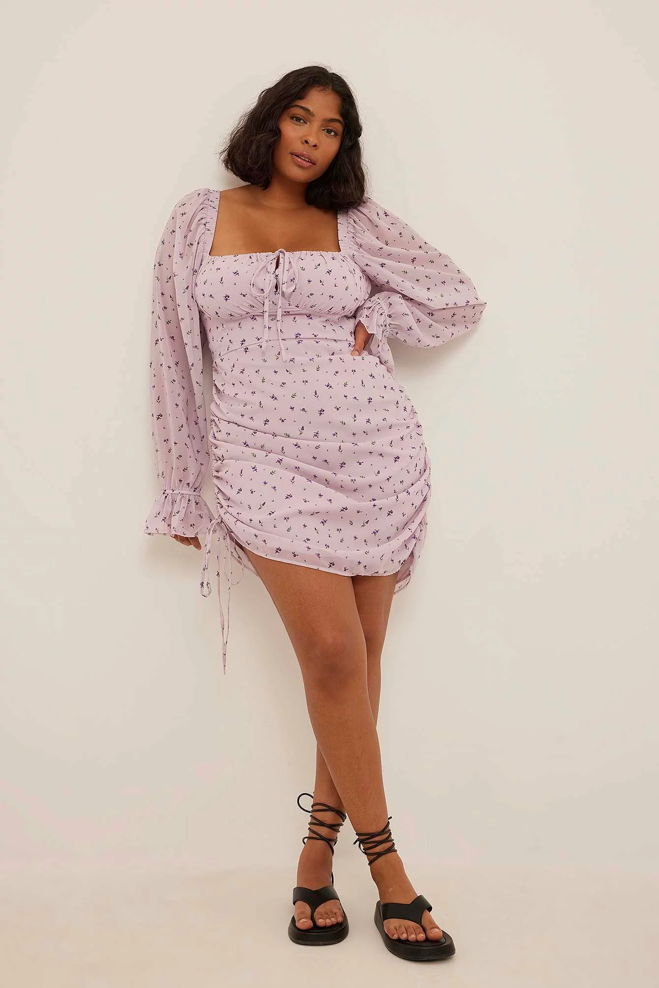 This dress features a square neckline with an adjustable tie strap, detailed gathering on the chest, adjustable drawstrings on the sides, an elasticized cuff, seethrough, puffy long sleeves and a mini length with full underlining.