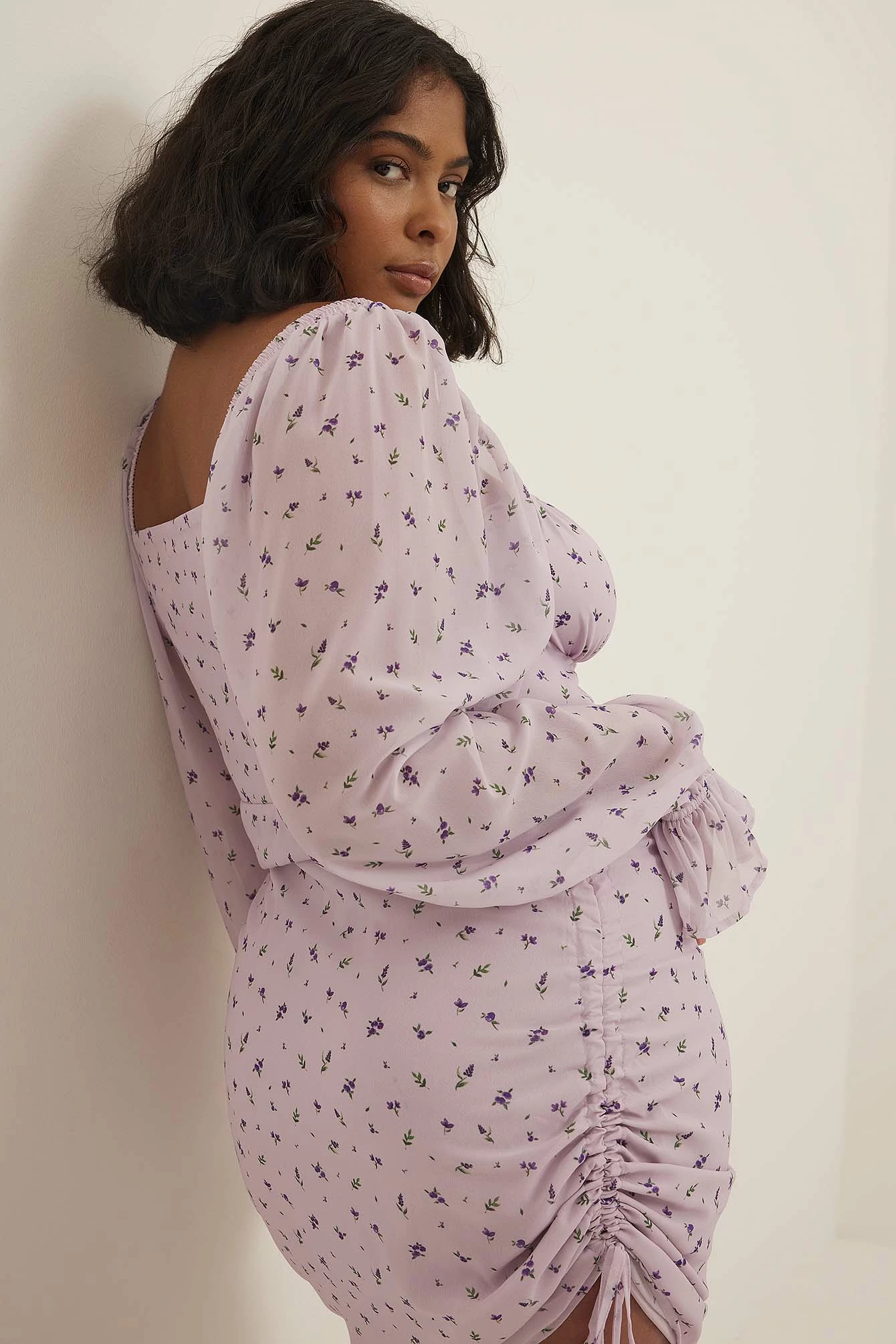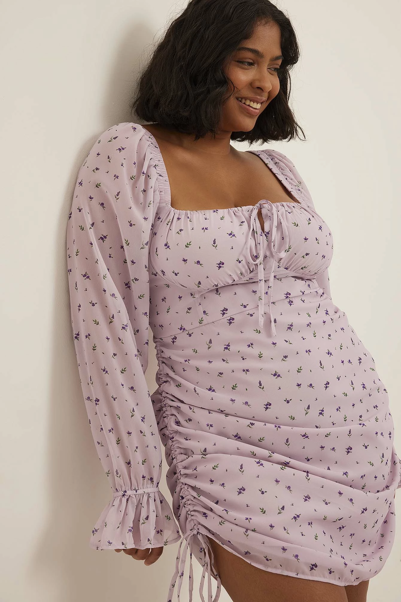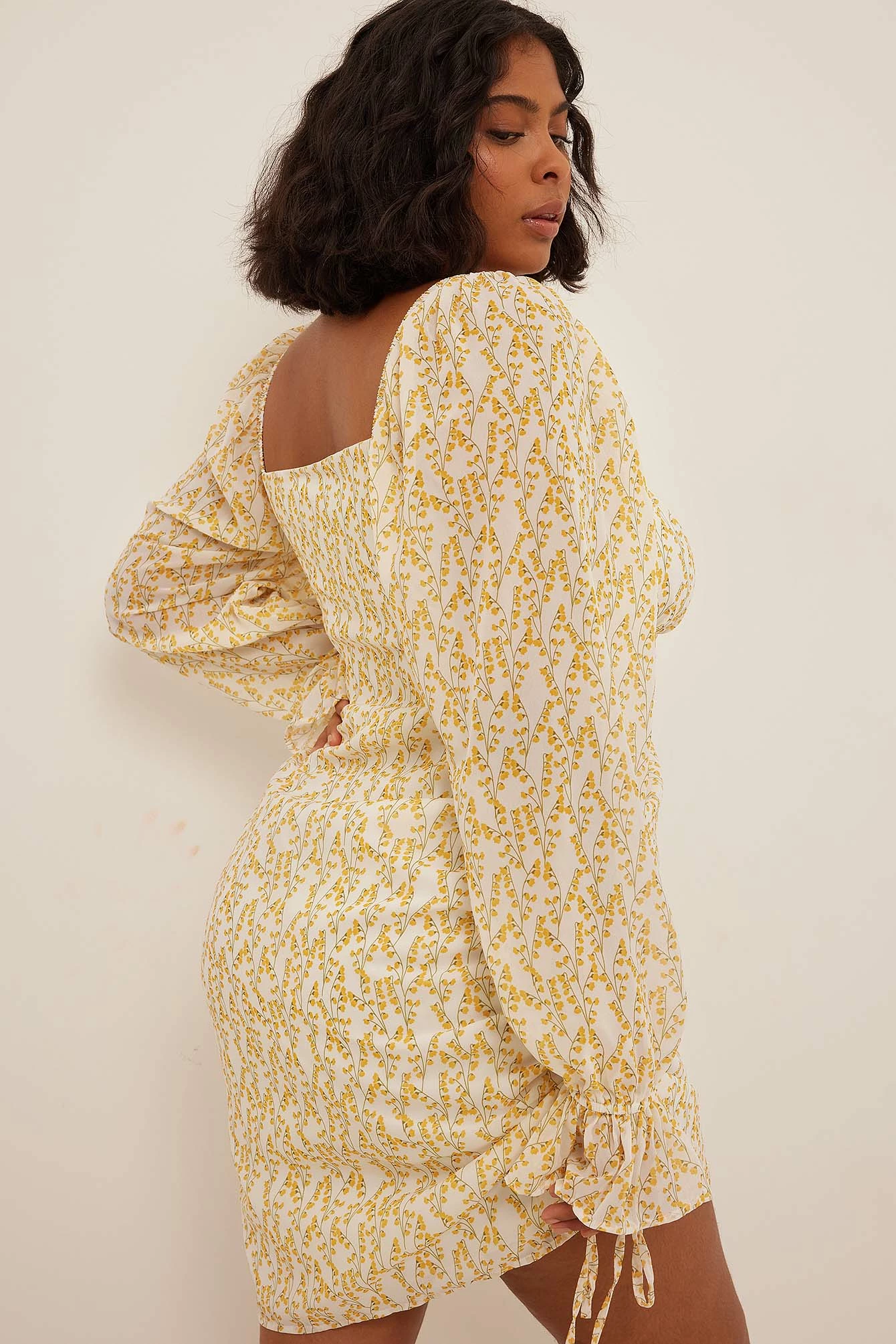 This dress features a square neckline with an adjustable tie strap, detailed gathering on the chest, adjustable drawstrings on the sides, an elasticized cuff, seethrough, puffy long sleeves and a mini length with full underlining.
