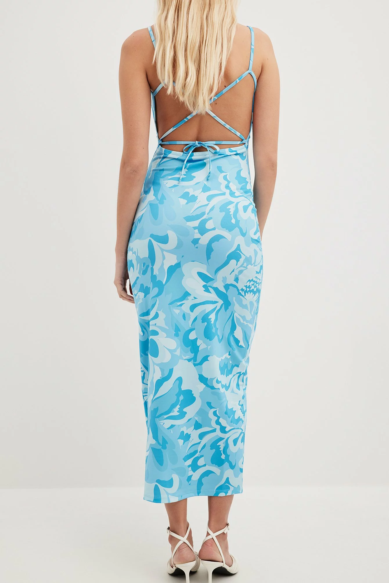 This dress features a waterfall neckline. It has shoulder straps and an open back design. This dress features a midi length and a stretchy material.