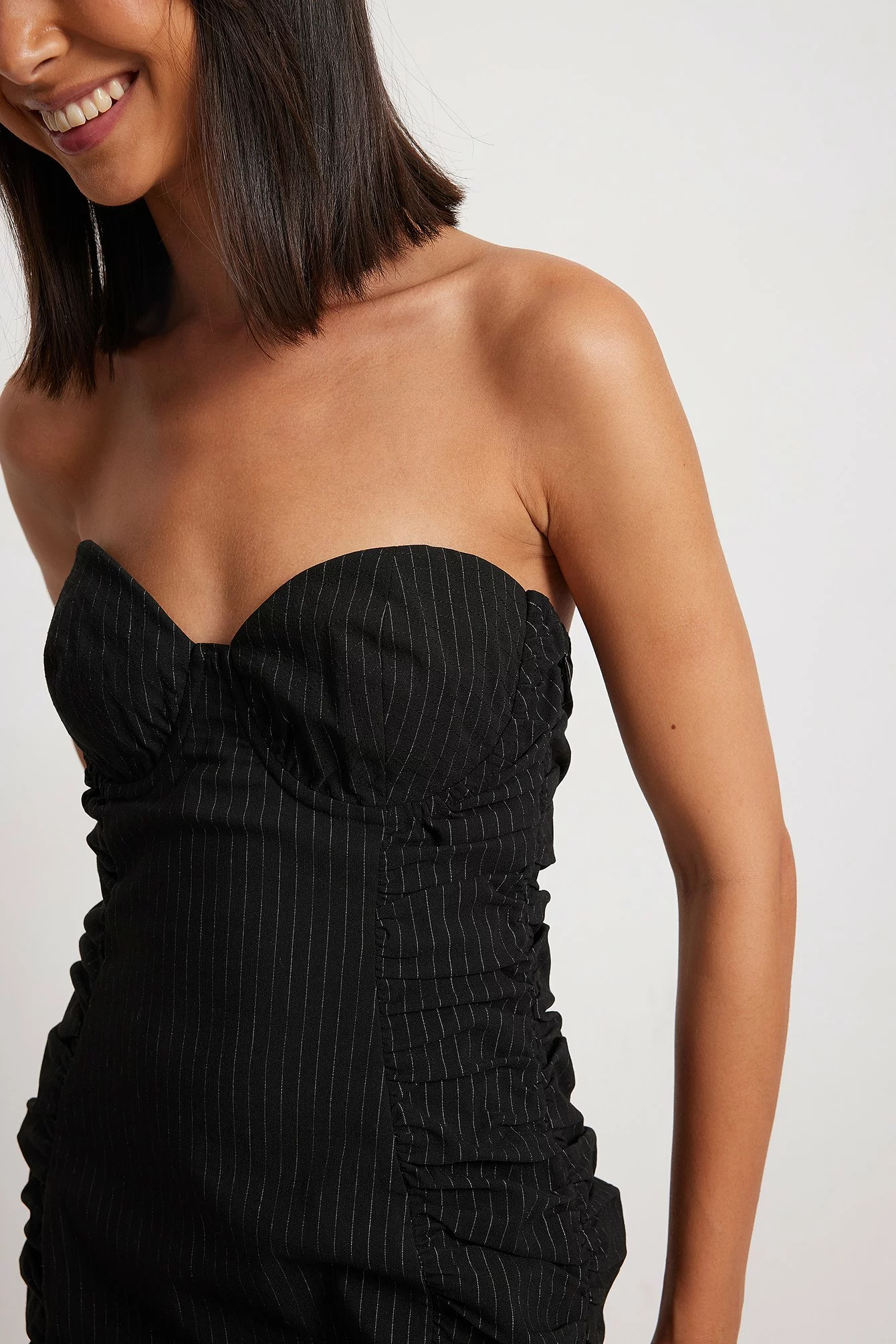 This mini dress features bandeau style, an underwired cup, rouched details, a side zipper closure, a thin striped detail and a stretchy material.