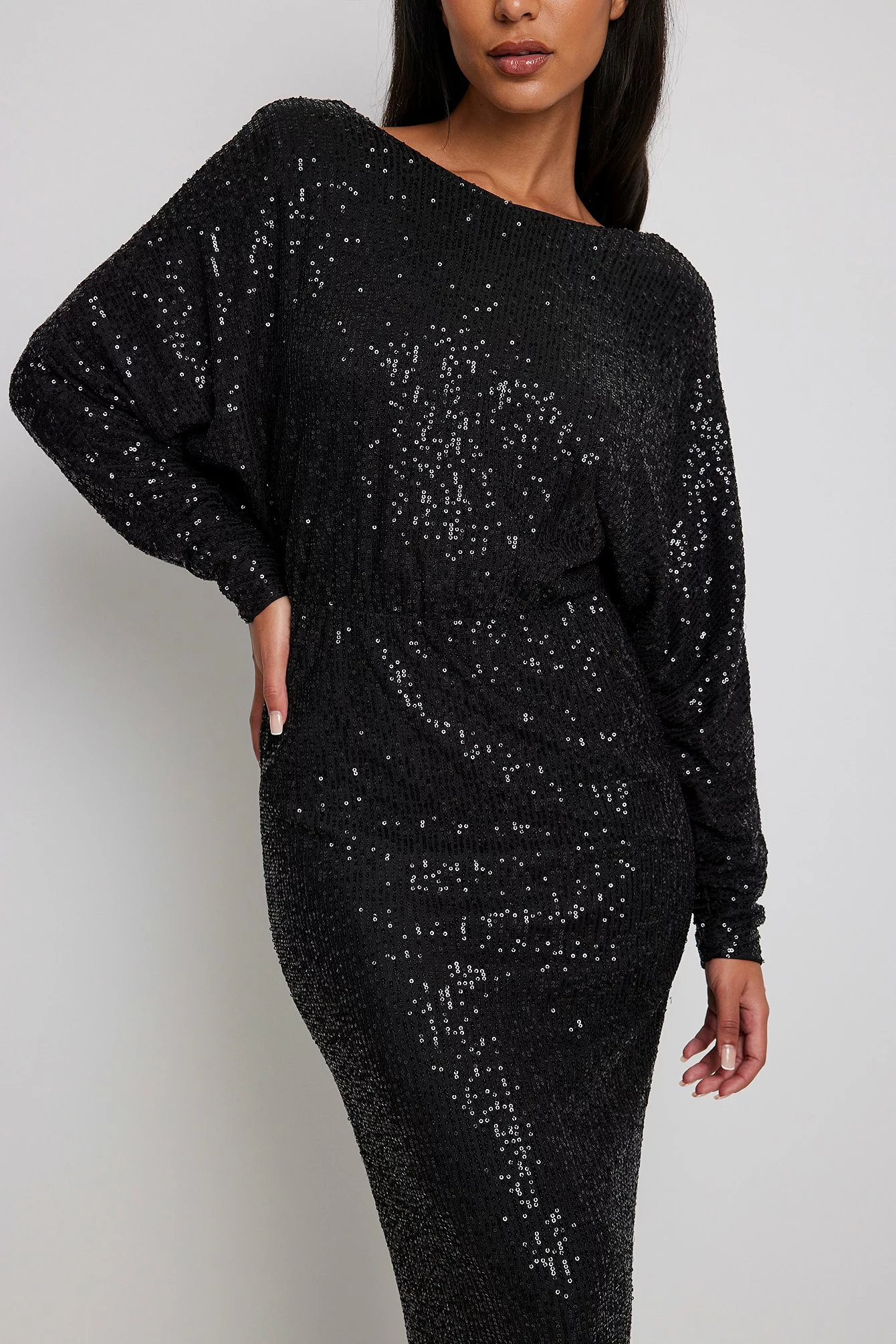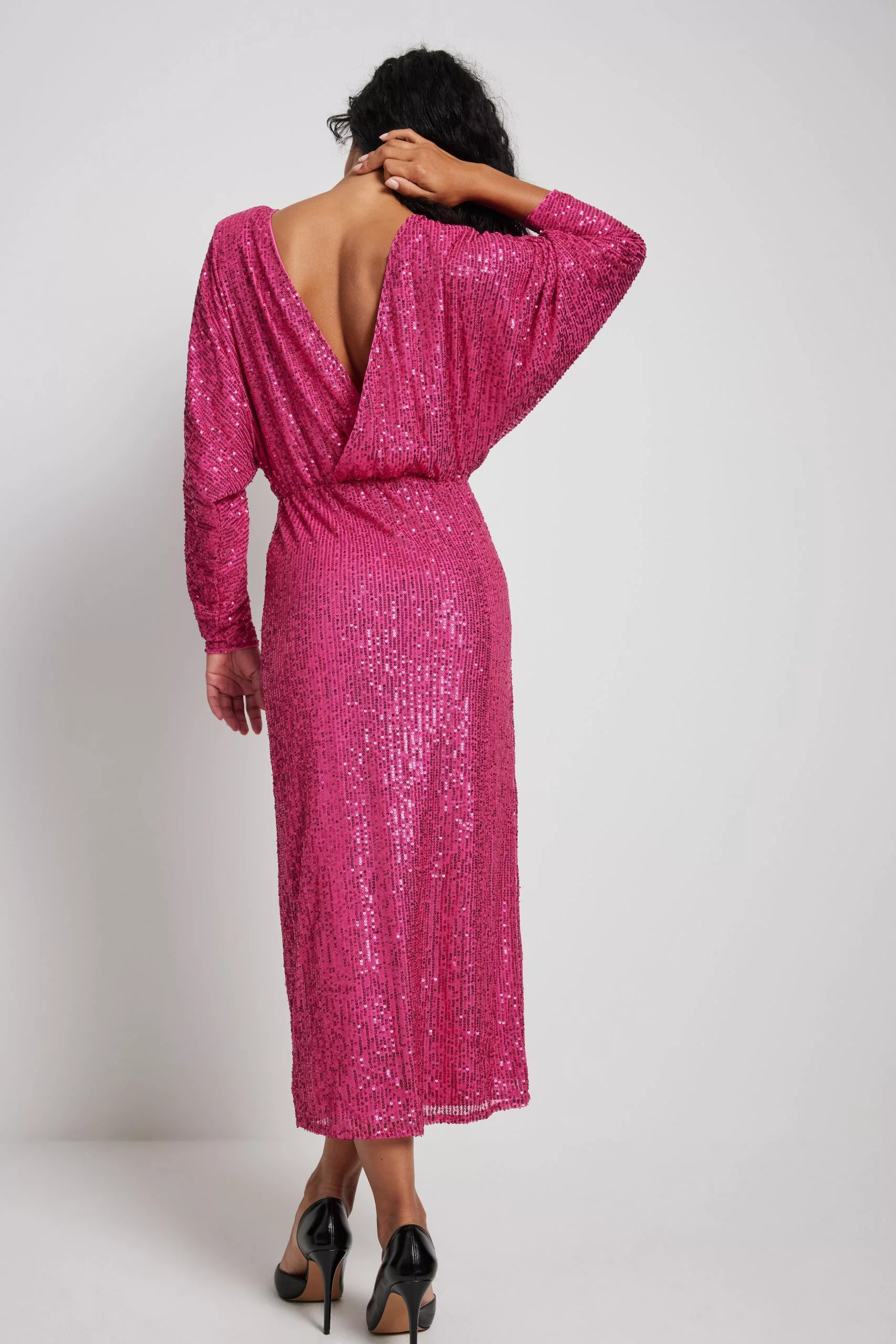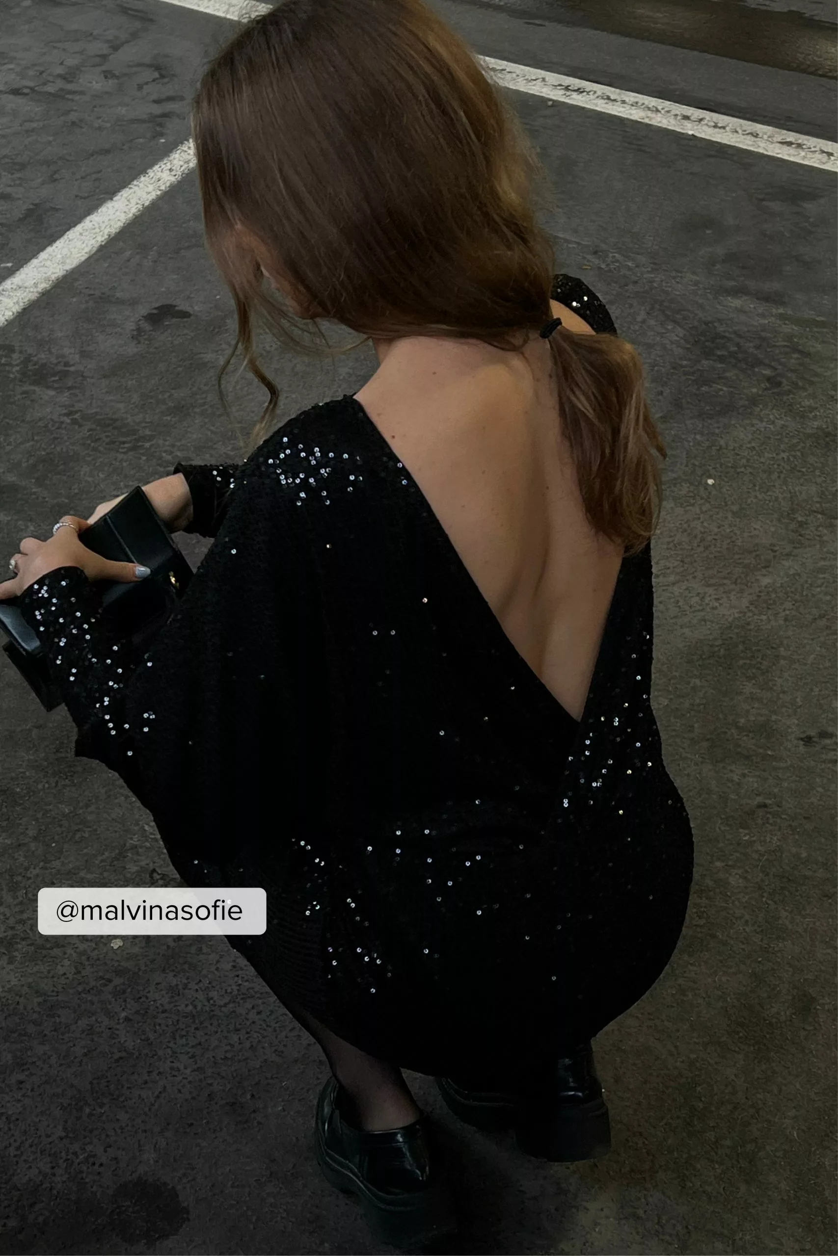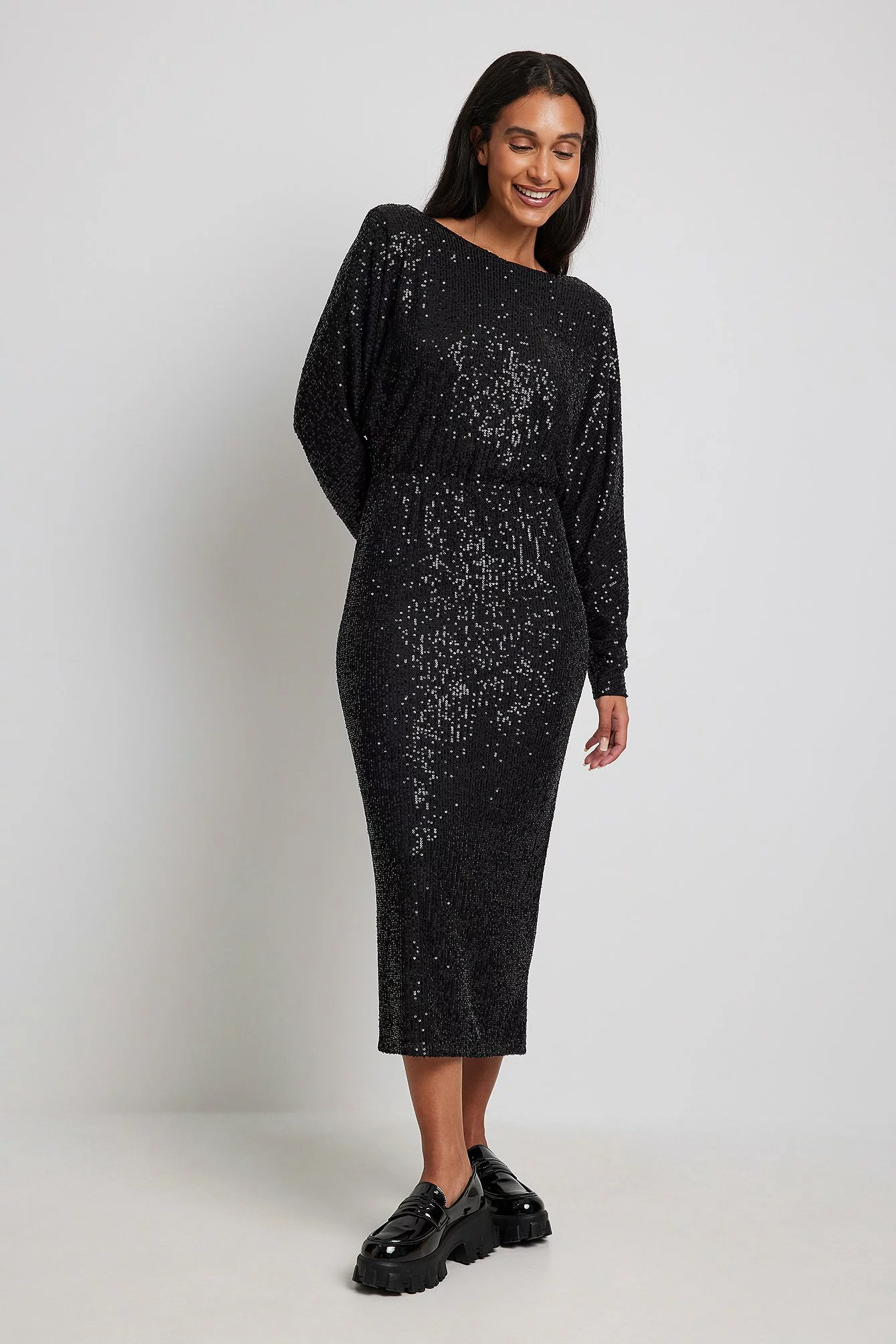 This sequin dress features a round neckline, long sleeves with shoulder pads, a deep back, a marked waist and a midi length.