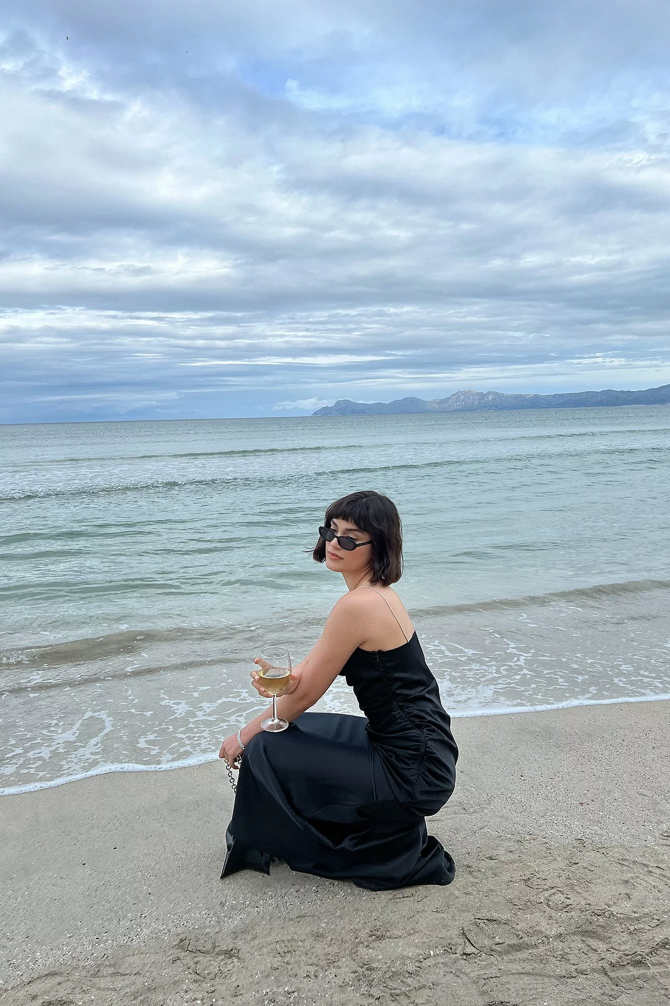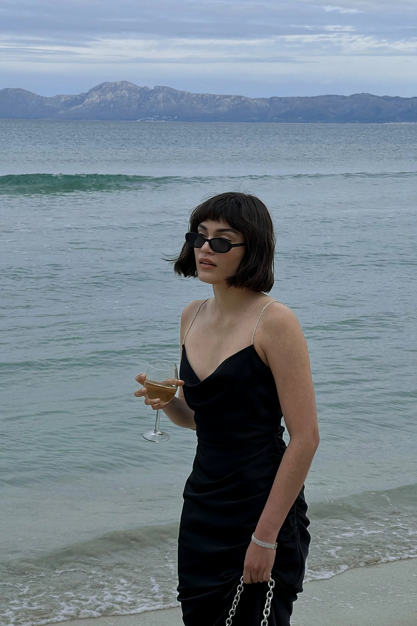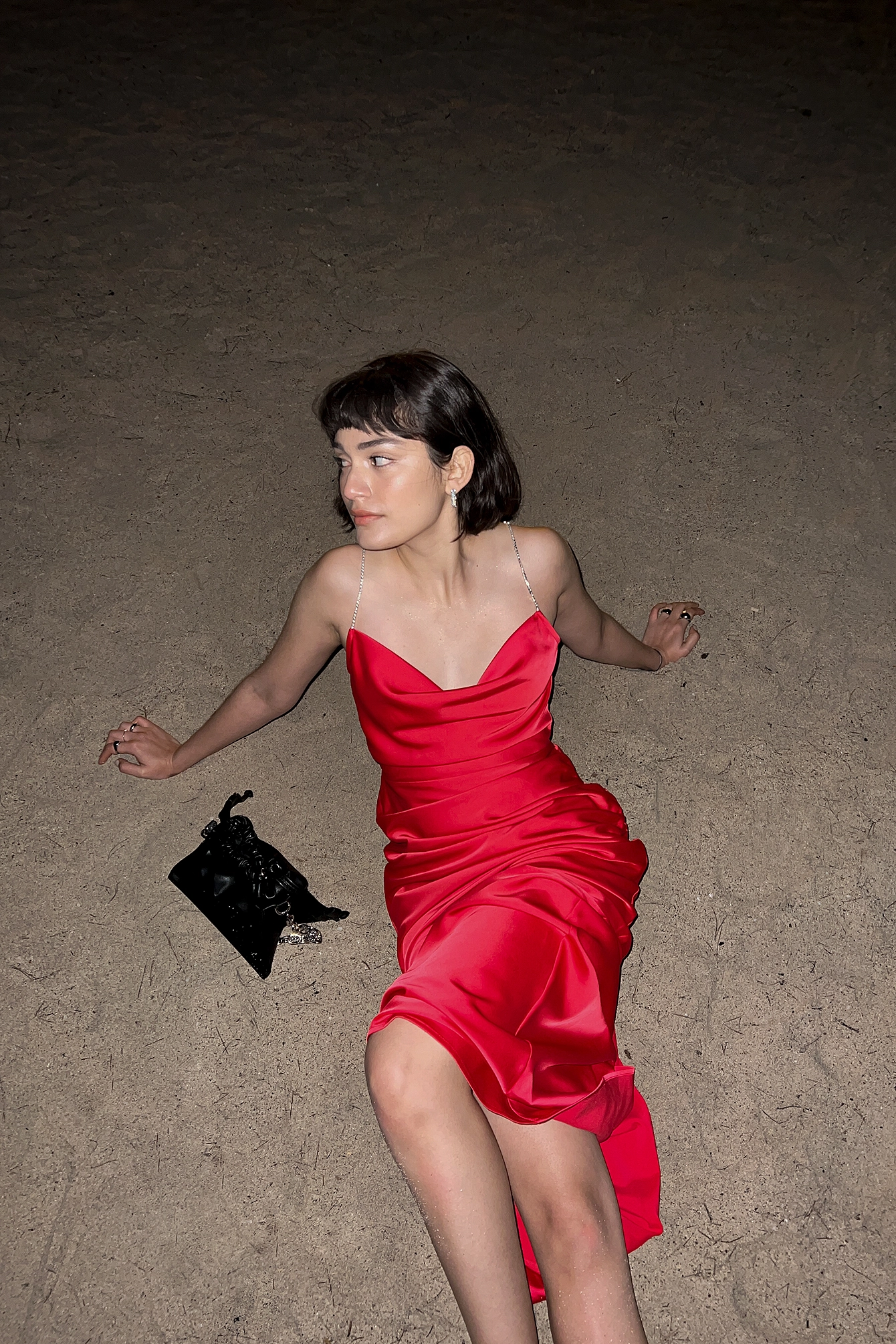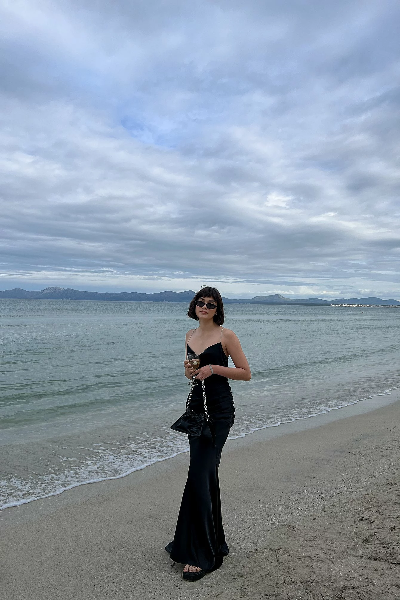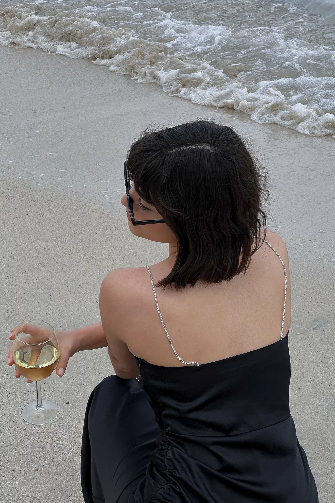 This maxi dress features straps with rhinestone embellishments, a plunge neckline and a side zipper closure.