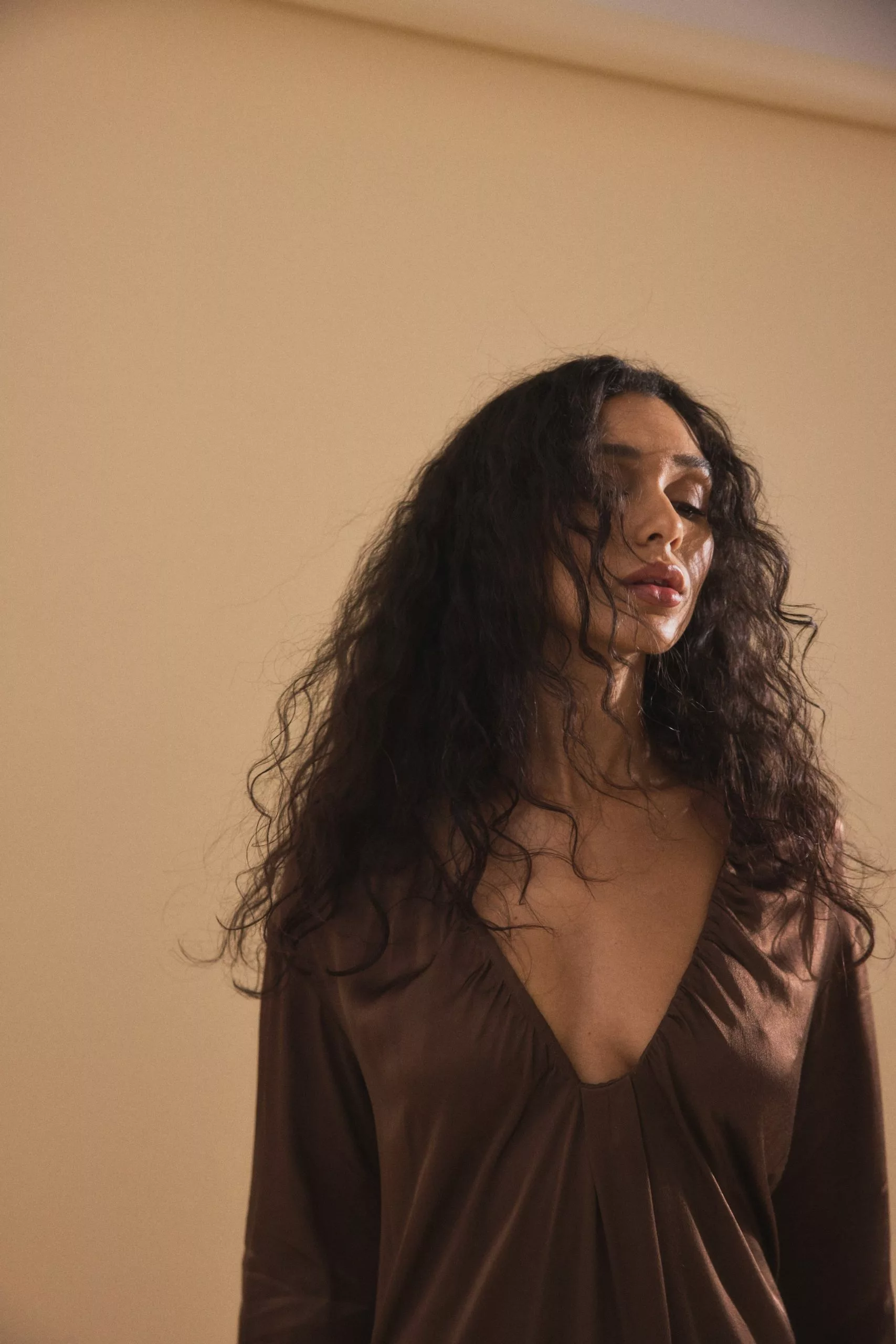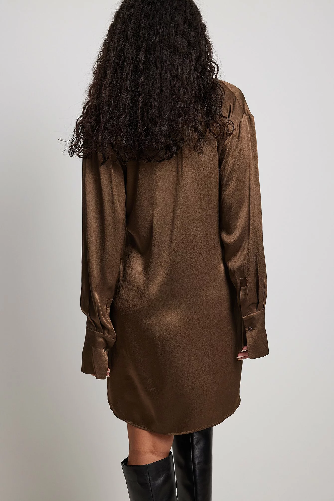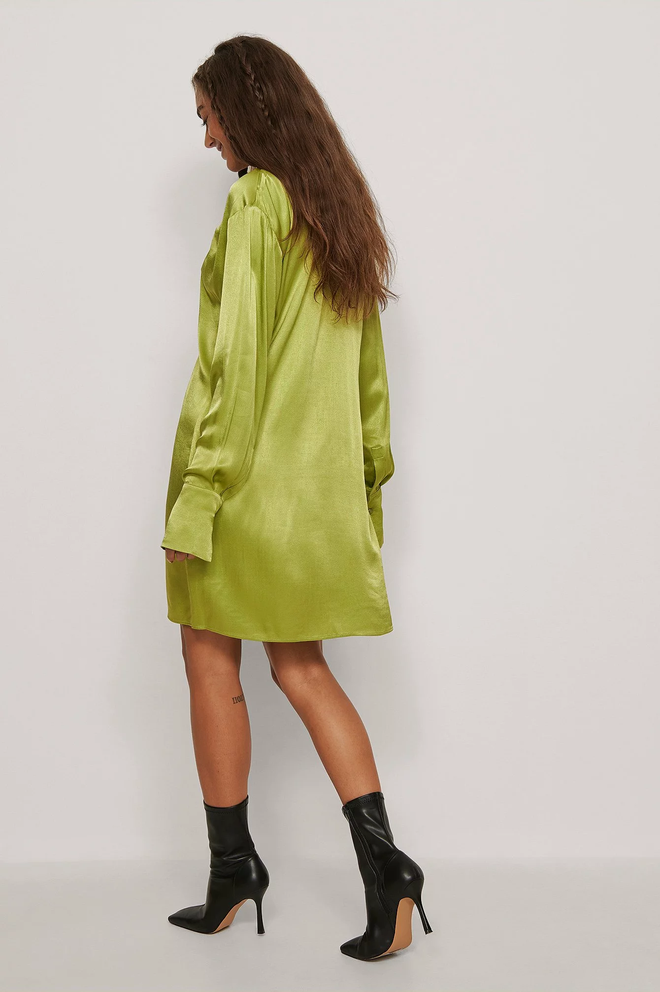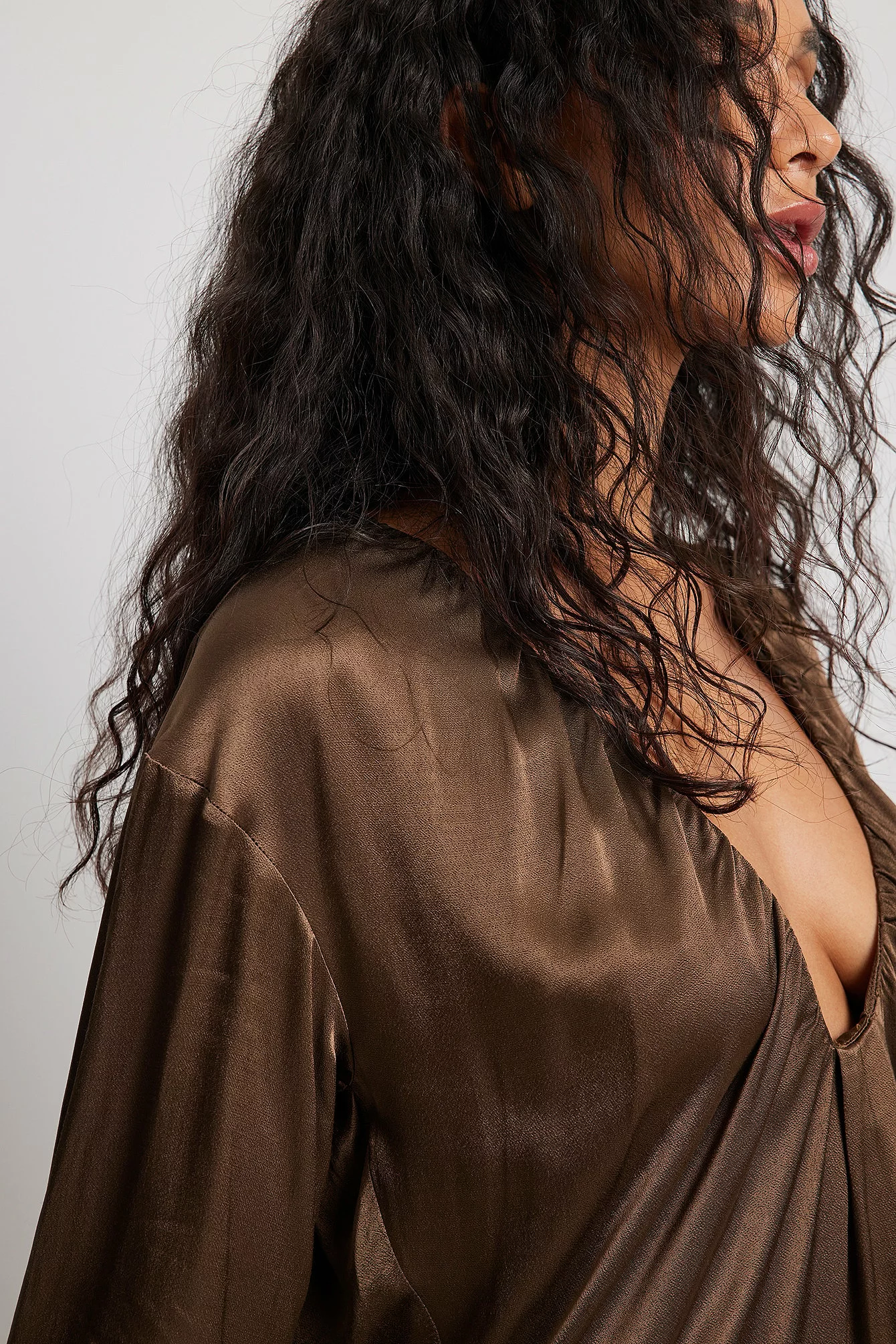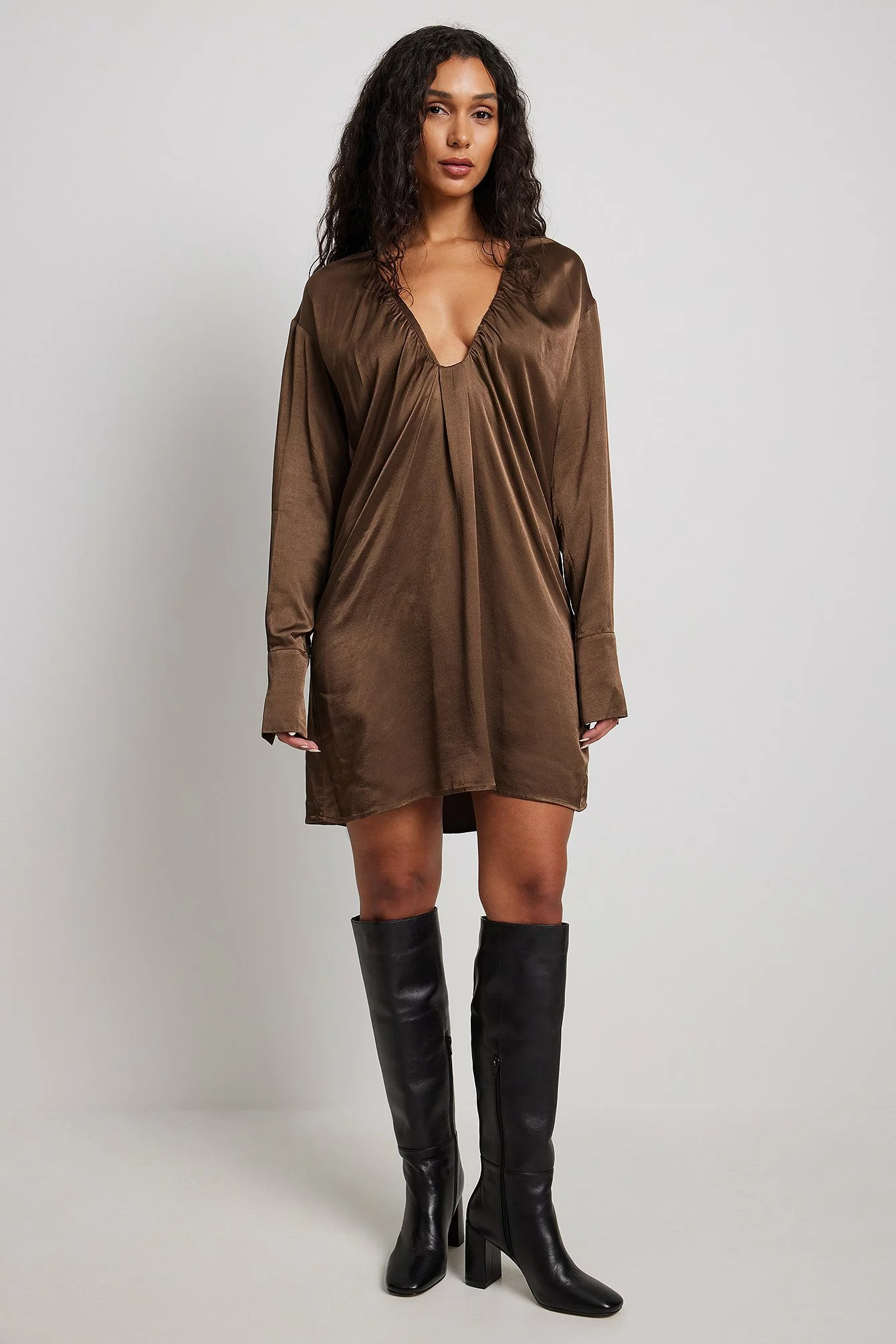 This mini dress features satin fabric, a v-neck cut with a gathered seam and long sleeves with single button cuffs.