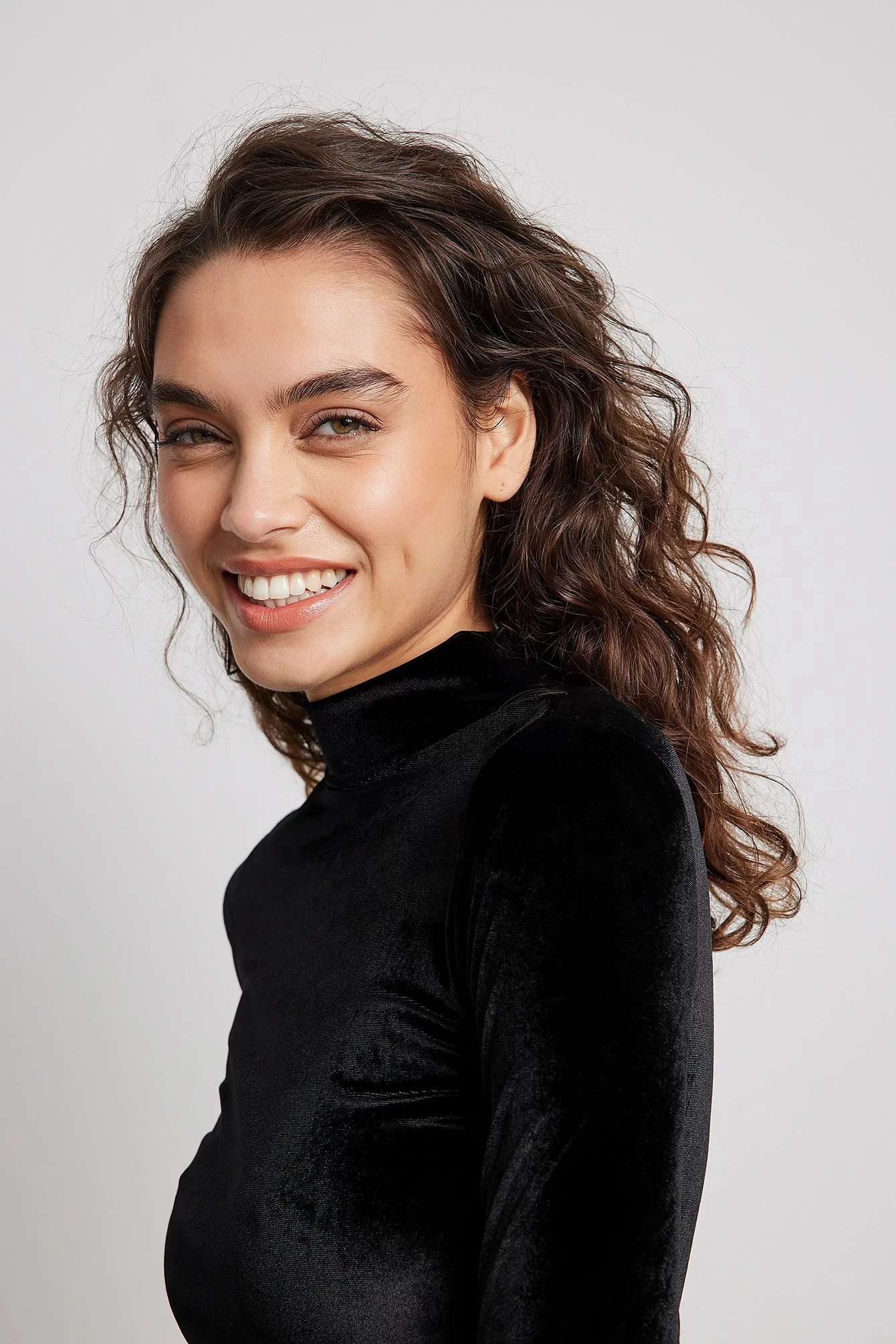 This mini dress is stretchy and made of velvet and features a high neck, long sleeves and a button closure at the back of the neck.