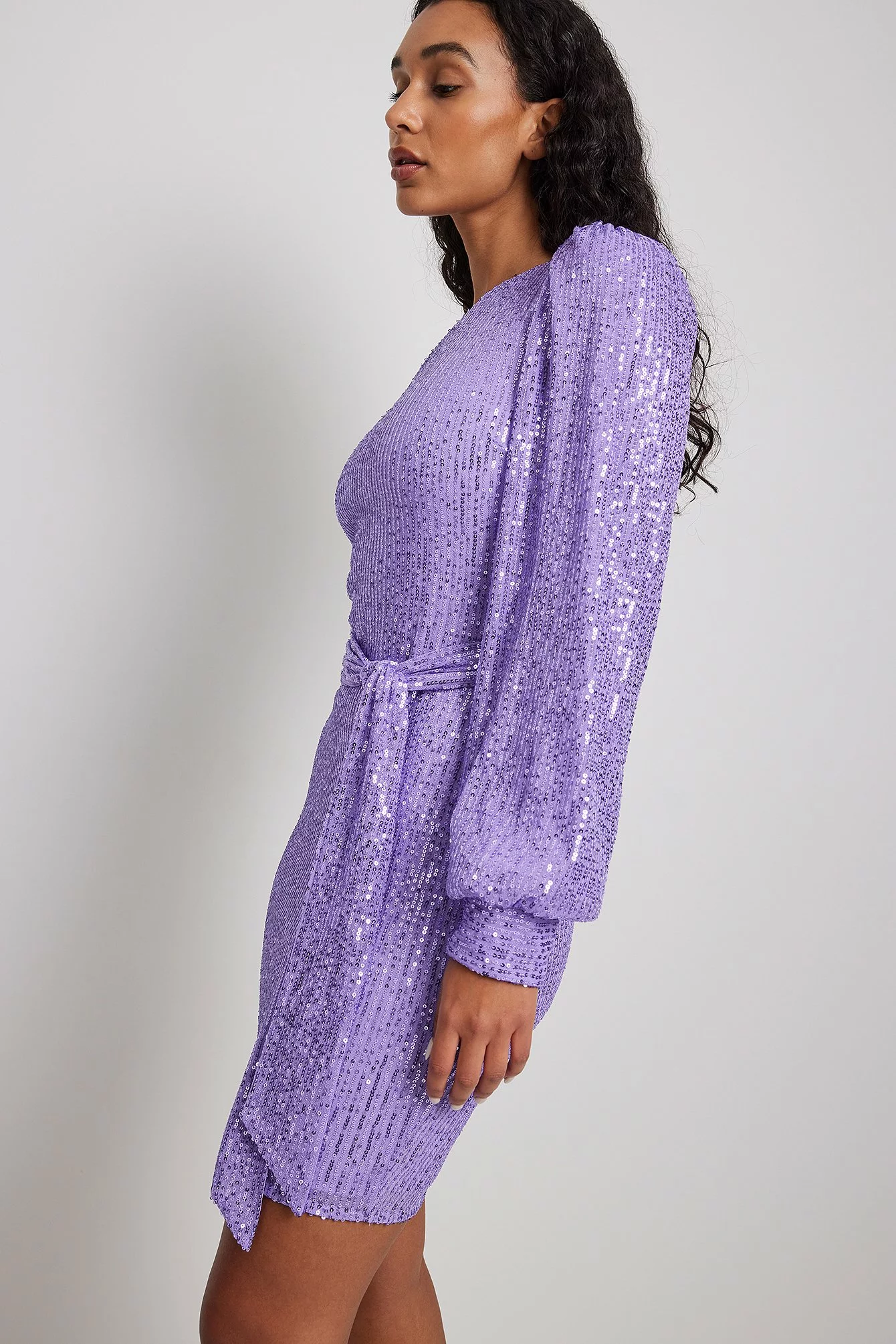 This mini dress is belted and made of sequin and features a one sleeve design with a balloon sleeve.