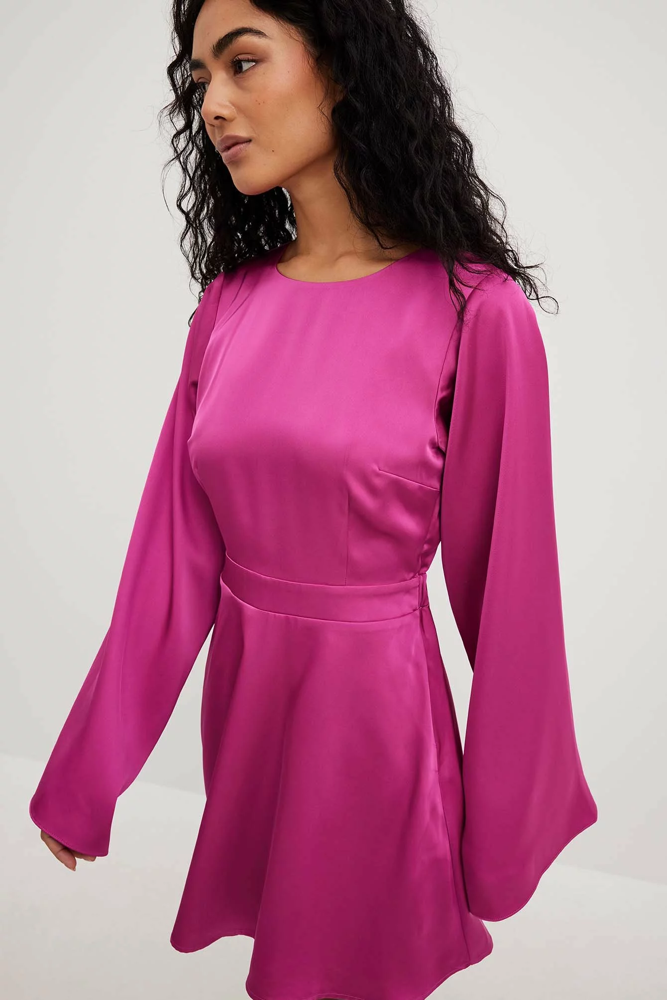 This mini dress is made of satin and features a flowy fit. It has a crew neckline and wide long sleeves. This mini dress features an open back design in elastic band with a self tie detail and a side zipper closure.