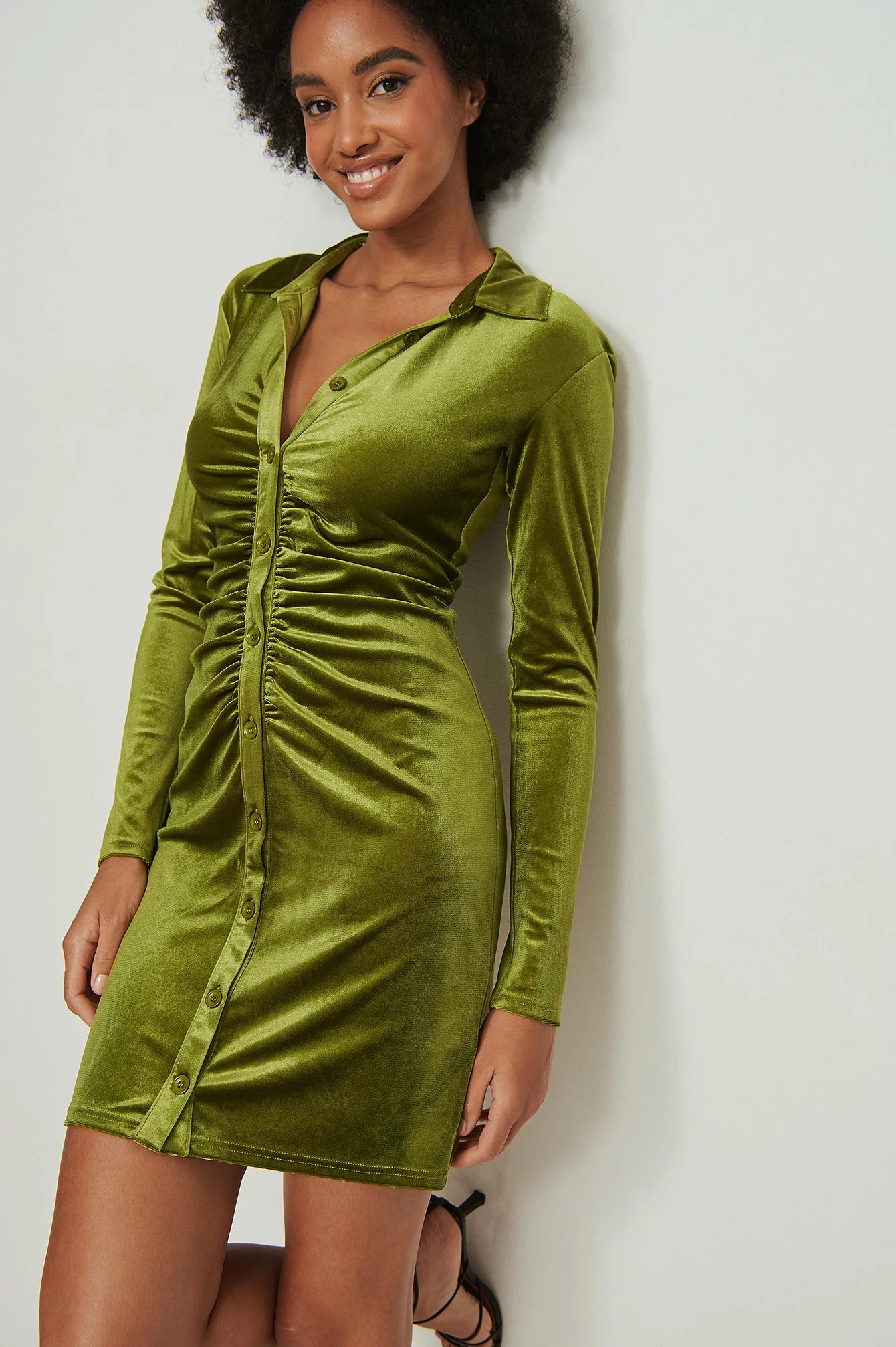 This mini dress is made of velvet and features a classic collar, button closure down the front with rouched details and long sleeves.
