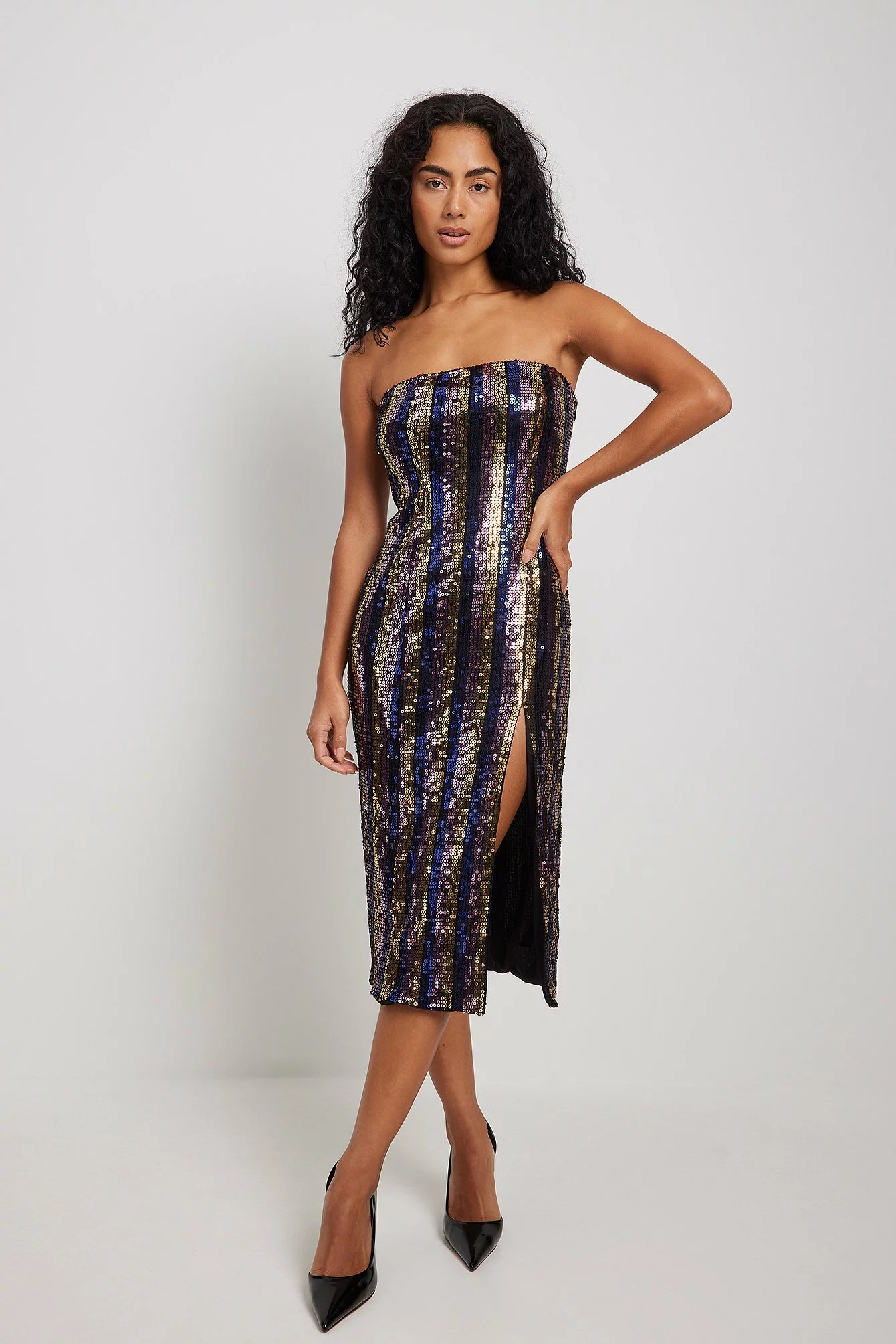 This midi dress is made of sequin and features a bandeau design. It has a front slit and a side zipper closure.
