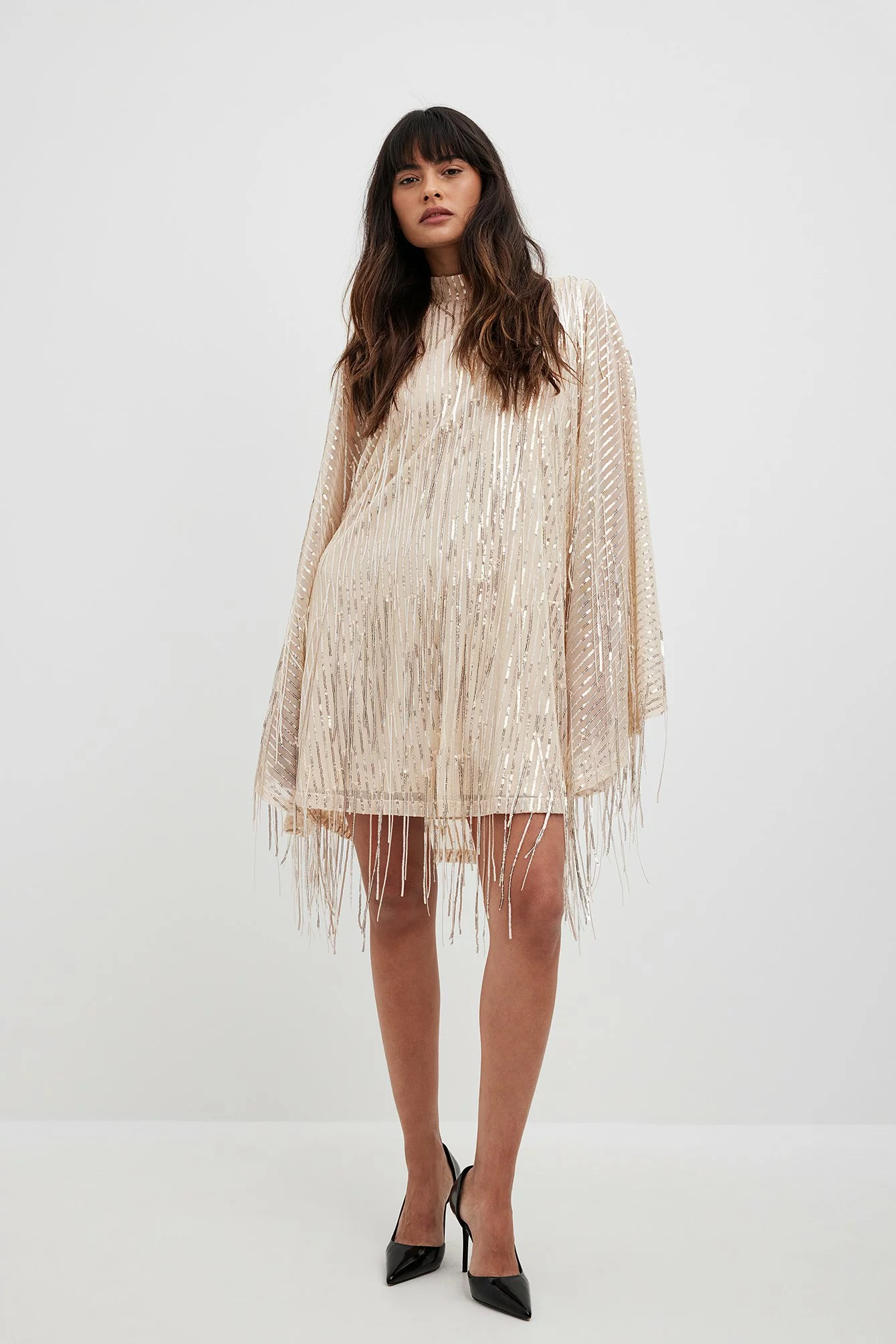 This mini dress features a flowy fit. It has a high neckline with a zipper closure and wide long sleeves. This mini dress features fringes in sequin.