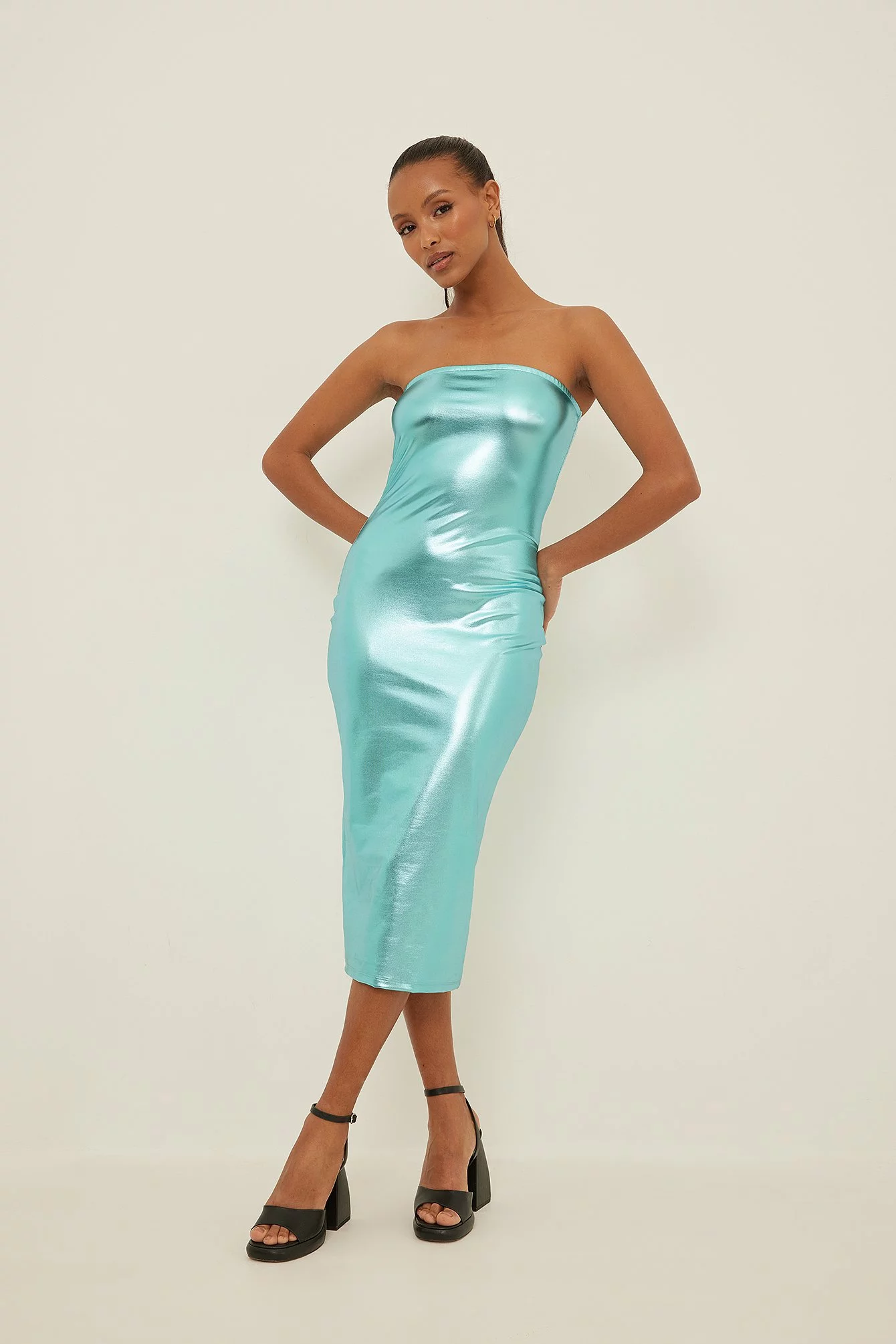 This midi dress is slightly stretchy and bodycon and features a bandeau design.
