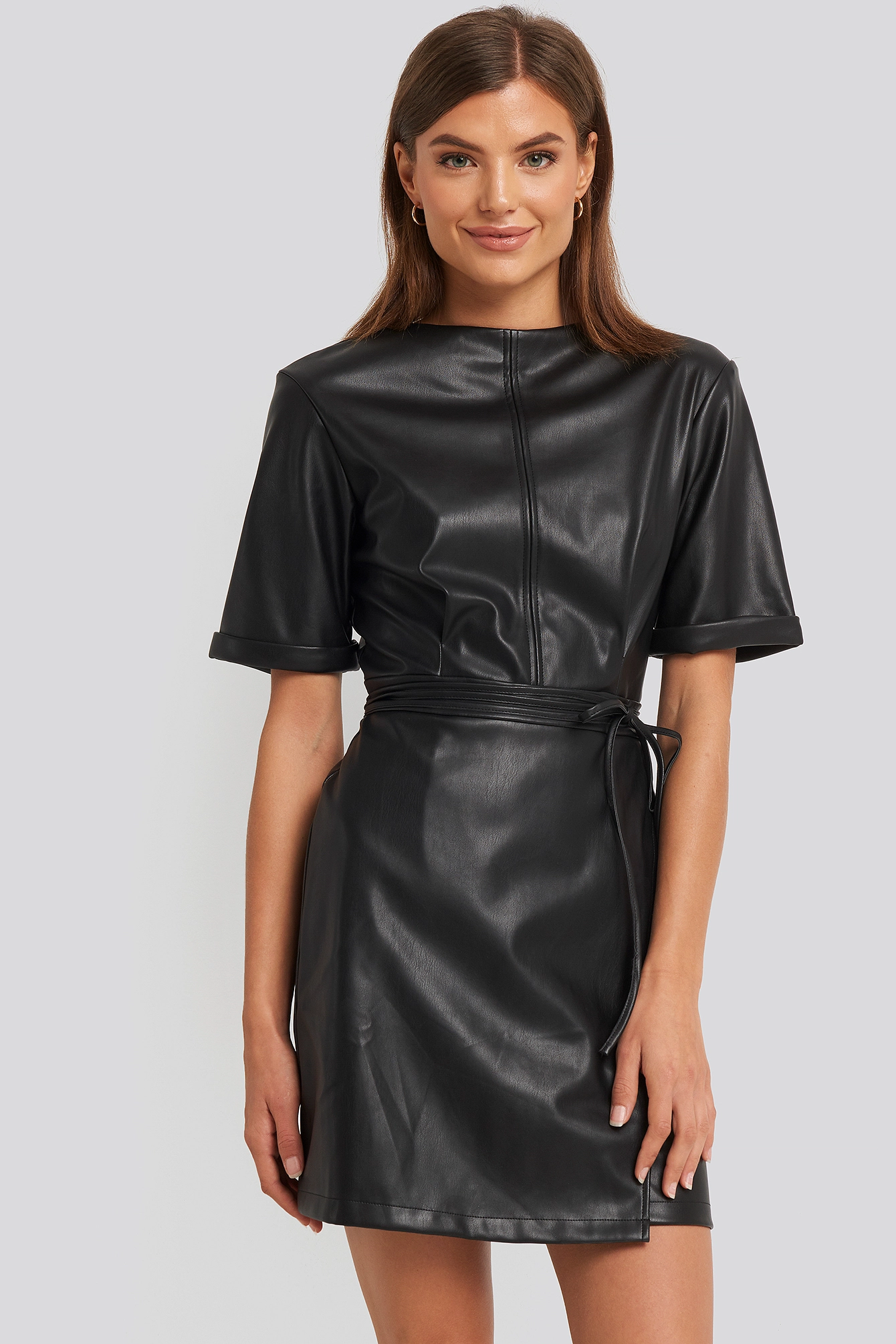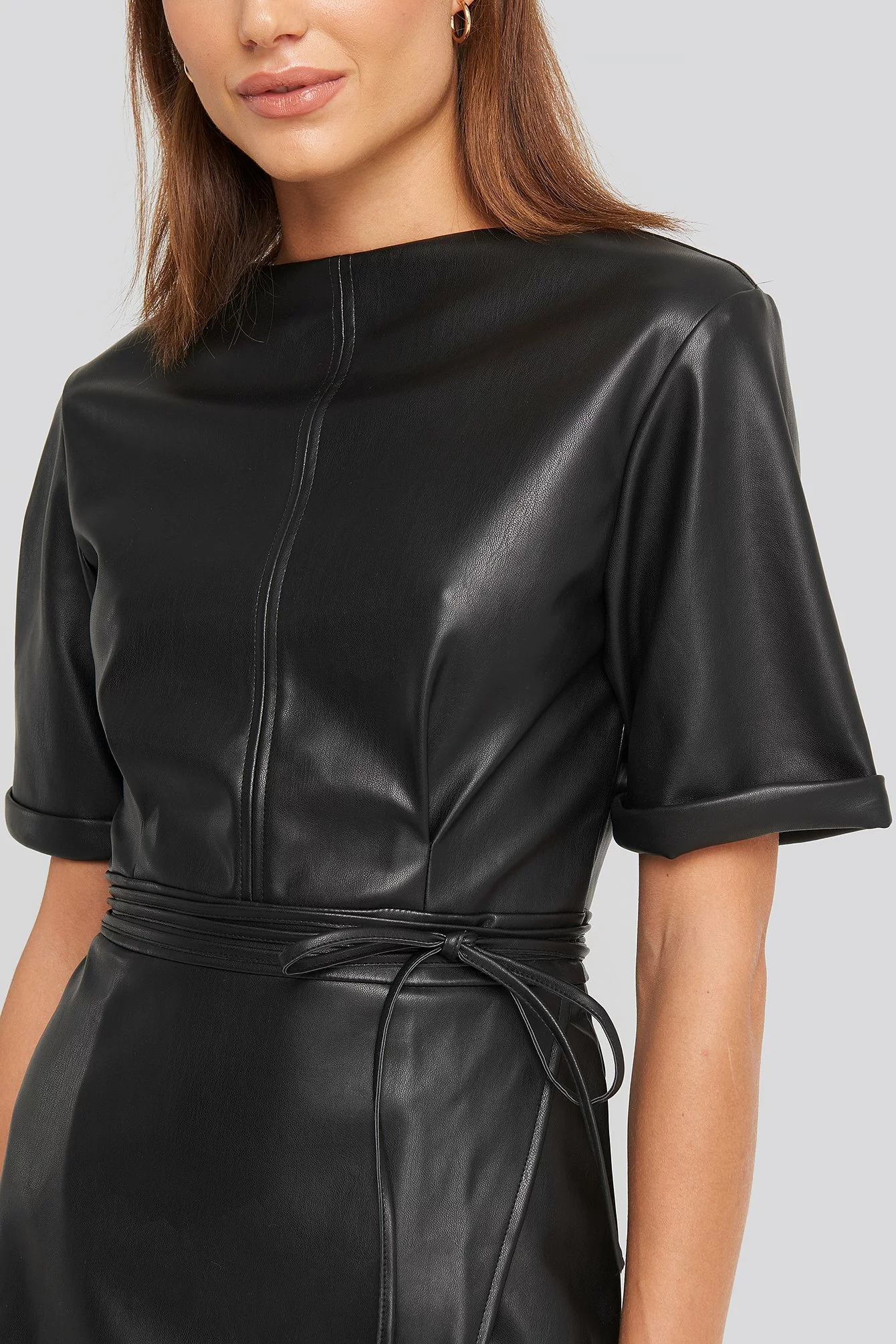 This mini dress features a layered design, a stretchy faux leather material with seam details, short sleeves, a rounded neckline, a zip closure at the back and a non removable waiststrap.
