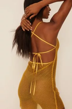 This midi dress features a deep V-neck with details, spaghetti straps and a bodycon fit.