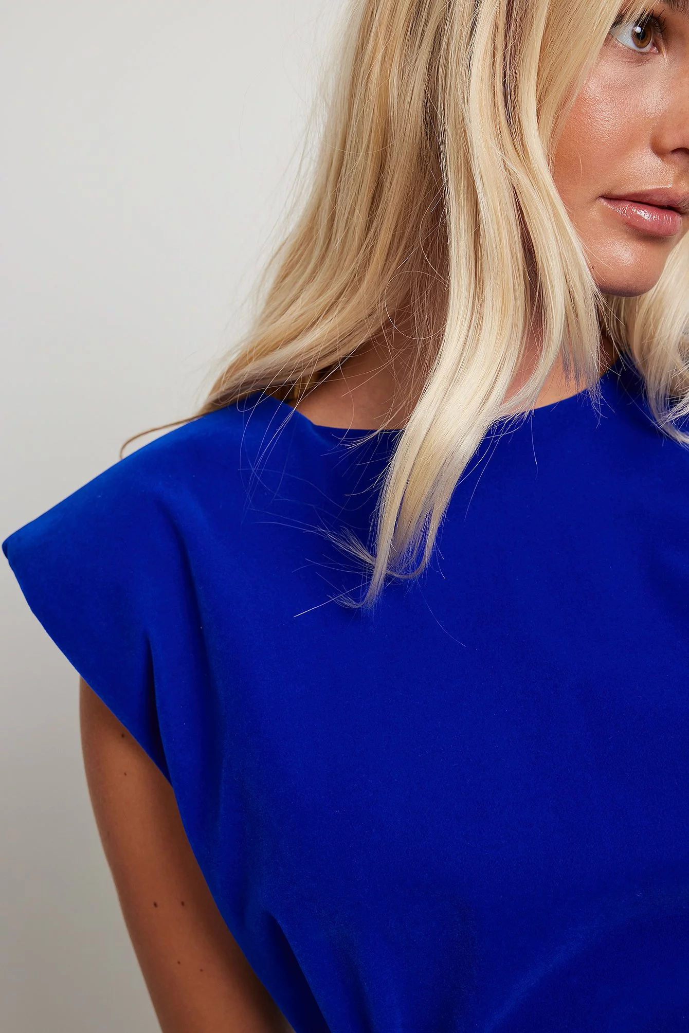 This mini dress is sleeveless and features a crew neckline, padded shoulders, a belted detail with a wide cut and a back zip closure.
