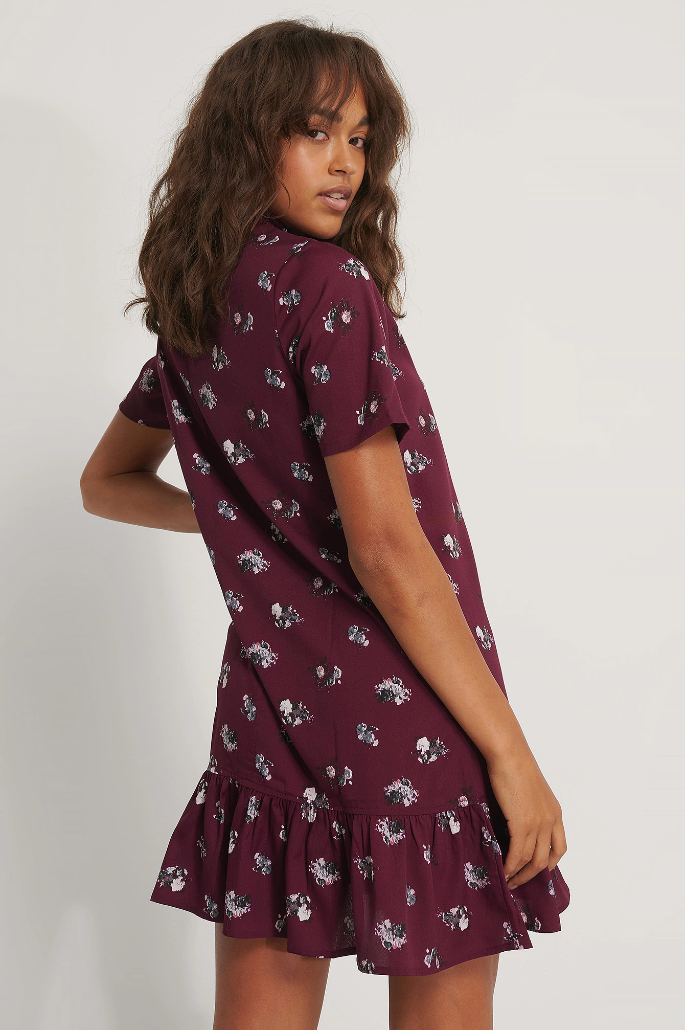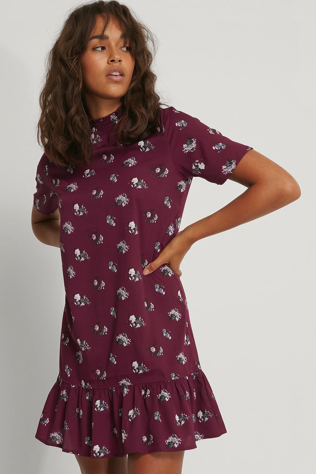 This mini dress features a smocked high neck, a button closure at the back of the neck, short sleeves and a gathered ruffle detail on the bottom.