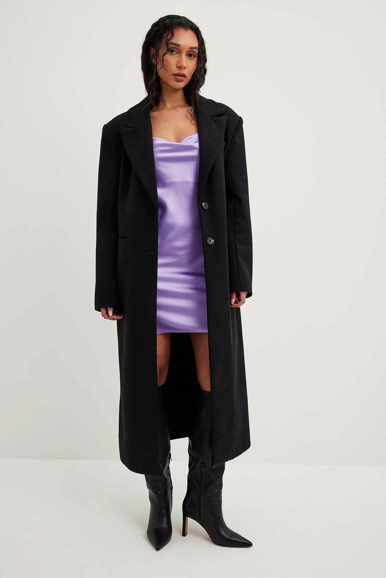 This dress features satin material. It has a waterfall neckline and adjustable spaghetti straps. This dress features a flowy fit and a mini length.