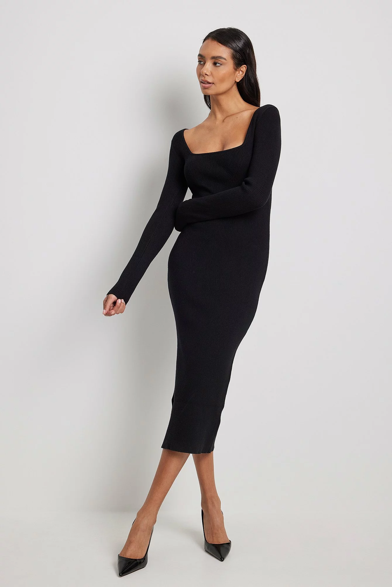 This midi dress features a scoop neck, long sleeves, a slit and a ribbed, knitted material.