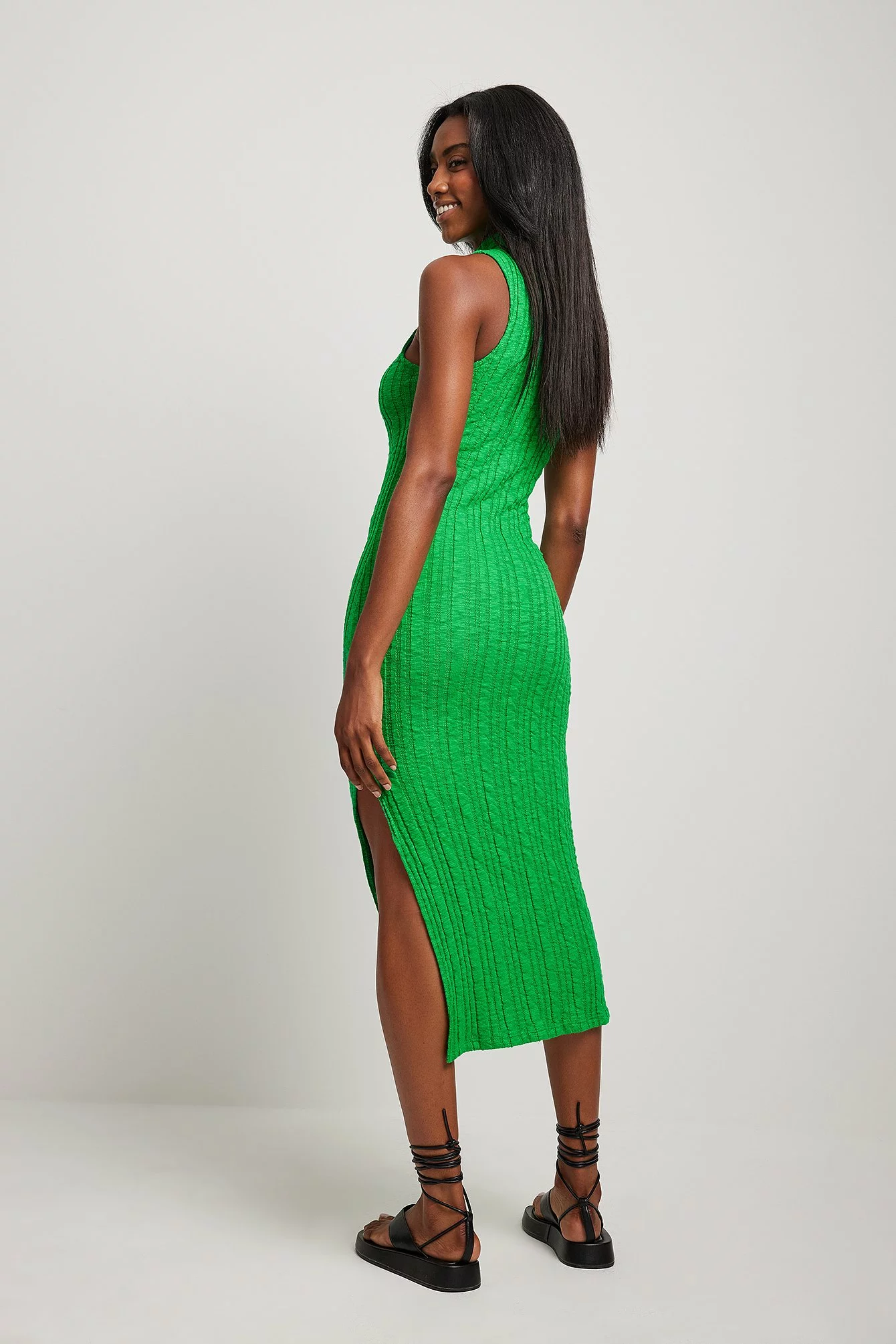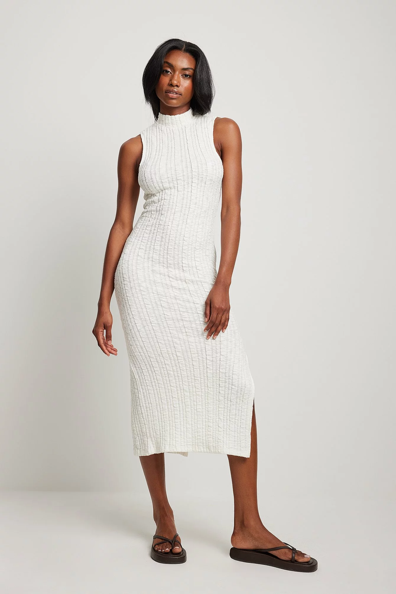 This midi dress is sleeveless and structured and features a high neck and a side split.