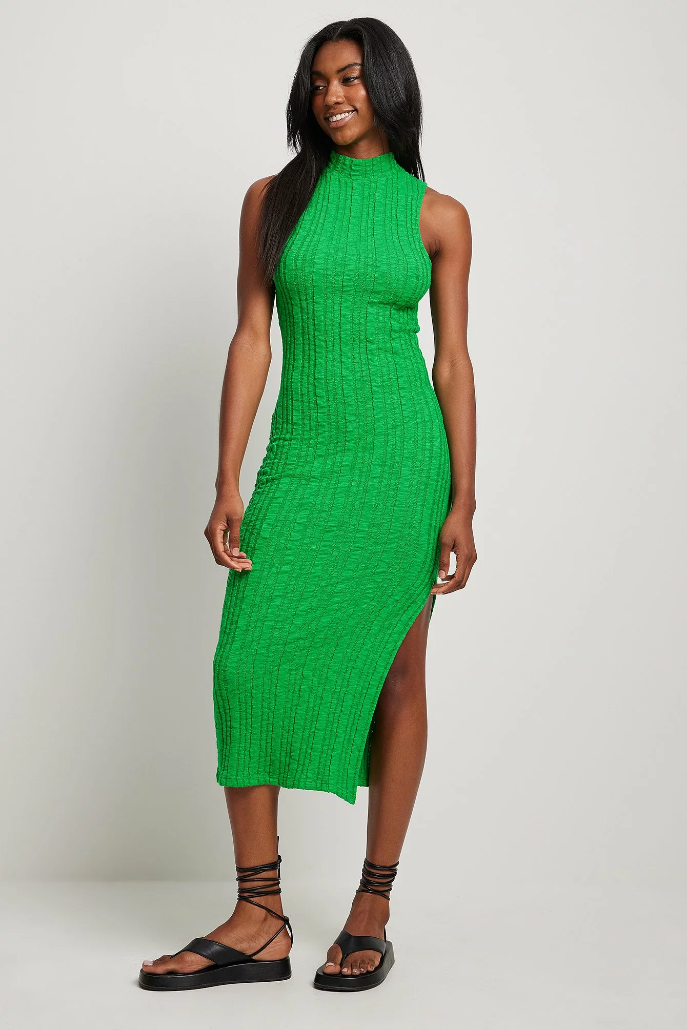 This midi dress is sleeveless and structured and features a high neck and a side split.