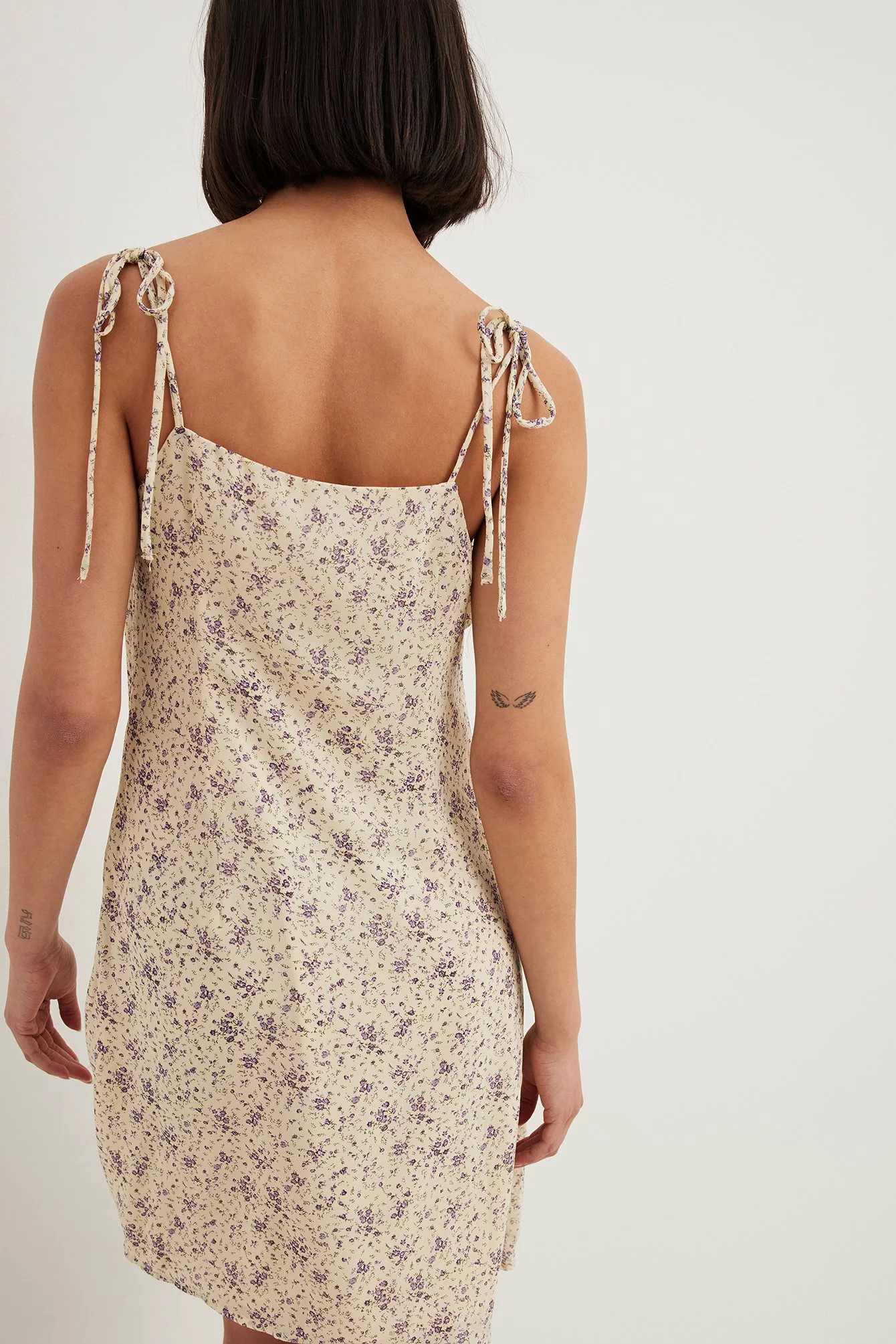 This mini dress features a draped neckline, adjustable shoulder straps, a zipper closure on the side, a flowy fit, a sheer material and underlining.