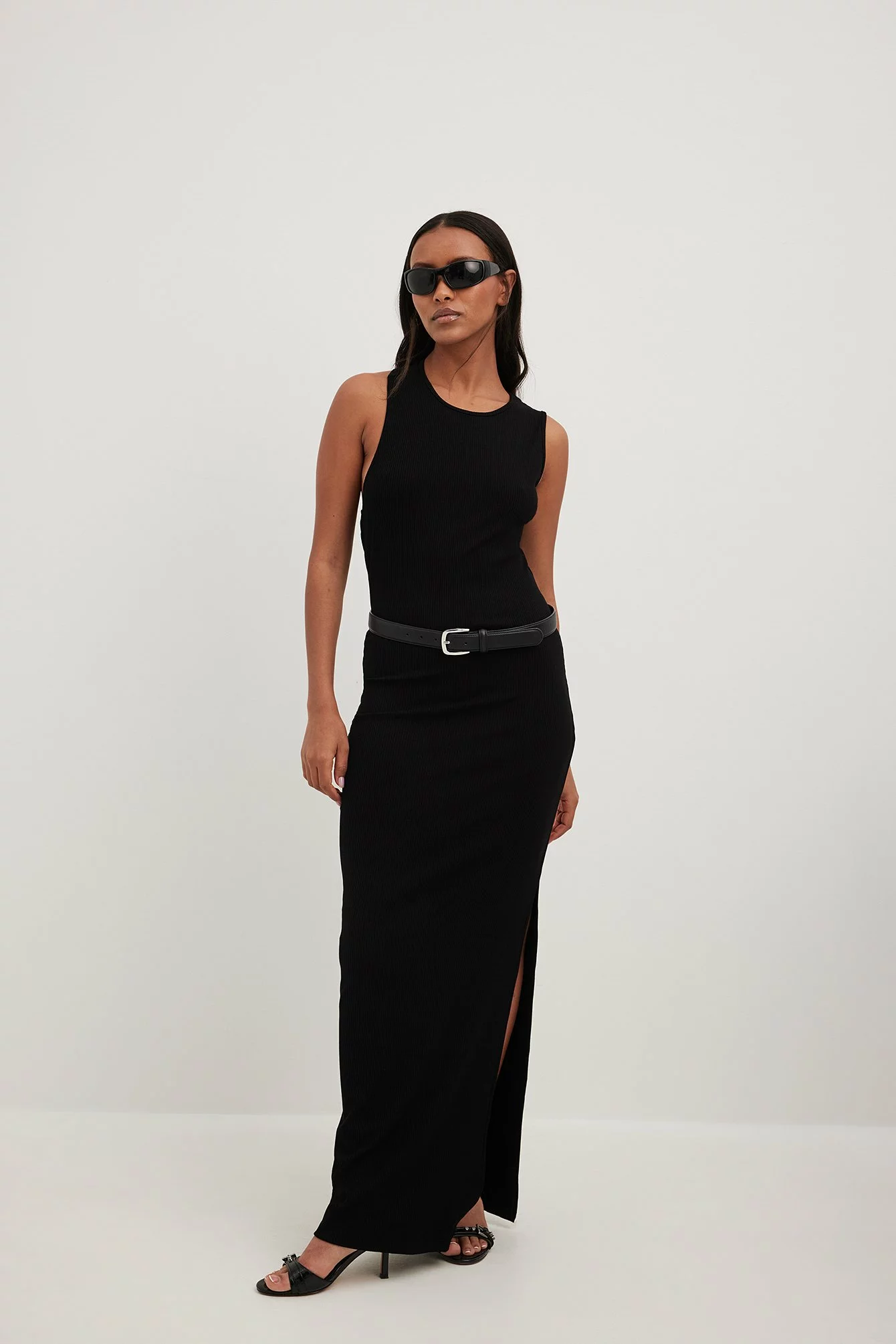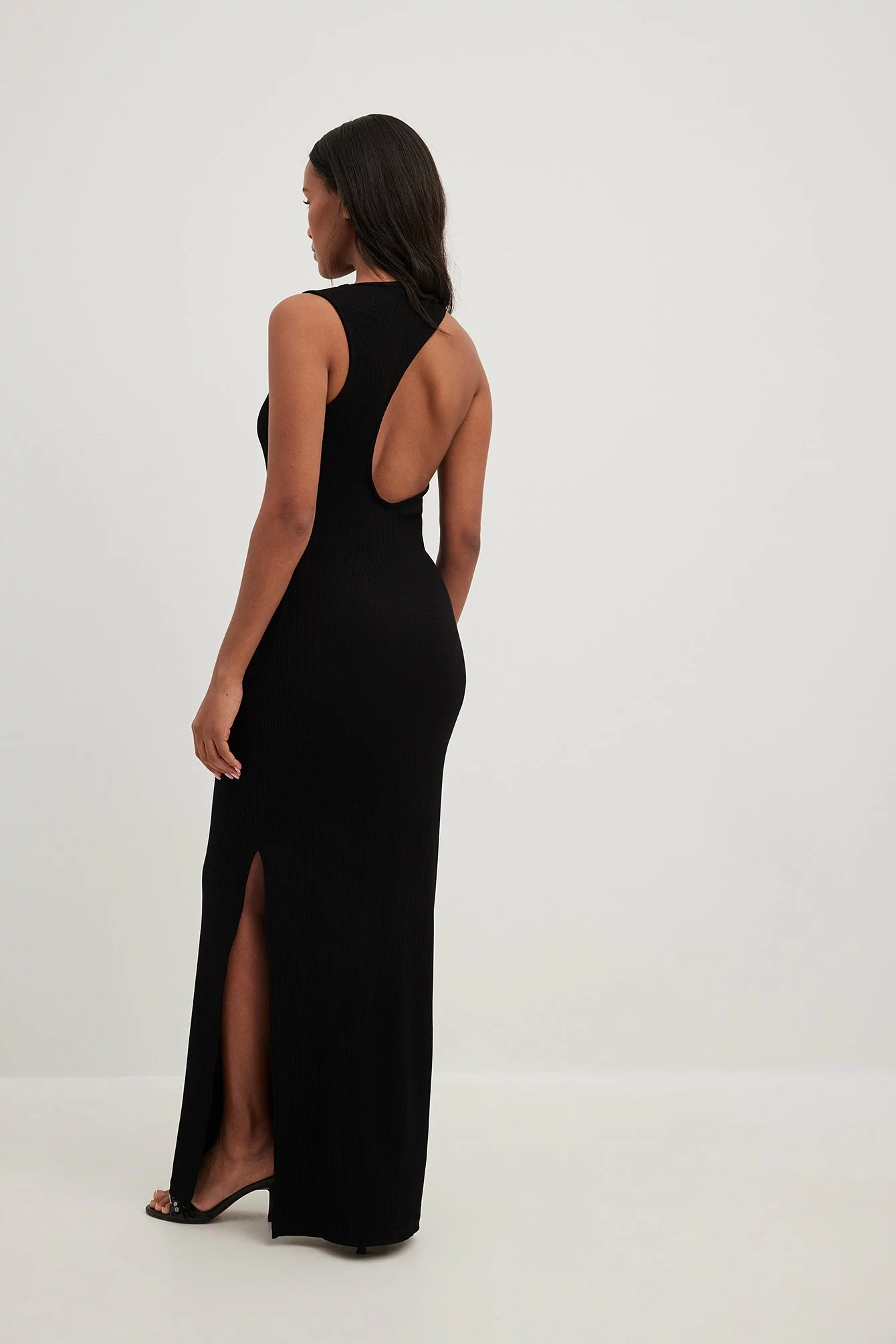 This dress features a stretchy material. It has a bodycon fit and a halterneck design. This dress features a maxi length and a leg opening.