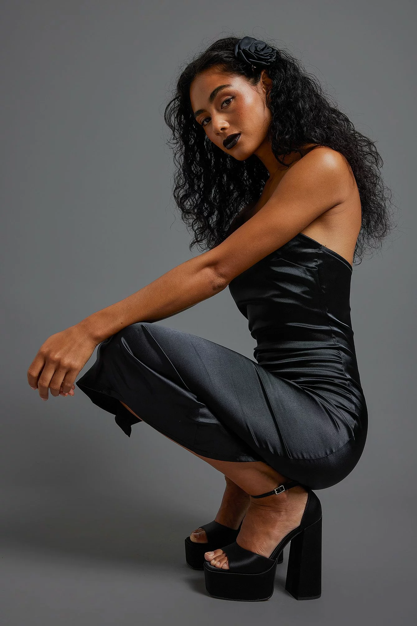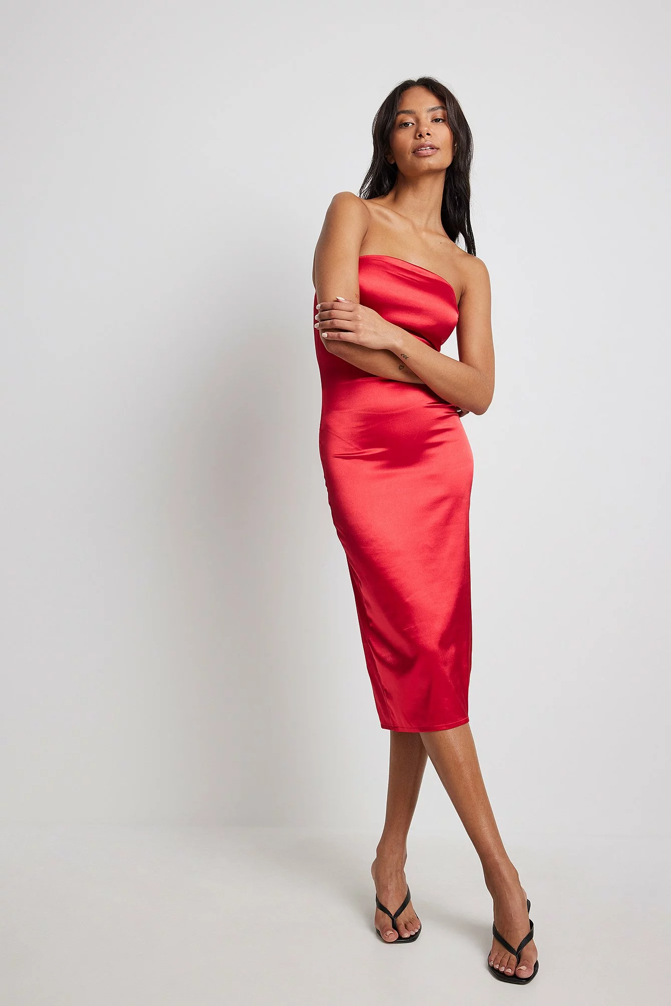 This midi dress features a bandeau design with an inner silicone trim. It has a stretchy, shiny material. Our midi dress features a bodycon fit with a back slit detail.