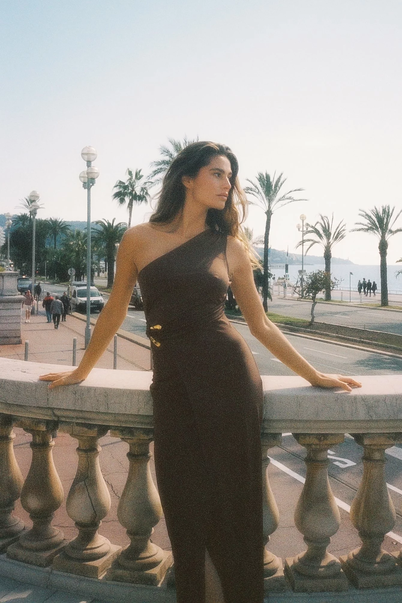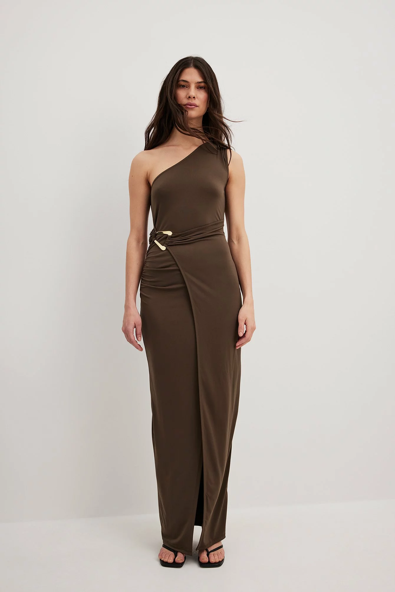 This maxi dress features a one shoulder look. It has a bodycon fit and a wrap design with a buckle detail. This maxi dress features a draped detail on the sides.