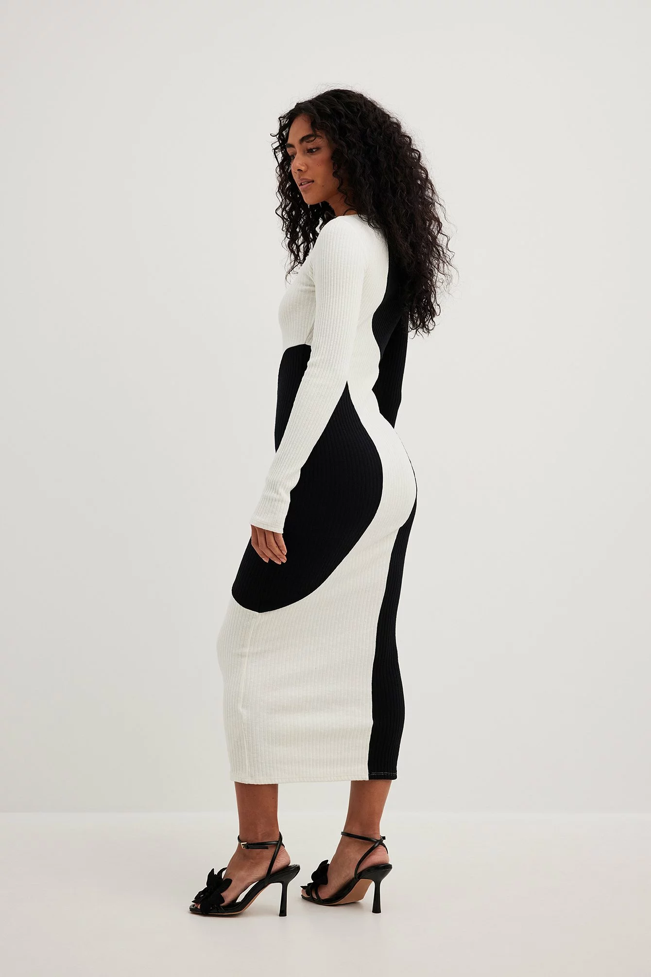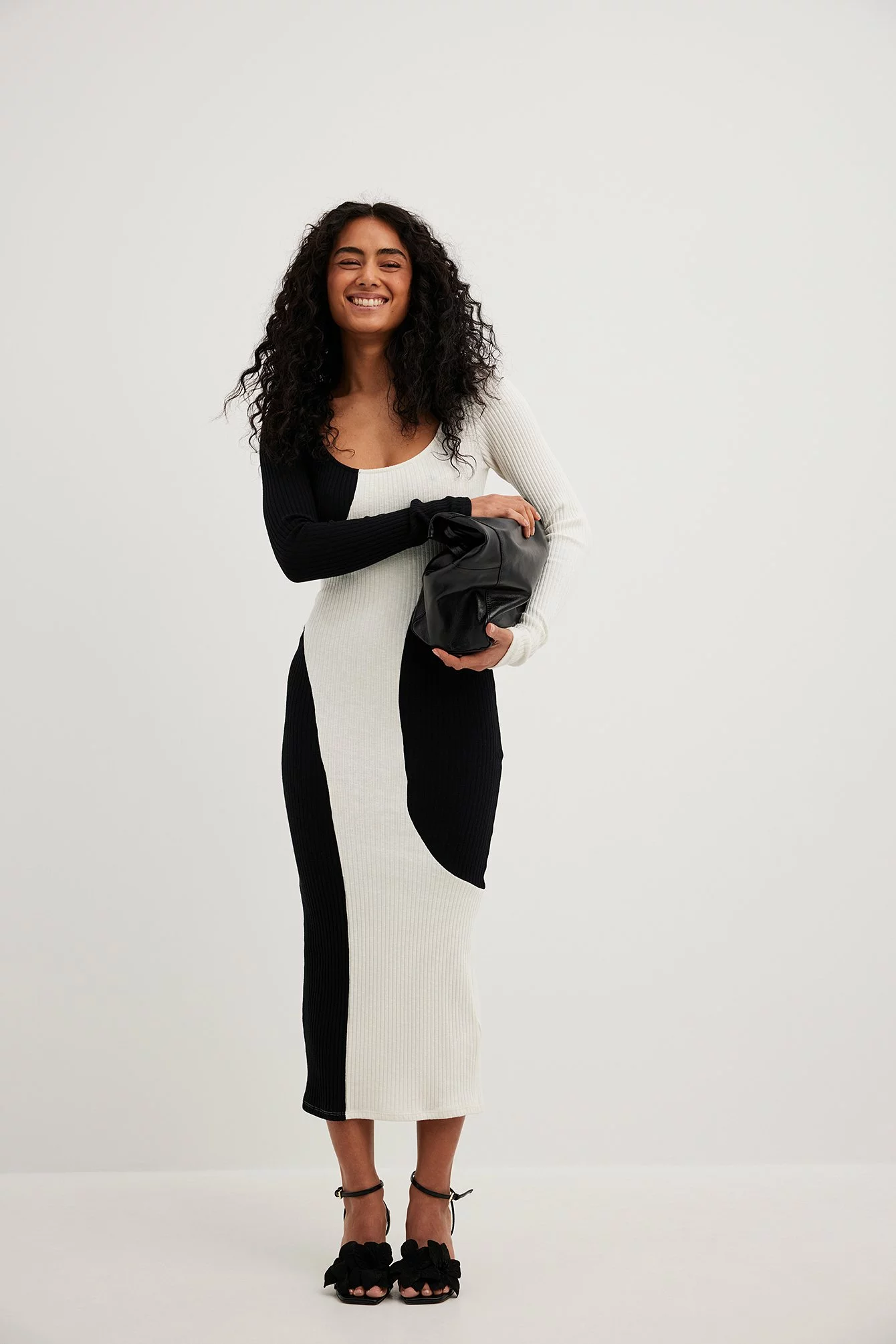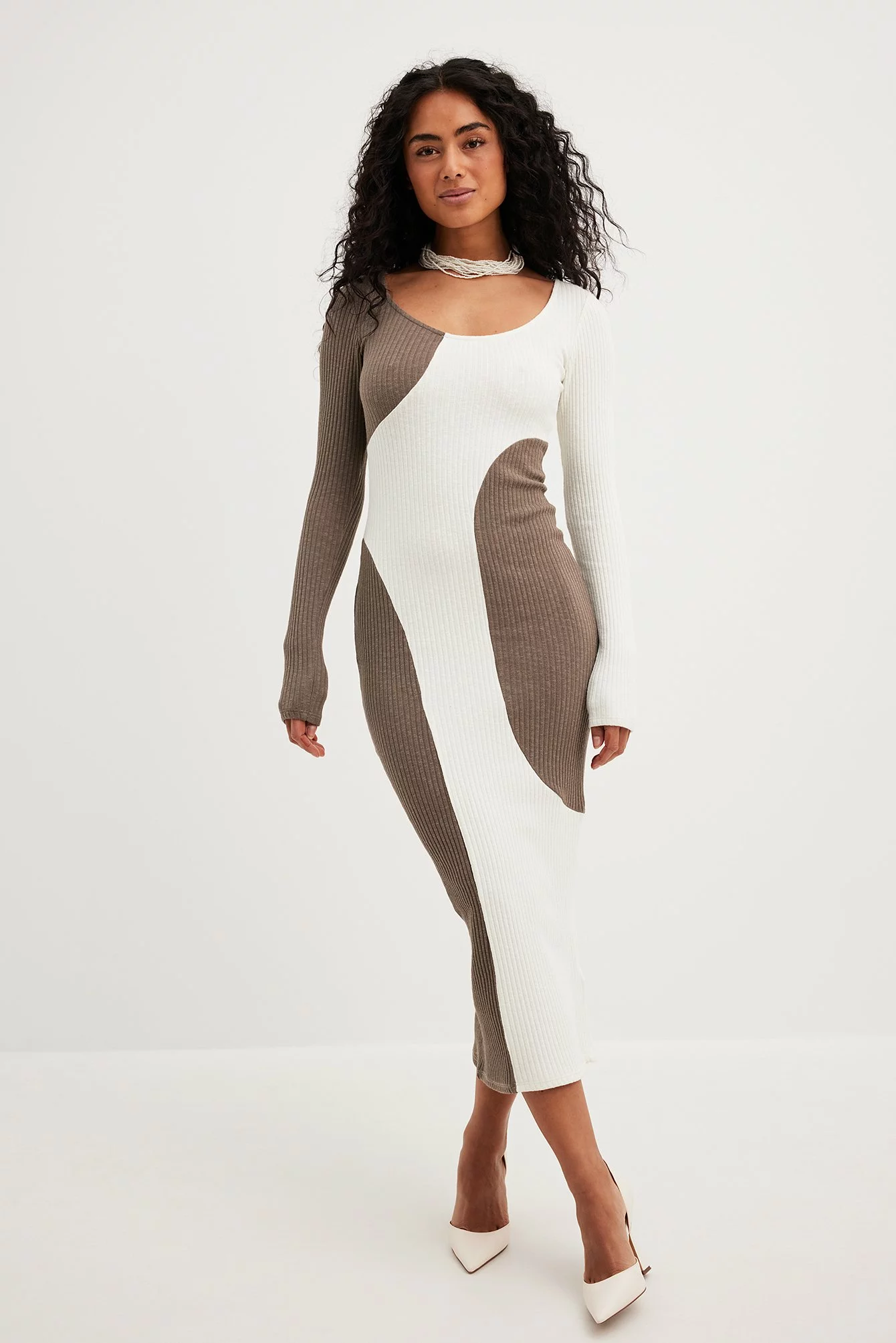 This midi dress features a knit material. It has a stretchy material and a bodycon fit. This midi dress features a rounded neckline and long sleeves.