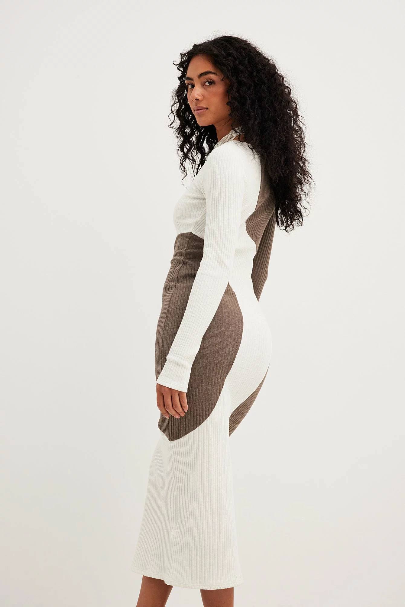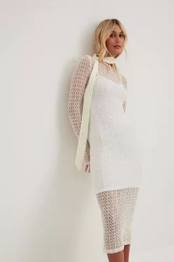 This midi dress features a knit material. It has a stretchy material and a bodycon fit. This midi dress features a rounded neckline and long sleeves.