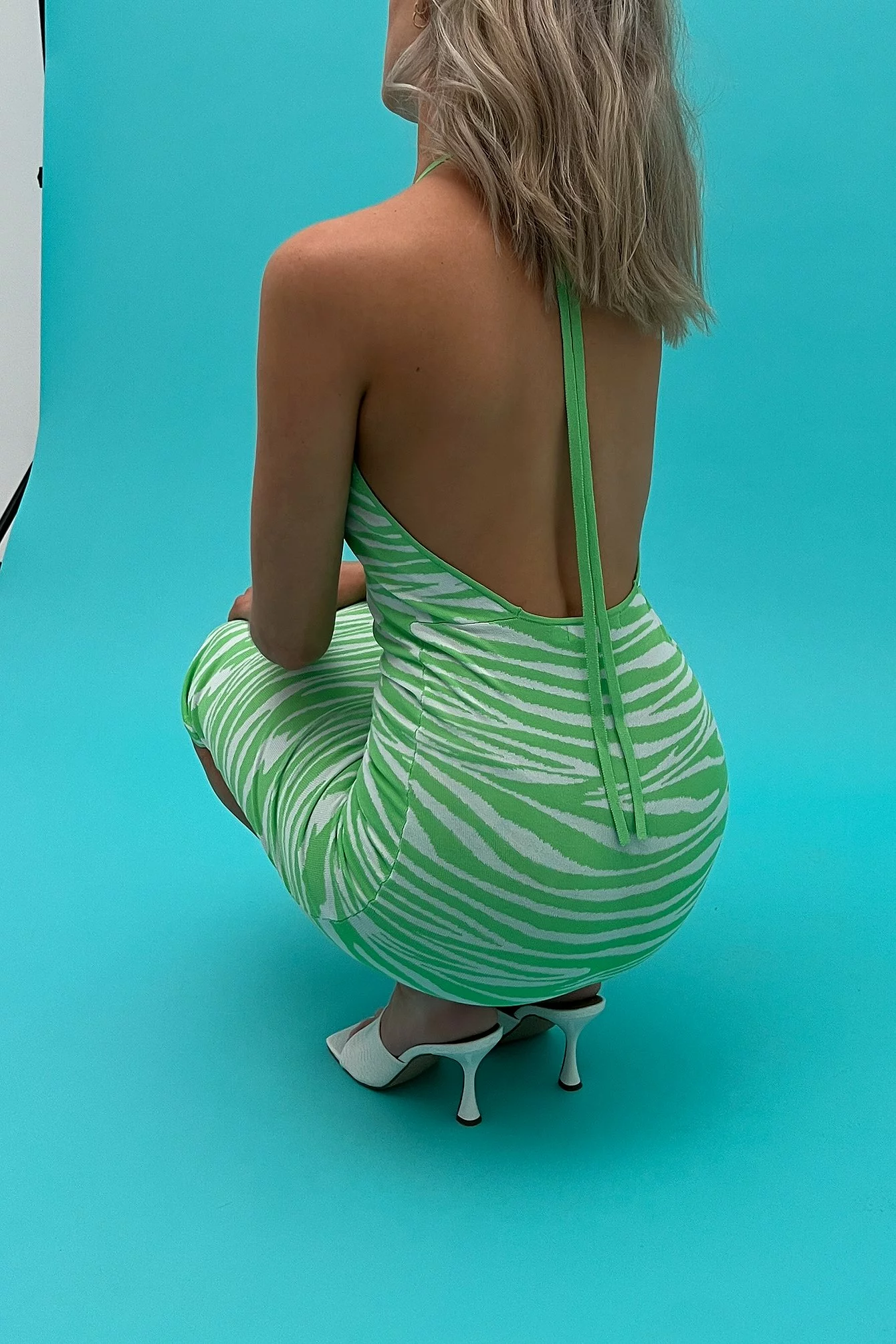 This midi dress features a halterneck tie, a square neckline and an open back design.