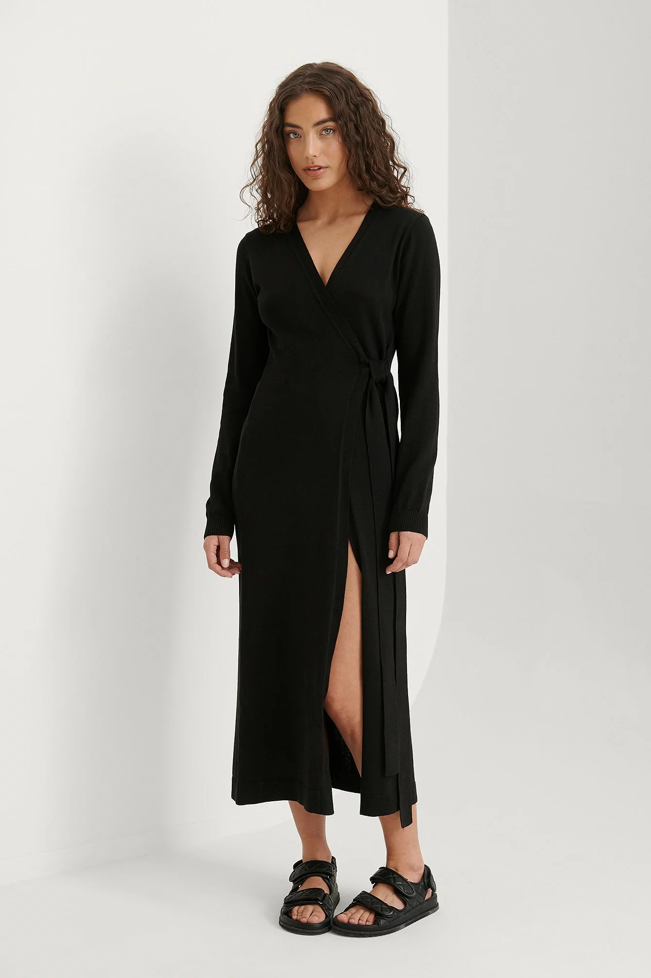 This knit dress features a wrapped V-neck, long sleeves with ribbed, elastic hems, a self tie waist belt on the side, a ribbed bottom hem, a soft material, a midi length and a flowy fit. Look good chilling.