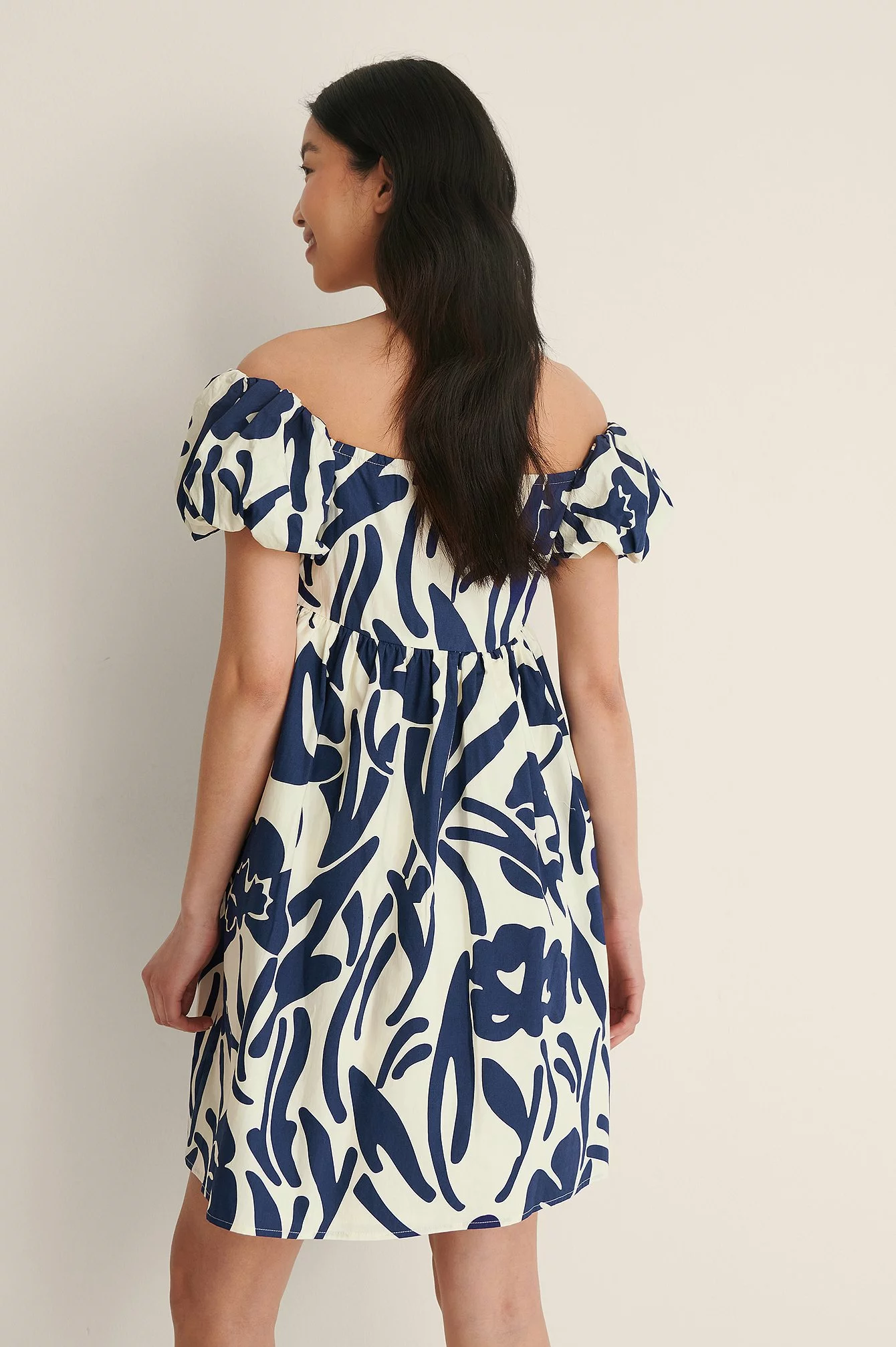 This dress features a heart-shaped neckline with inner silicone trims. It has puffy short sleeves with elasticized cuffs and a ruffle below the bust. This dress features a mini length with underlining.