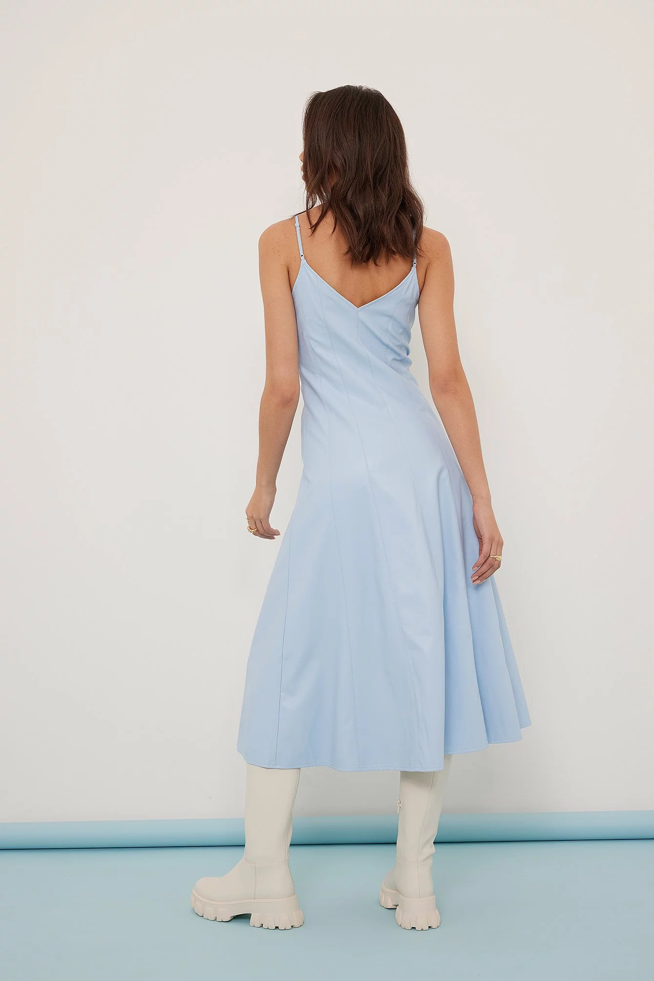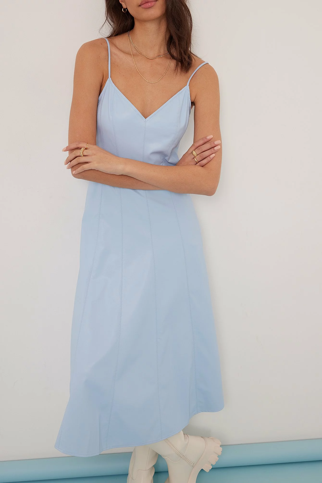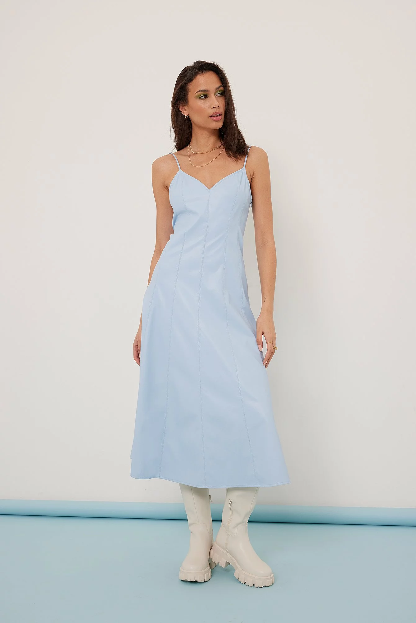 This midi dress features a V-neck, spaghetti straps, a colorblocked pattern, a faux leather material and a flowy fit.