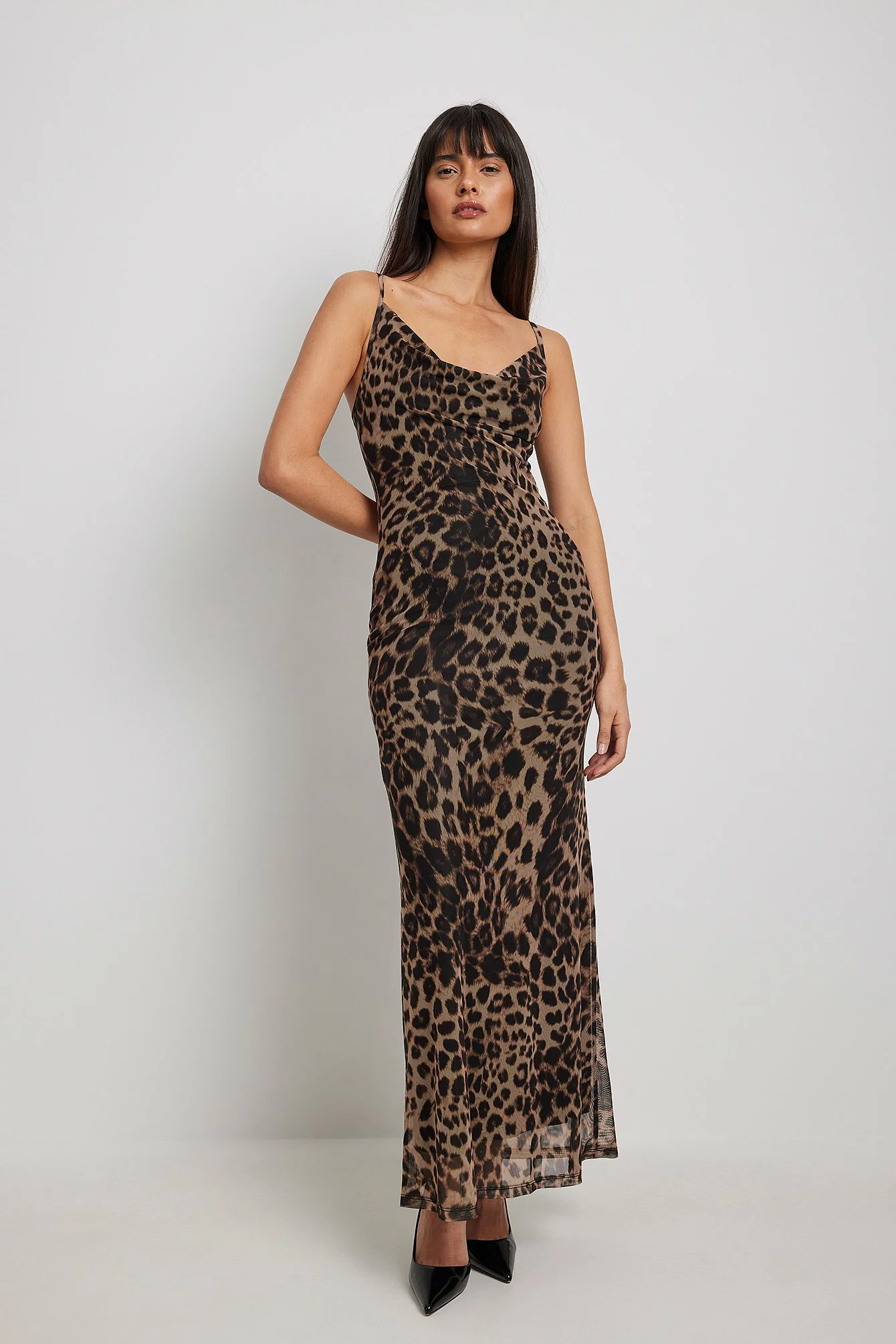 This maxi dress features a mesh design. It has a waterfall neckline and adjustable shoulder straps. This maxi dress features a fabric lining.