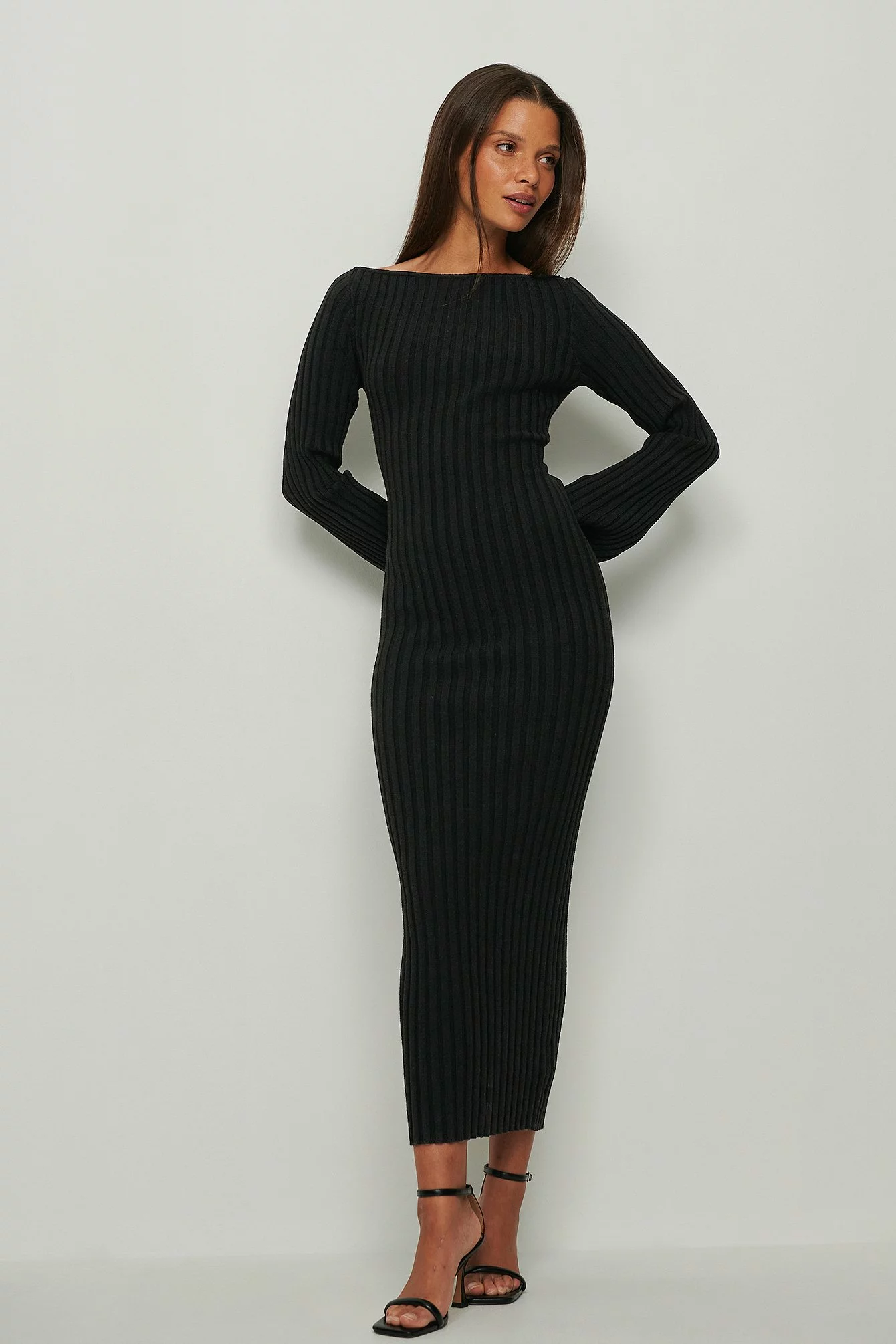 This midi dress features a boat neckline, an open back design, long sleeves and a ribbed knit material.