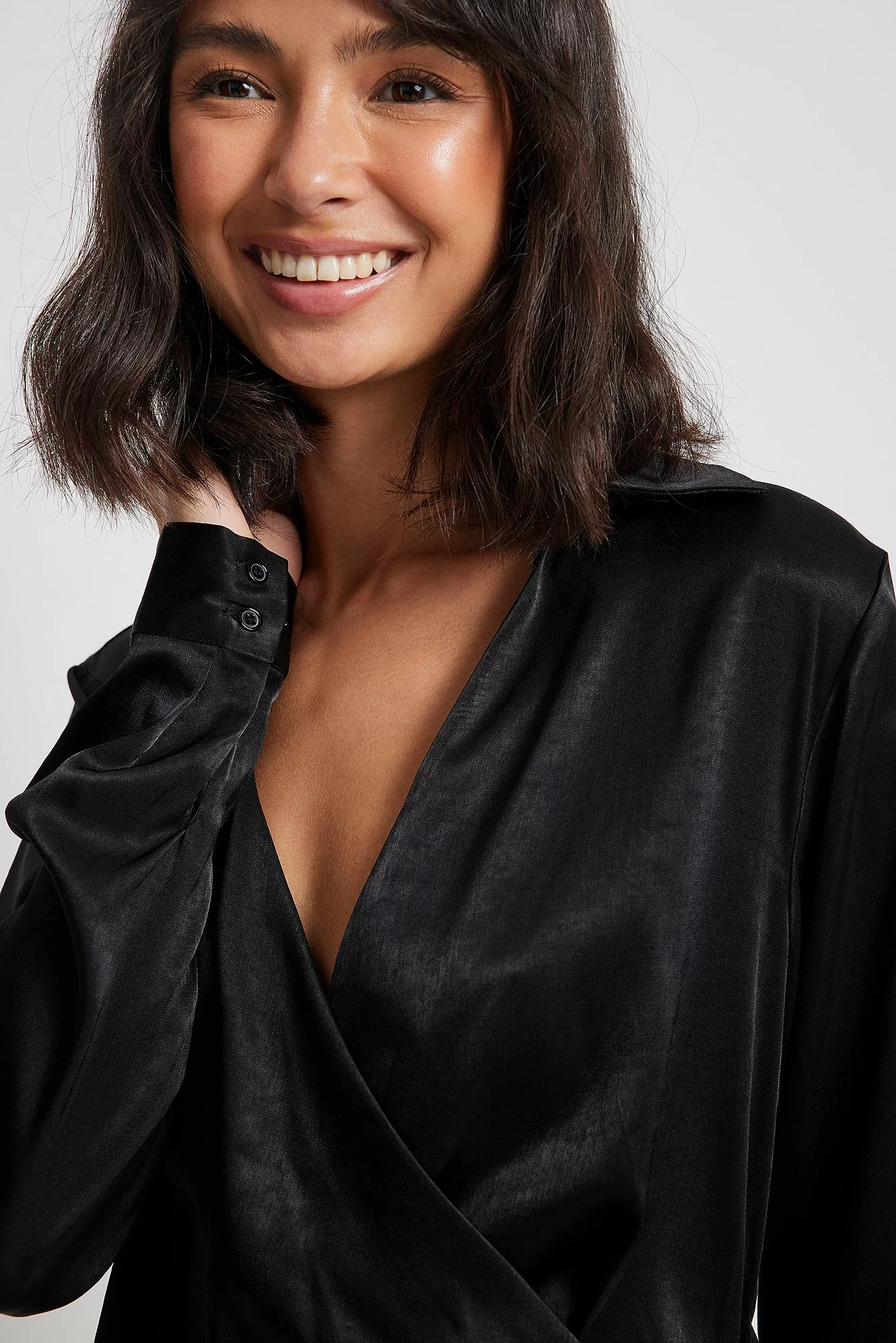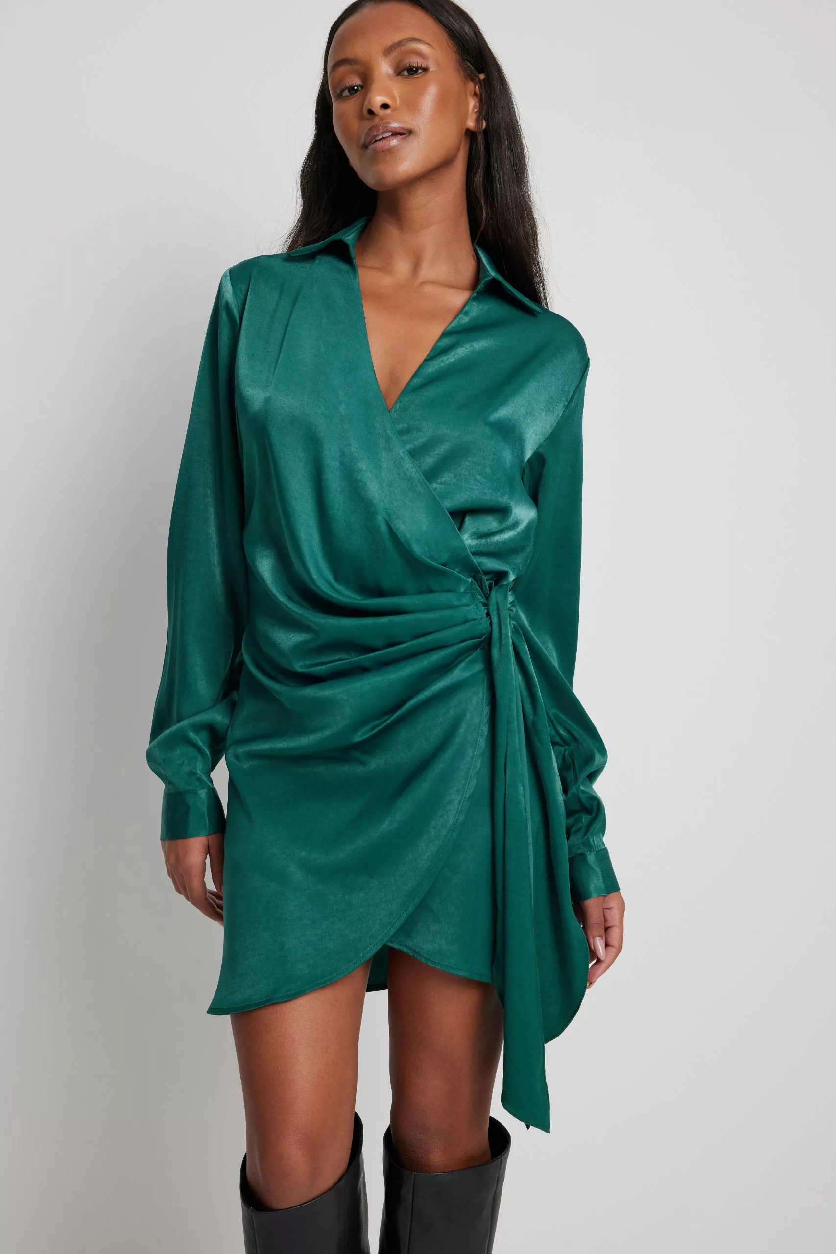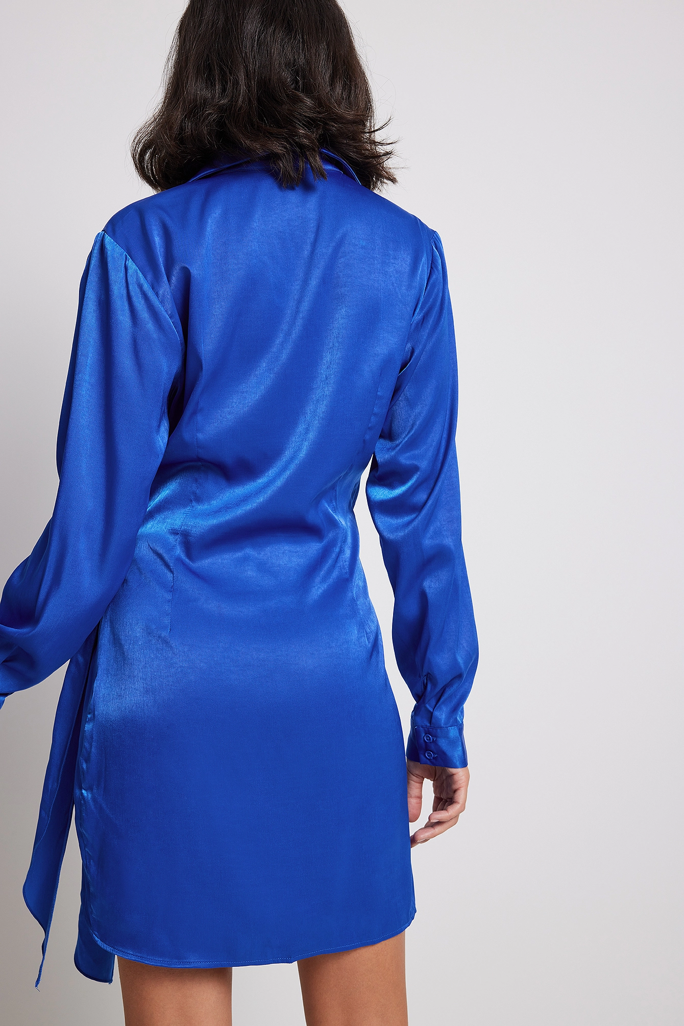 This dress features a collar with a V-neck, a pleated overlap design with an adjustable tie strap, button cuffs, a mini length and a soft silk-like material.