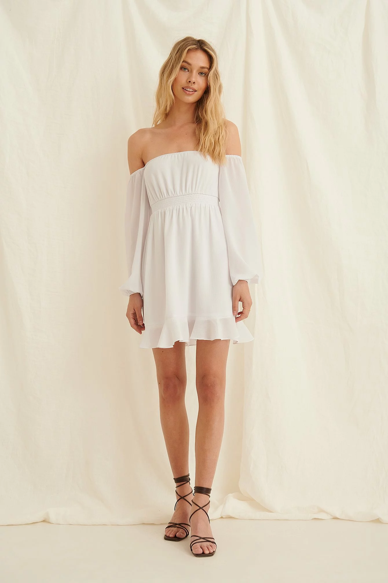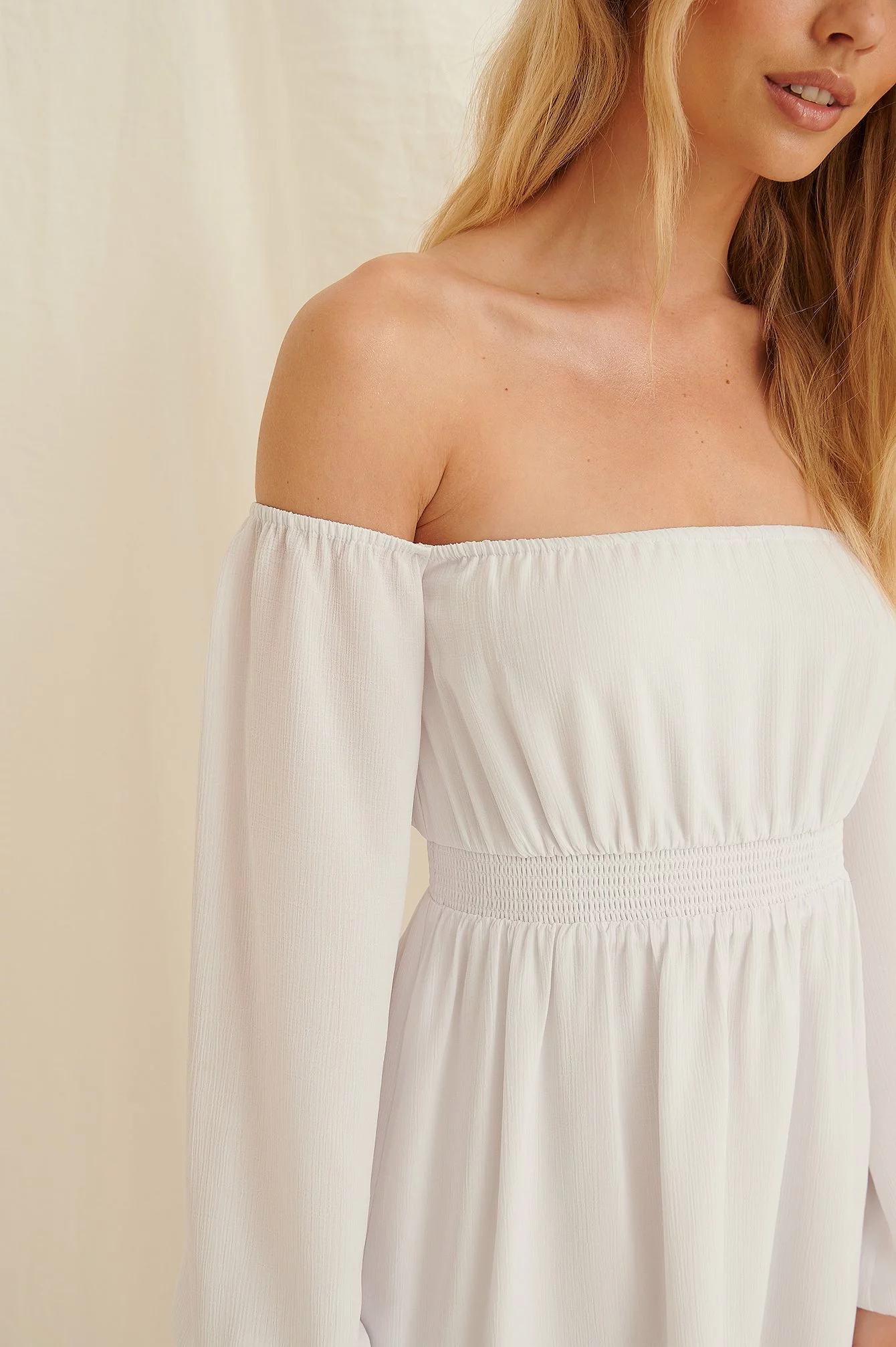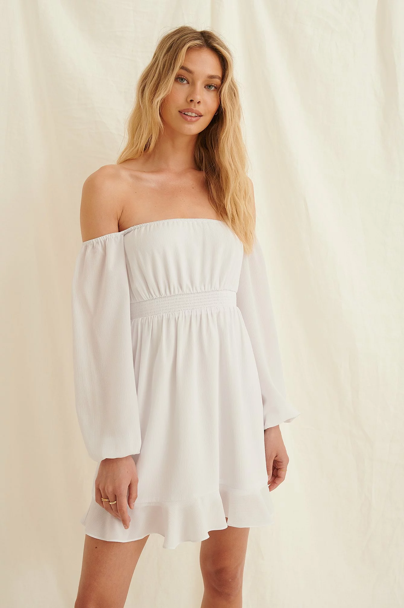 This dress is lined and features an off shoulder design, balloon sleeves with elasticated bands at the shoulder and on the cuffs, an elasticized waistband and a flowy fit.
