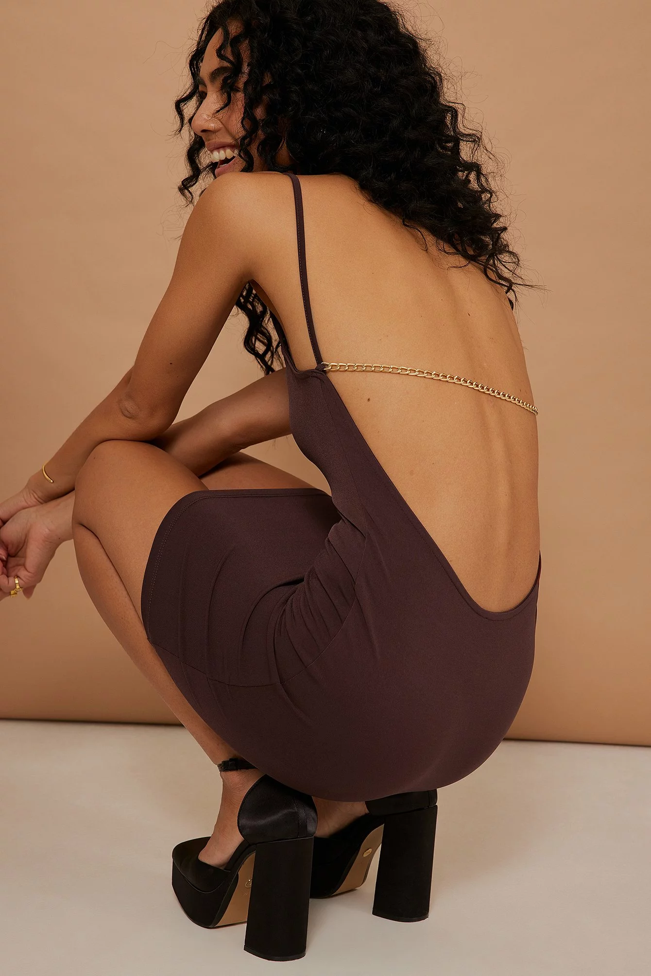 This mini dress features thin shoulder straps and an open back with a chain detail. The ultimate going-out piece.