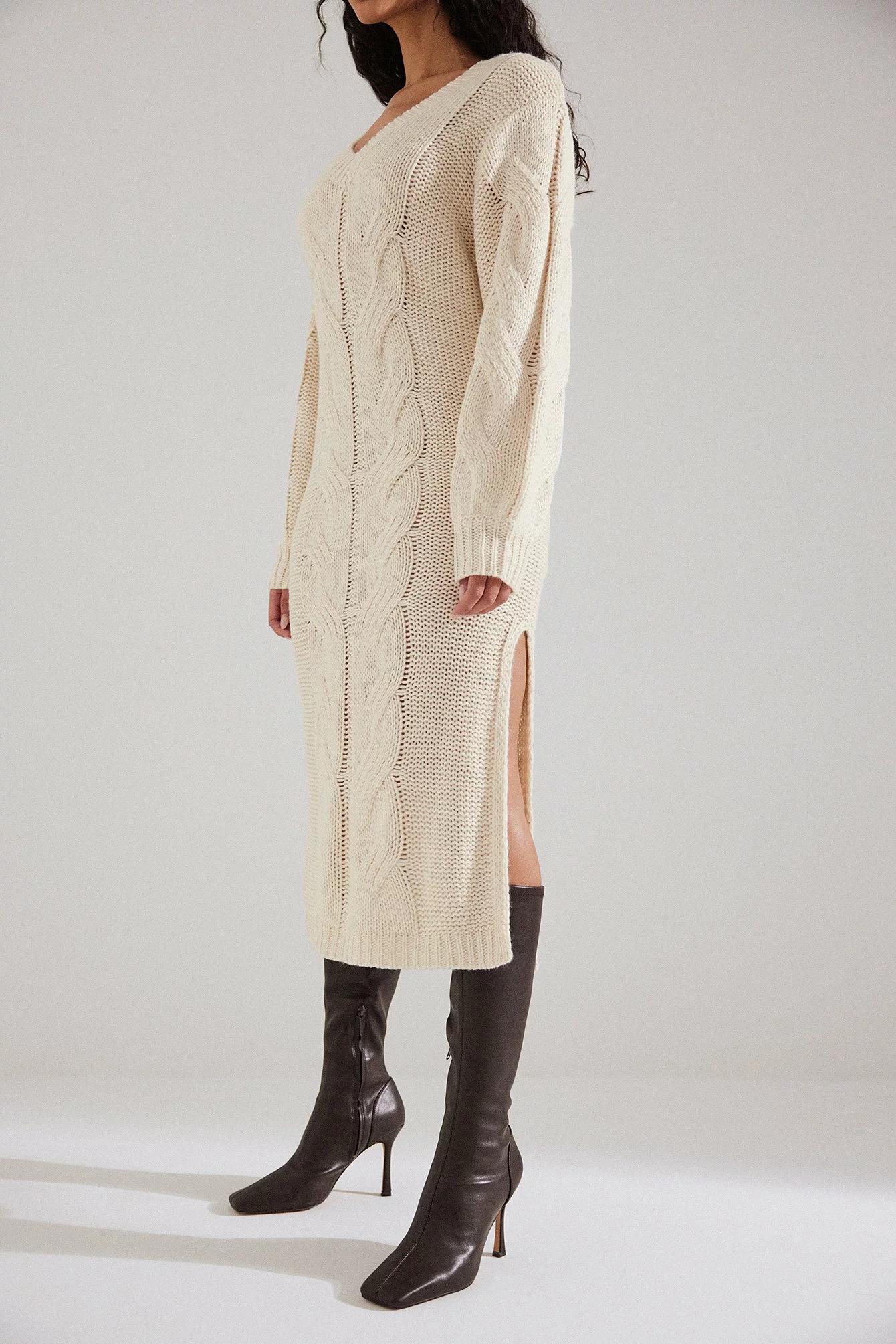 This midi dress is knitted and features an oversized fit. It has a v-neck cut and ribbed cuffs. This midi dress features a slit detail on the sides.