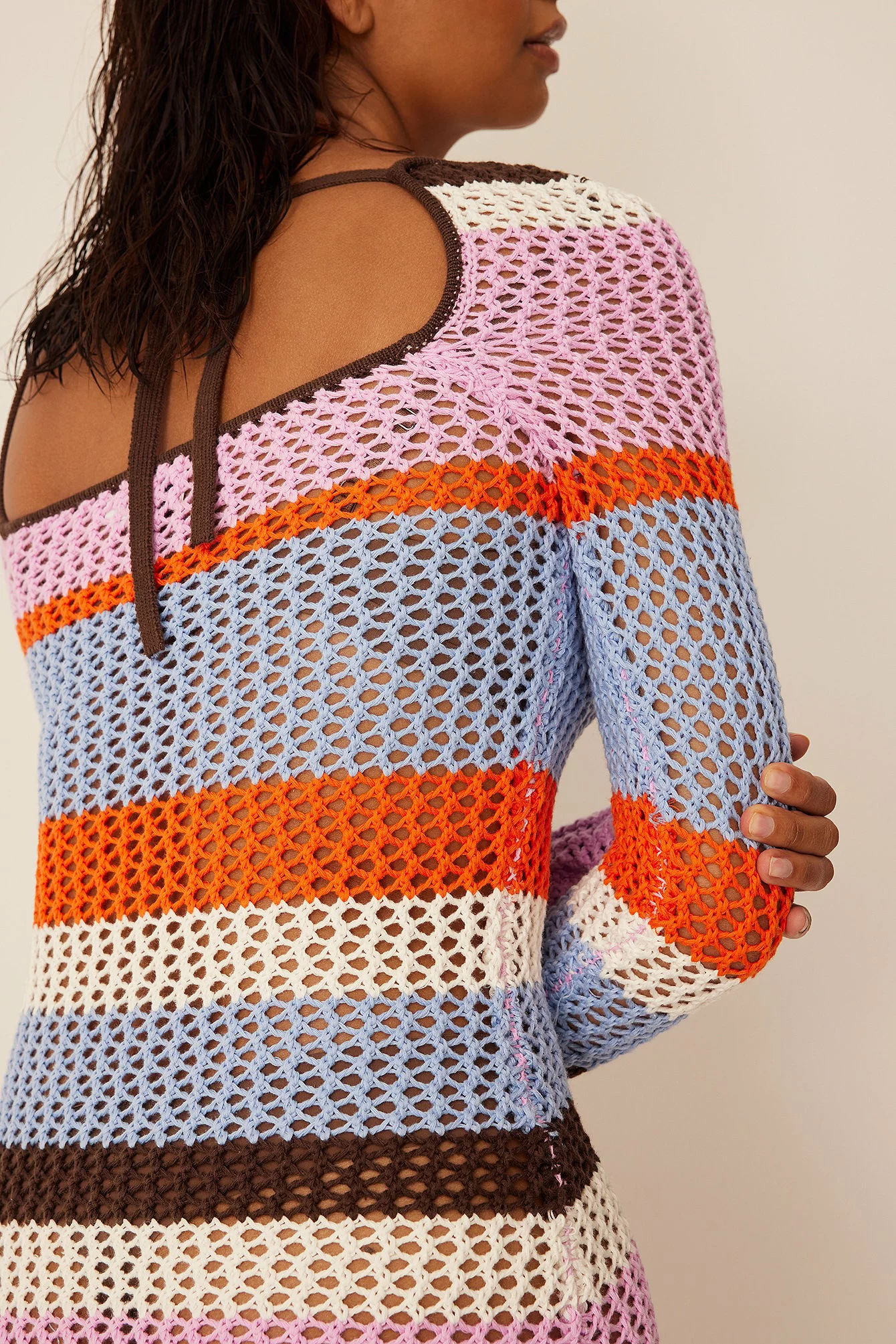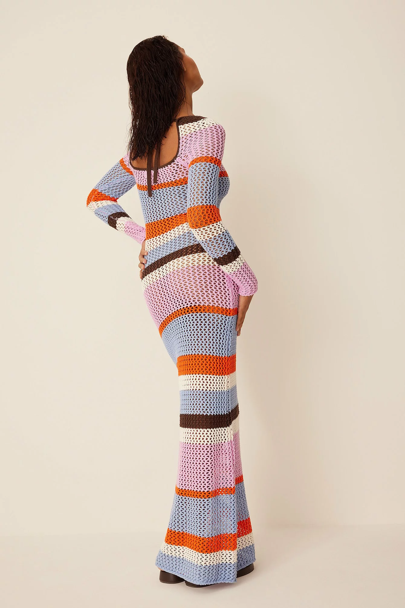 This maxi dress features a crocheted knitted design, a round neckline, long sleeves and a self-tie band at the back.