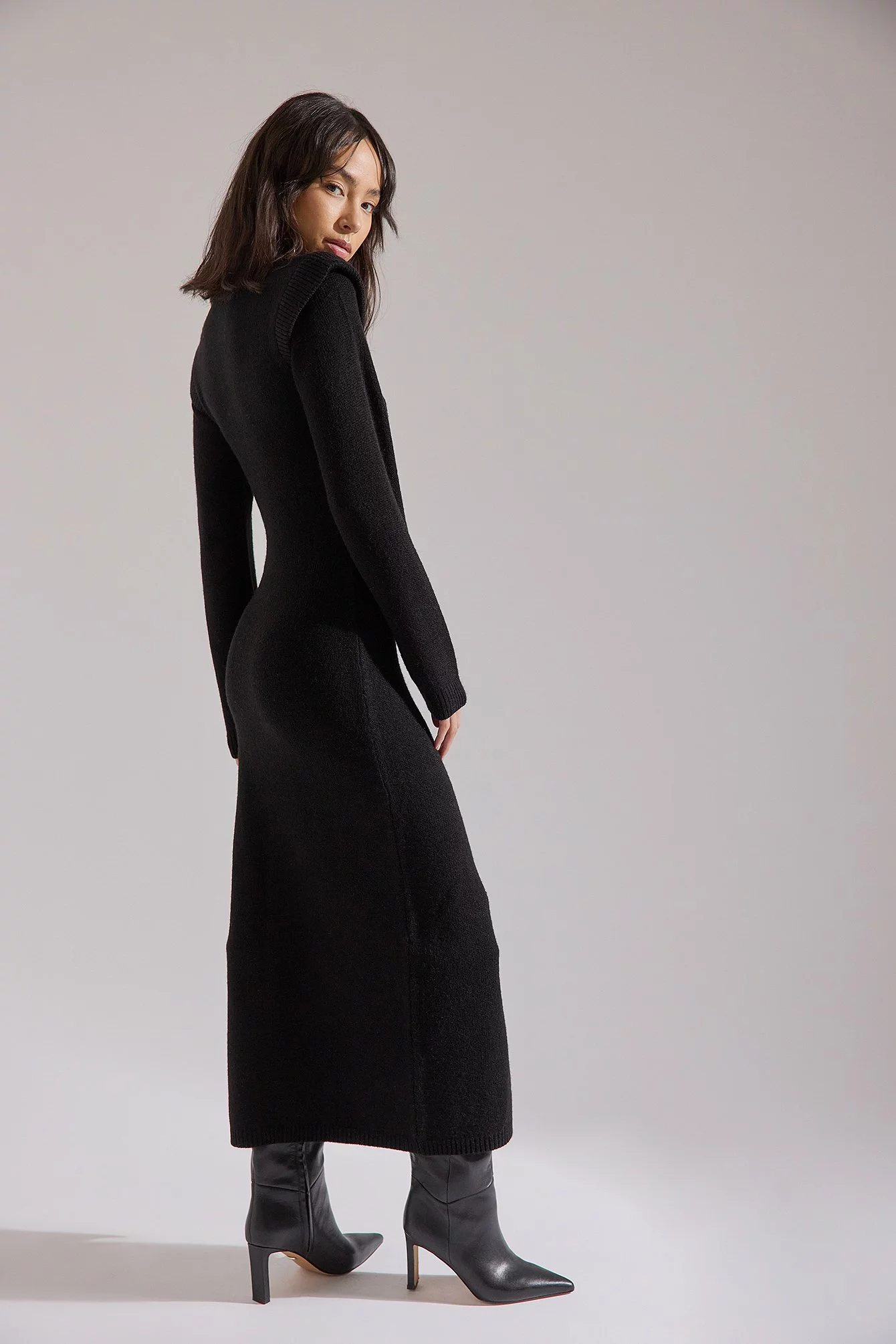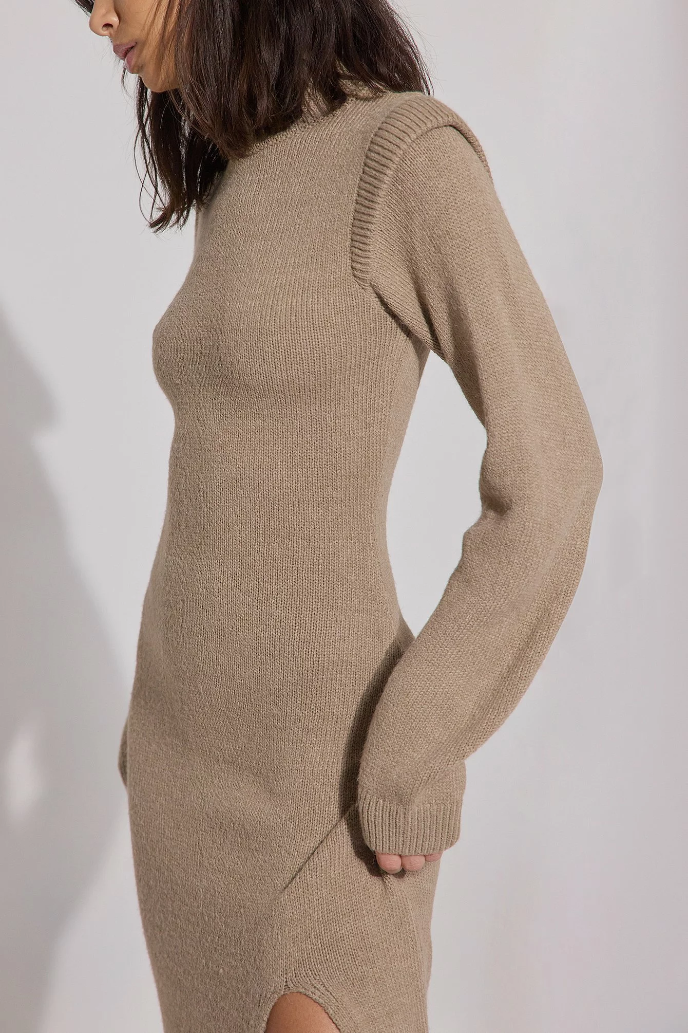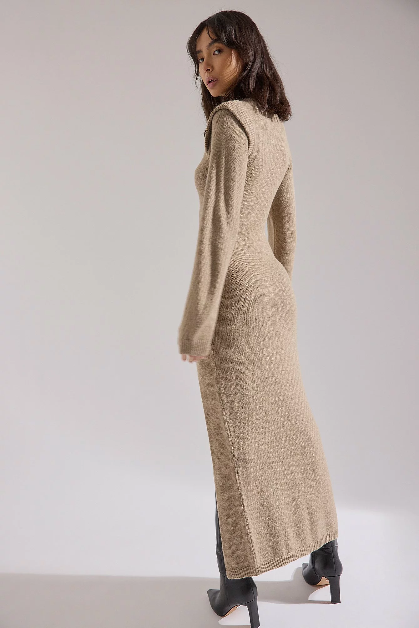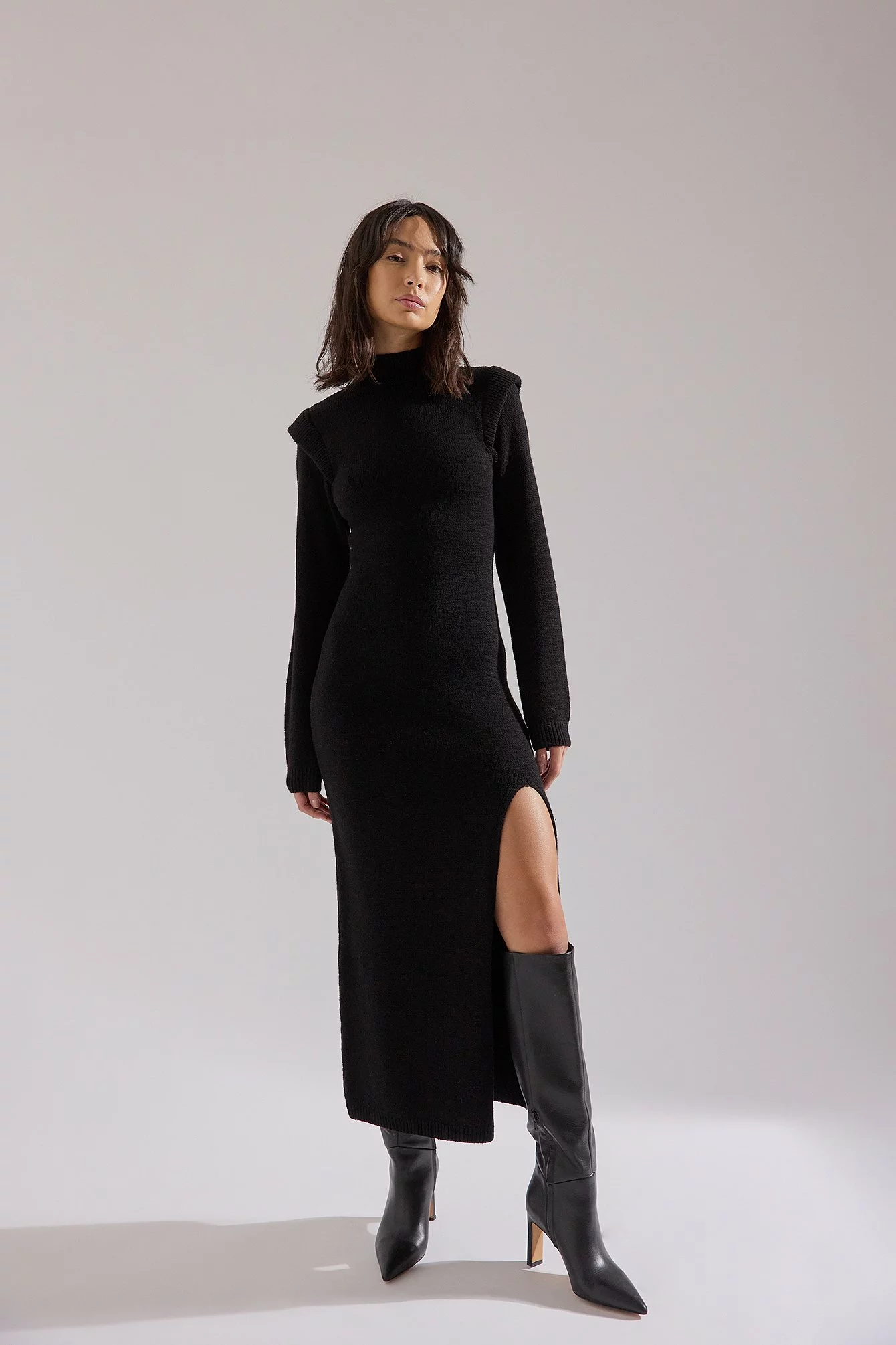 This maxi dress is knitted and stretchy and features a high neck. It has shoulder details and long sleeves. This maxi dress features a side slit.