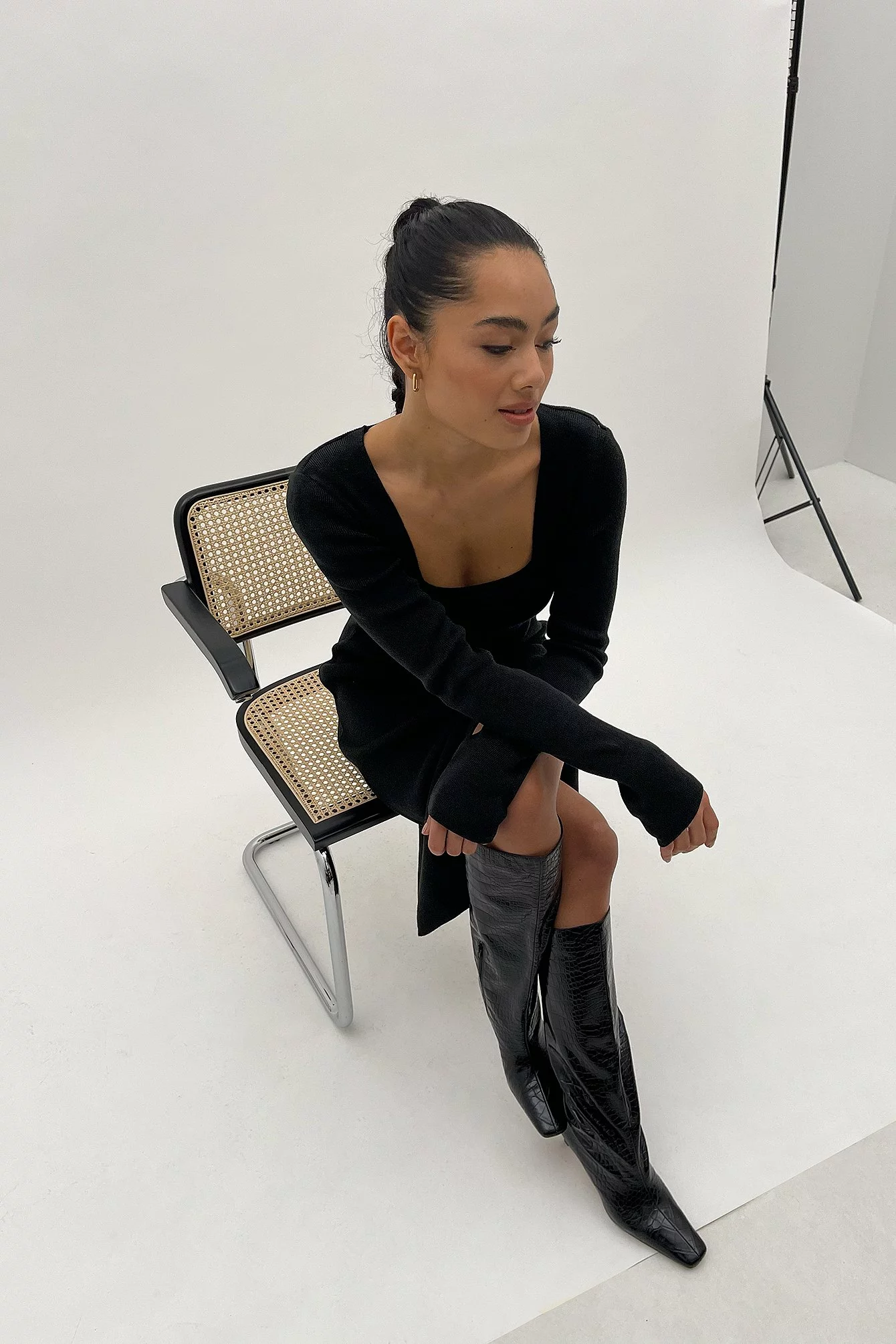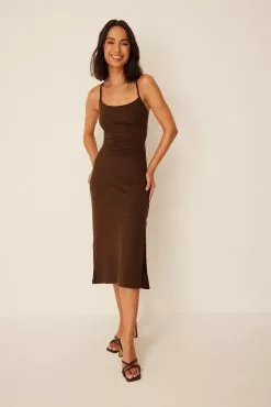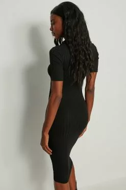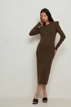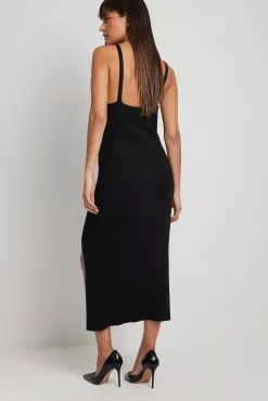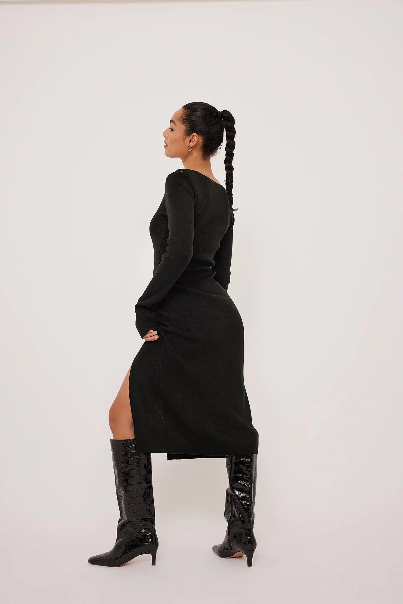 This maxi dress features a sweetheart neckline, slightly padded shoulders, long sleeves with slit details at the cuffs, a side slit and a stretchy, knitted material.