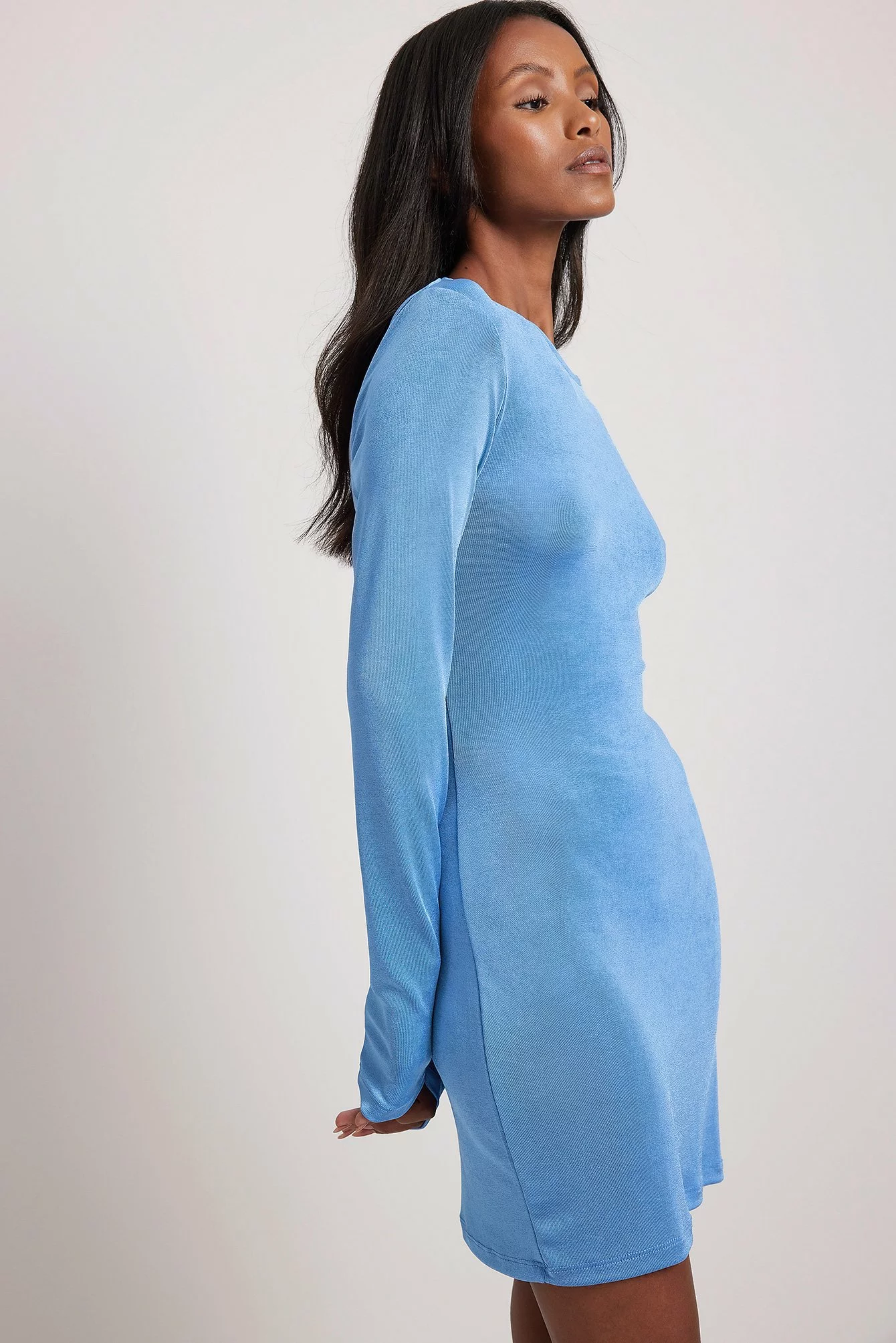 This mini dress features a crew neck, long sleeves and an asymmetrical open back design with a self tie detail.